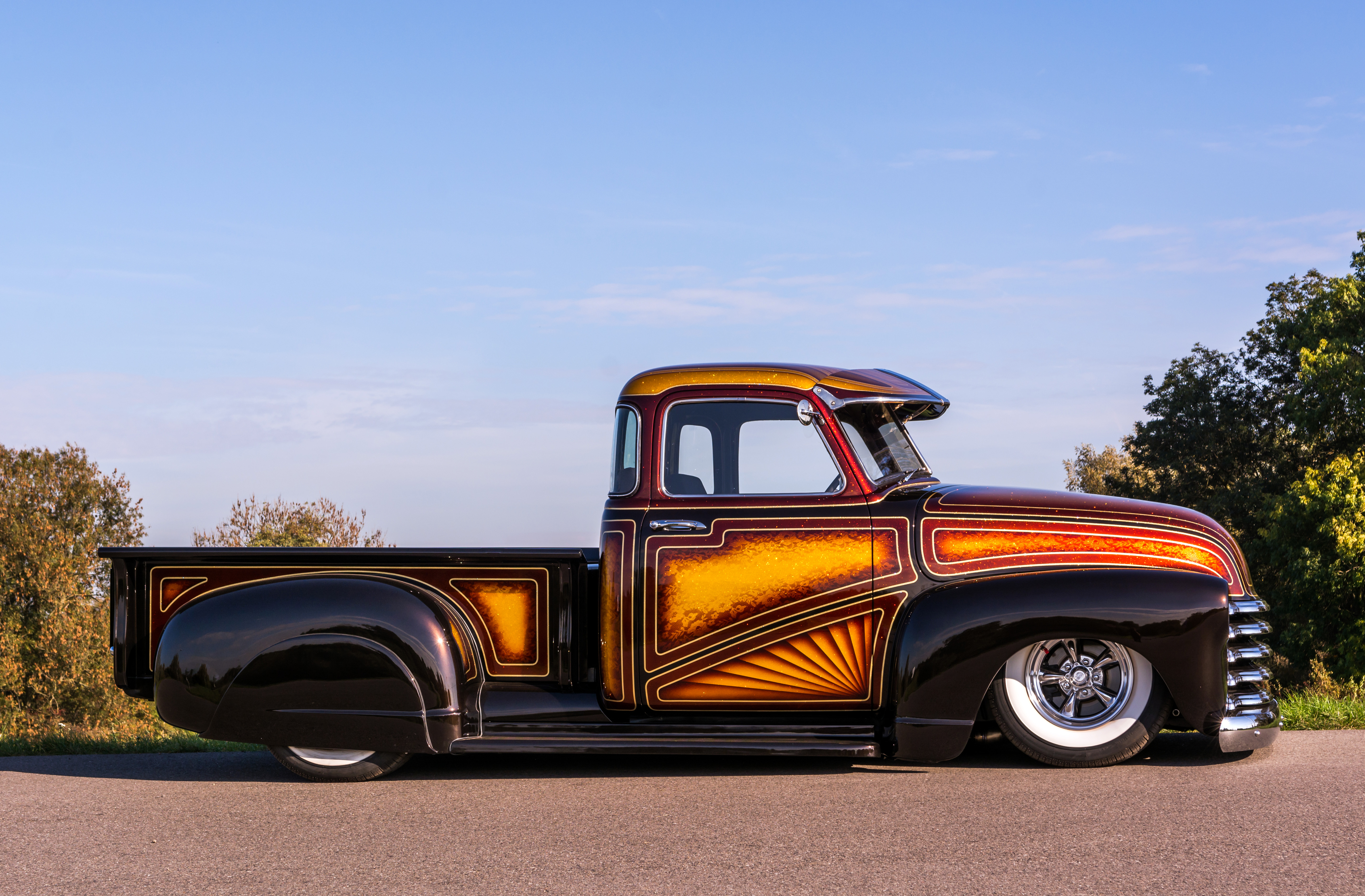 Tyylikkäästi toteutettu ohjaamon nahkaverhoilu ja Vintage Air -ilmastointi. Korista poistettu pisaraurat, tuulilasin päälle lisätty Gangsterilippa, Rollpan-takahelma kustomhenkisin takavaloin, takalokasuojissa itsetehdyt Fenderskirtsit. Vanteina edessä ja takana 15-tuumaiset American Racing vanteet 235/75-15 valkosivurenkain.
