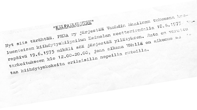 Yhdistyksen 30-vuotisjuhlan tiimoilta tehdyssä FHRA History 1972-2002 -TV-sarjassa muistellaan kiihdytysajotoiminnan aloittamista kotimaassa.    Kolmiosaisen sarjan ensimmäinen jakso on katsottavissa alta. [Klikkaa ja lue lisää]