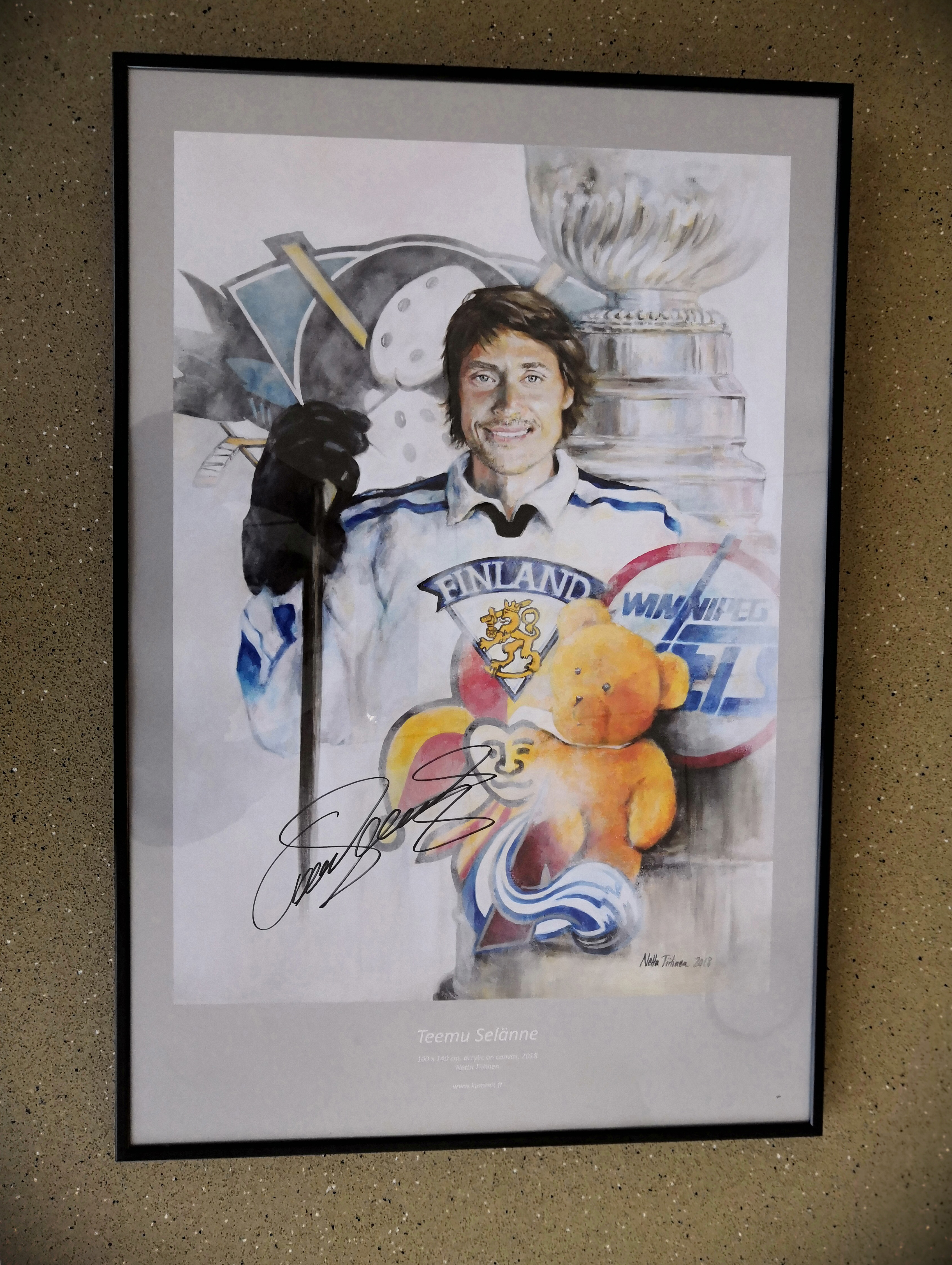 Teemu ja Nalle -taulu on kopio Netta Tiitisen akryylimaalauksesta. Taulussa Teemu Selänteen nimikirjoitus!