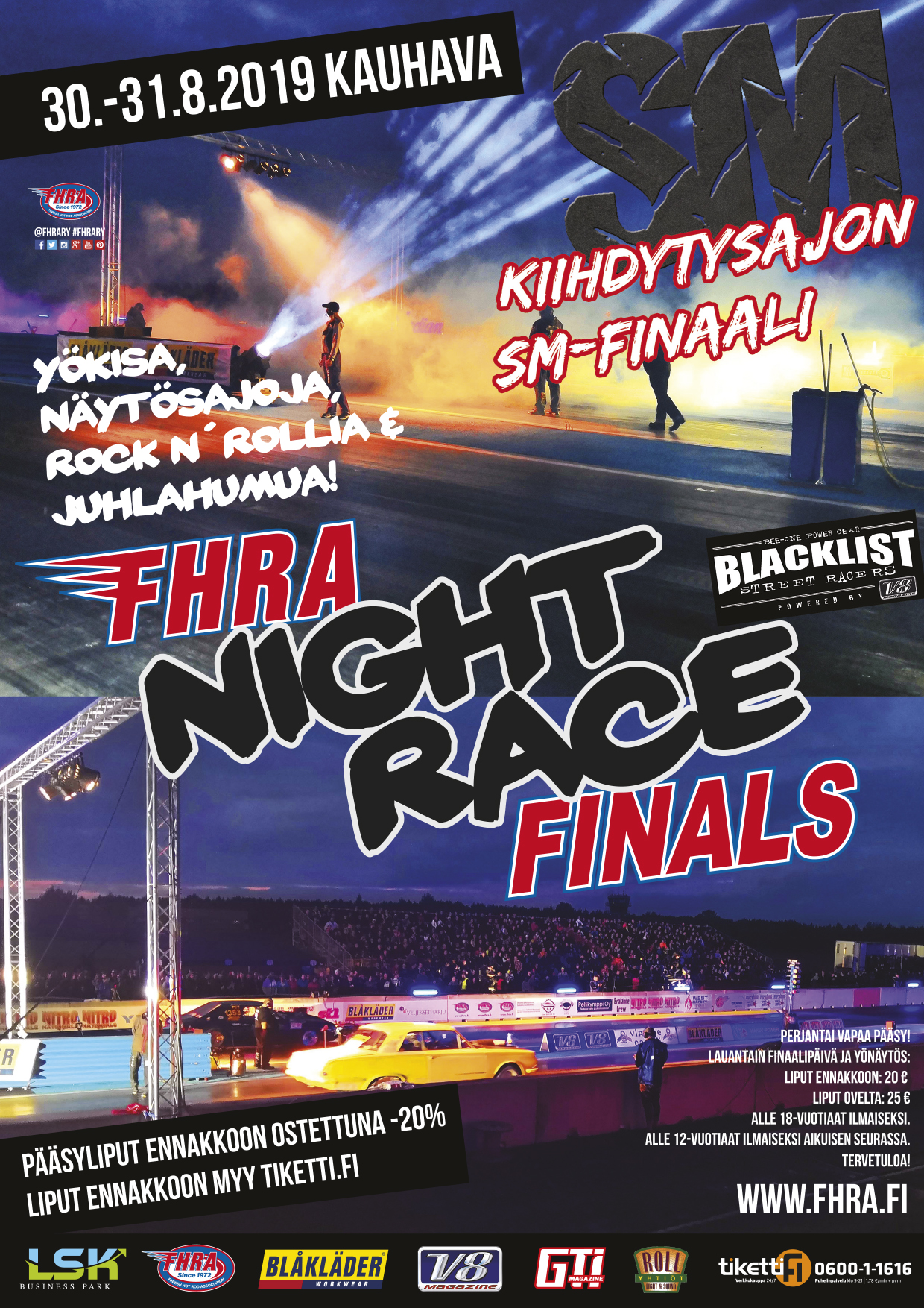 FHRA Night Race Finals finaalissa ajetaan Top Doorslammer –ryhmän SM- ja EDRS Pro- finaalit ja Super Twin Bike -ryhmän kerrasta poikki SM-kisa! Osallistumismaksut jaetaan sijoittuneiden kesken seuraavasti: