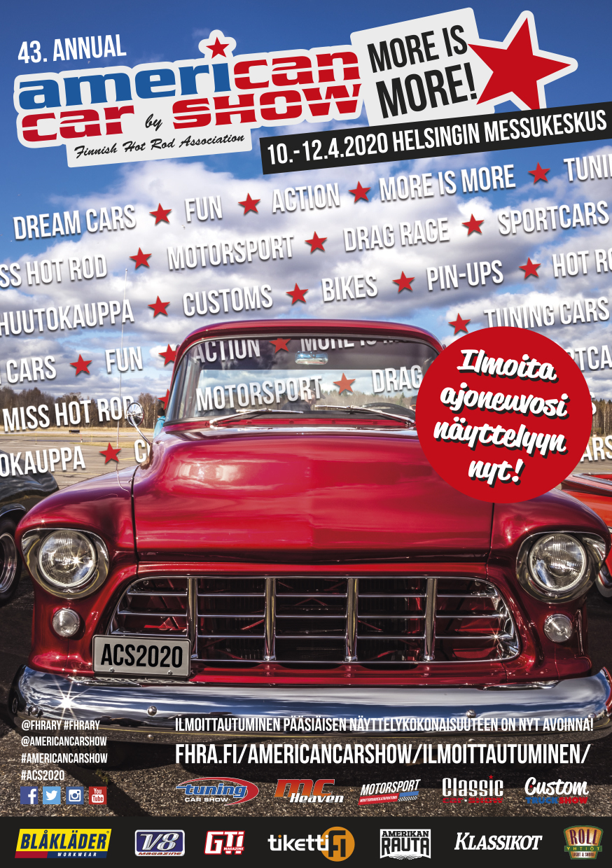 American Car Show, Tuning Car Show, Classic Car Show, Custom Truck Show, MC Heaven & Motorsport 2020 näyttelykokonaisuuden suunnittelu ja myynti on jo aloitettu ja avasimme ilmoittautumisen tapahtumaan! 43. näyttely järjestetään tulevana pääsiäisenä 10.-12.4.2020 Helsingin Messukeskuksessa. Tuleva näyttelykokonaisuus järjestetään viime vuoden tapaan kolmipäiväisenä.