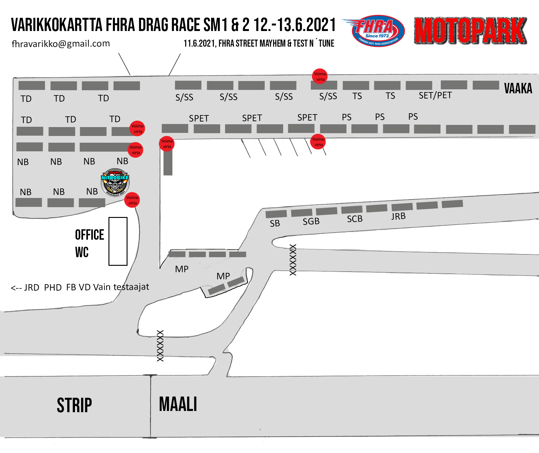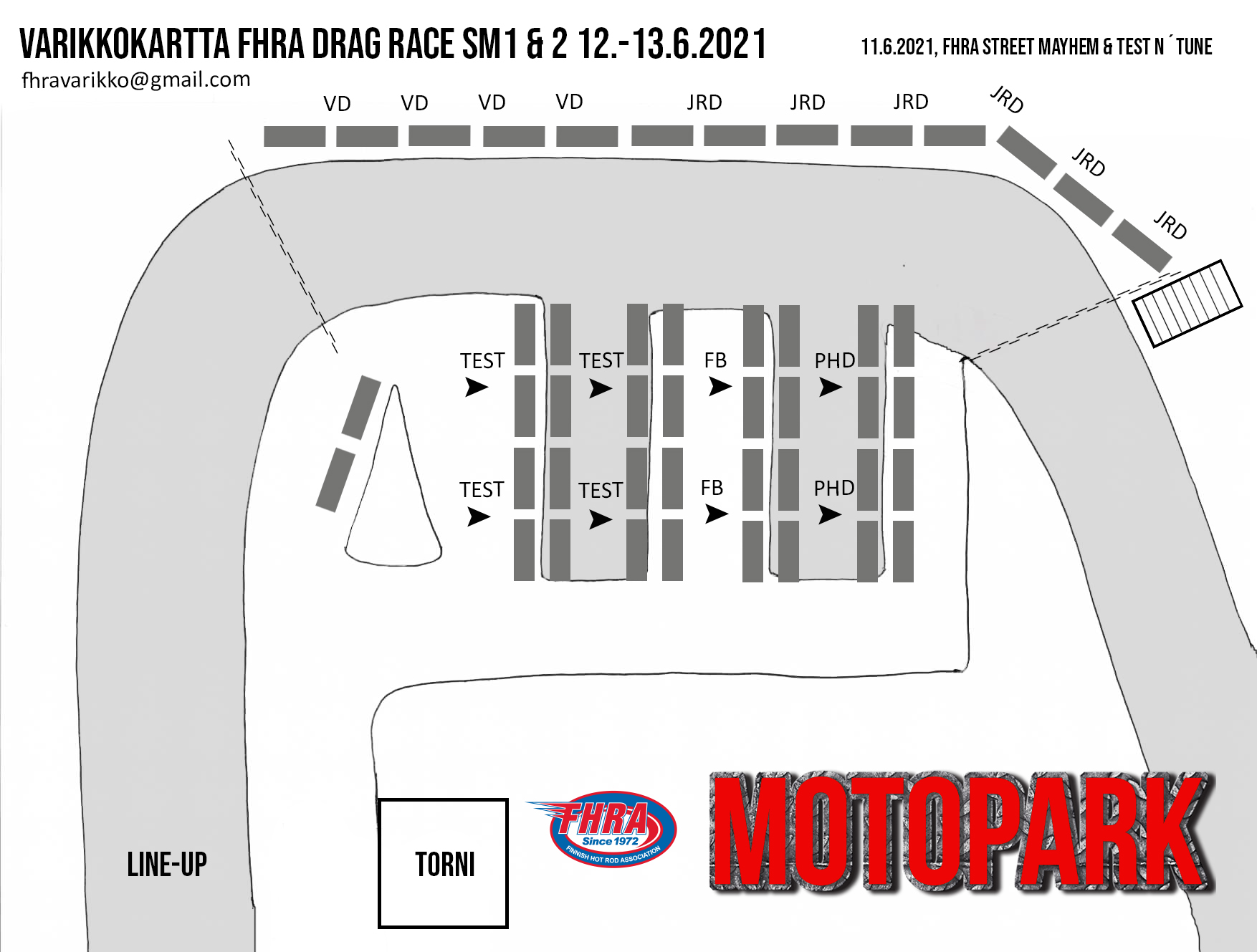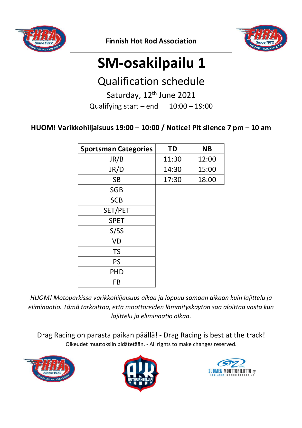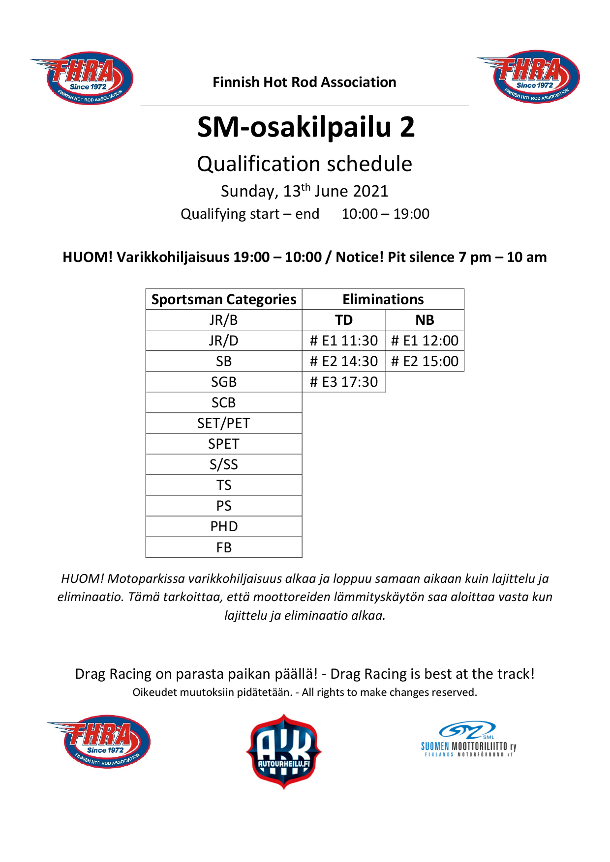 Kiihdytysajon SM-sarja starttaa Motoparkissa viikonloppuna. 12.-13.6.2021 Kiihdytysajon SM-osakilpailu 1 & 2, Motopark Raceway, Pieksämäki Ennen varsinaista kilpailua ajetaan perjantaina 11.6.2021, FHRA Street Mayhem & Test n´Tune Motoparkintie 62, 77330 Pieksämäki Kiihdytysajon SM-sarja päästään viimein aloittamaan. WE ARE RACING AGAIN. Ensimmäiset SM-pisteet on jaossa Virtasalmella. Kiihdytysajon SM-sarjan 1. ja 2. osakilpailu ajetaan legendaariselle Motoparkin radalle. Kaikilla on varmasti jo kova polte radalle ja katsomoon. Avauskilpailussa selviää mistä asetelmista kuskit starttavaat uuteen kauteen, mitä muutoksia kalustoon on tullut talven aikana ja kenelle jaetaan kiihdytysajon ensimmäiset SM-pisteet. Tervetuloa seuraamaan kisaa ja kannustamaan omia suosikkeja. FHRA Street Mayhem & Test n´Tune -päivälle osallistuu paljon kisakuskeja ja tapahtumaan ovat kaikki tervetulleet testaamaan SM-tasoista rataa. Ensimmäisessä tapahtumassamme ajetaan myös uudella konseptilla Fueltech Nitrobike Showdown 2021 -osakilpailu ja paikalla komea määrä nitroprätkiä. Pistä sarja seurantaan Facebookissa Fueltech Nitrobike Showdown ja Instagramissa @nitrobikeshowdown Uutena ryhmänä kisoissa nähdään Vintage Drags. Tutustu ryhmään Facebookissa Finnish Vintage Drag racing Association Hienoja nostalgia-kilpureita nähdään viivalla lauantaina. Kuljettajalista päivittyy täällä: Kiihdytysajon SM-osakilpailu 1 & 2 12-13.6.2021 on www.dragracing.eu Testaajat löydät täältä: FHRA Street Mayhem & Test n´Tune 11.6.2021 on www.dragracing.eu Testipäivän aikataulu: Perjantai 11.00-18.00 Kilpailun aikataulu: Lauantai 10.00-19.00 – Lajitteluajot ja eliminaatio Sunnuntai 10.00-19.00 – Pudotusajot ja eliminaatio Kilpailu striimataan FHRA:n Livestream-kanavalle: https://livestream.com/fhra Race-kansaa rata-alueella ja sen ympäristössä viihdyttää FHRA Race Radio taajuudella 93,6 mhz. Pääsyliput: Alle 18-vuotiaille ilmainen pääsy tapahtumaan. Kaikki liput vaihdetaan rannekkeisiin portilla. Päivälippu: 20 € Kokoaikalippu: 30 € Liput myynnissä Tiketissä ja portilla. Huomioithan, että Drag Racing tapahtuma järjestetään säävarauksella. Sateen aikana ei turvallisuussyistä voida ajaa, sään salliessa ajoja jatketaan heti kun se vain on mahdollista. Emme palauta maksua lunastetuista lipuista, emmekä korvaa kadonneita lippuja. Olet alueella omalla vastuullasi. Hyvä median edustaja. Voit ilmoittautua samalla lomakkeella vaikka kaikkiin tapahtumiin yhdellä kertaa.