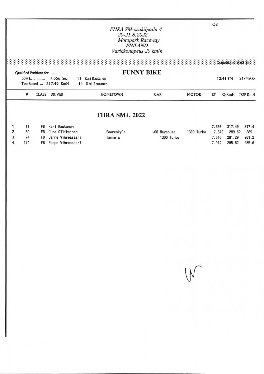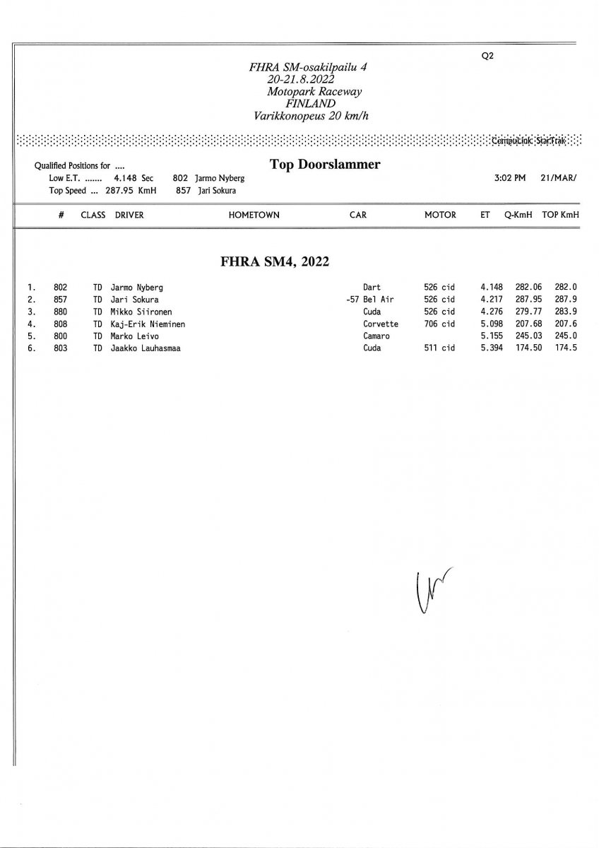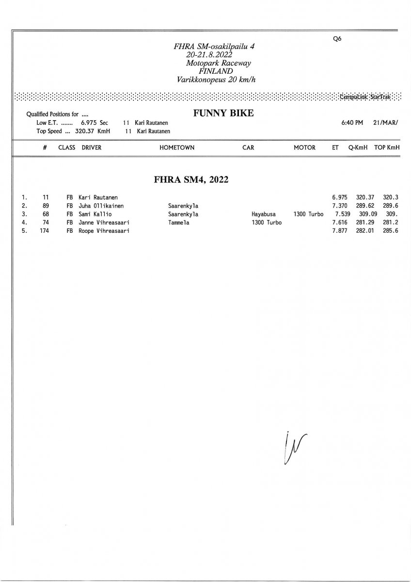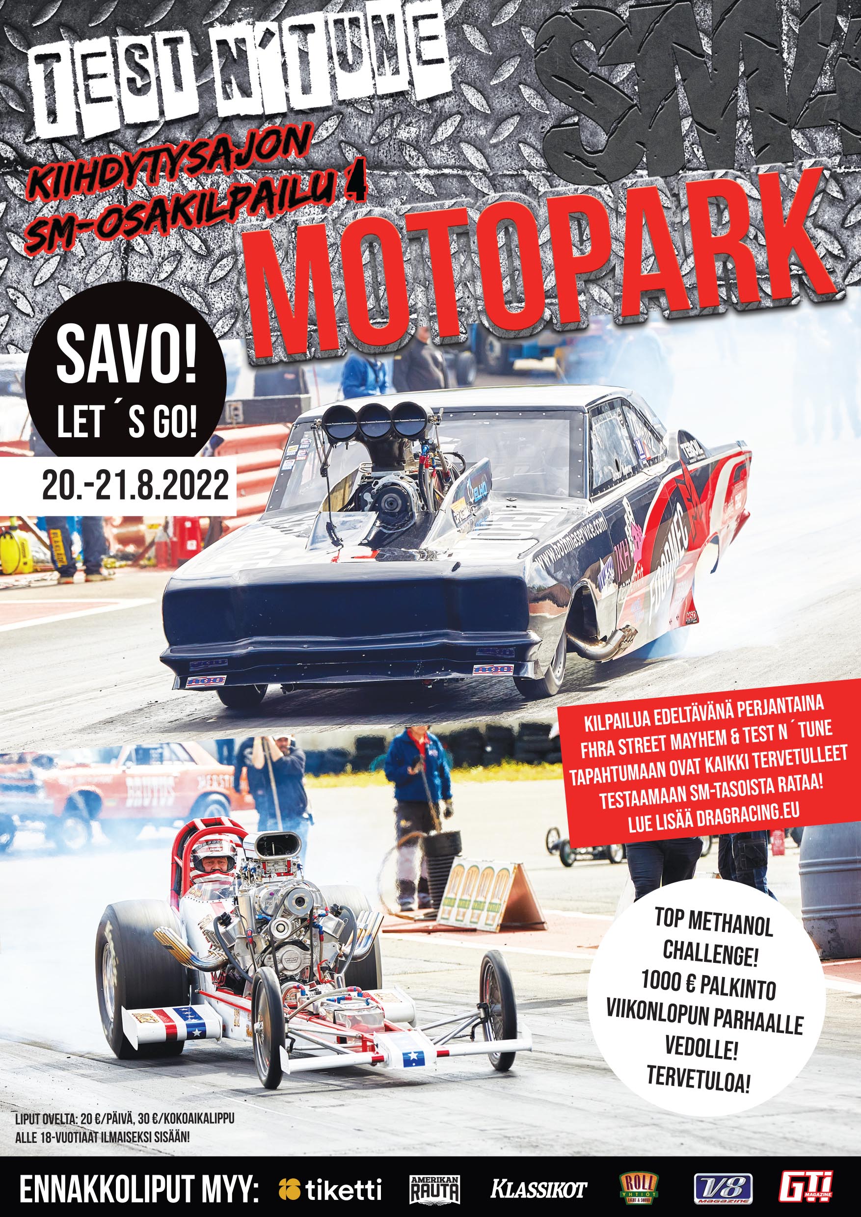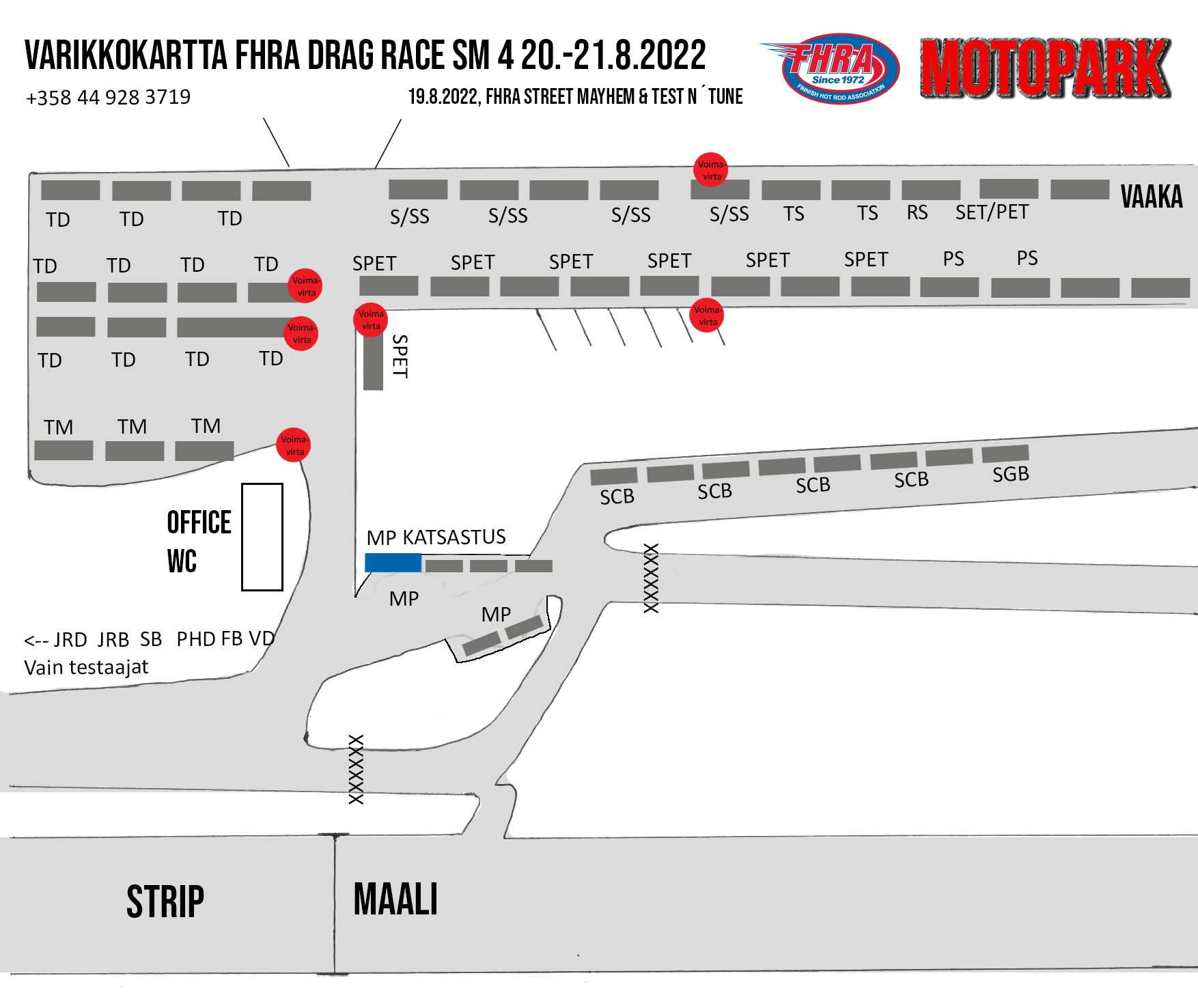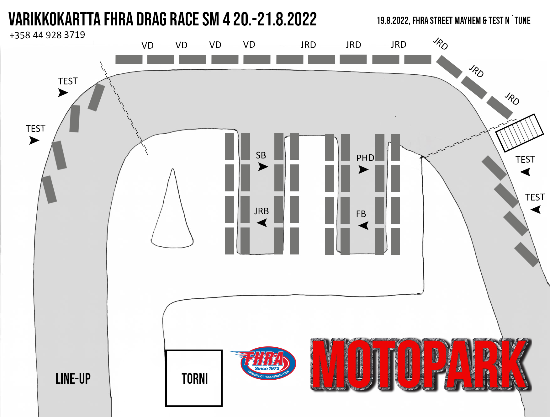 20.-21.8.2022 Kiihdytysajon SM-osakilpailu 4, Motopark Raceway, Pieksämäki Ennen varsinaista kilpailua ajetaan perjantaina 19.8.2022 FHRA Street Mayhem & Test n´Tune Motoparkintie 62, 77330 Pieksämäki SM-kisa vedetään Virtasalmella. Kiihdytysajon SM-sarjan 4. osakilpailu ajetaan legendaariselle Motoparkin radalle. FHRA Street Mayhem & Test n´Tune osallistuu paljon kisakuskeja ja tapahtumaan ovat kaikki tervetulleet testaamaan SM-tasoista rataa. Kuljettajalista päivittyy täällä: FHRA Kiihdytysajon SM-osakilpailu 4 20.-21.8.2022 on www.dragracing.eu Testaajat löydät täältä: FHRA Street Mayhem & Test n´Tune 19.8.2022 on www.dragracing.eu Yleisön majoittuminen: Motomajat tarjoaa asiakkailleen edullisen majoituksen moottoriradan välittömässä läheisyydessä kauniin Etelä-Virmaksen rannalla. Tarjolla kesäkäyttöisiä aittamökkejä, huoneita piharakennuksen yläkerrassa, teltta- ja asuntovaunupaikkoja. Aittamökeissä ja huoneissa on jääkaapit (uusittu vuonna 2022), mutta ei ruoanlaittomahdollisuutta. Suihkut ja wc:t sijaitsevat piharakennuksessa. Alueella on kaksi puulämmitteistä rantasaunaa ja yksi sähkölämmitteinen pihasauna. Motoparkintie 23 77330 Virtasalmi info@motopark.fi puhelimitse tavoitat klo 8 ja 18 välisenä aikana, tapahtumien aikaan 24h, numerosta 044 278 0088 https://www.motopark.fi/ Testipäivän aikataulu: Perjantai 11.00-18.00 Kilpailun aikataulu: Lauantai 10.00-19.00 – Lajitteluajot Sunnuntai 10.00-19.00 – Eliminaatio Kilpailu striimataan FHRA:n Livestream-kanavalle: https://livestream.com/fhra Race-kansaa rata-alueella ja sen ympäristössä viihdyttää FHRA Race Radio taajuudella 93,6 mhz. Pääsyliput: Alle 18-vuotiaille ilmainen pääsy tapahtumaan. Kaikki liput vaihdetaan rannekkeisiin portilla. Päivälippu: 20 € Kokoaikalippu: 30 € Liput ennakkoon myy Tiketti. Lippuja on myynnissä myös tapahtuman sisäänpääsyportilla. Tervetuloa. Huomioithan, että Drag Racing tapahtuma järjestetään säävarauksella. Sateen aikana ei turvallisuussyistä voida ajaa, sään salliessa ajoja jatketaan heti kun se vain on mahdollista. Emme palauta maksua lunastetuista lipuista, emmekä korvaa kadonneita lippuja. Olet alueella omalla vastuullasi.