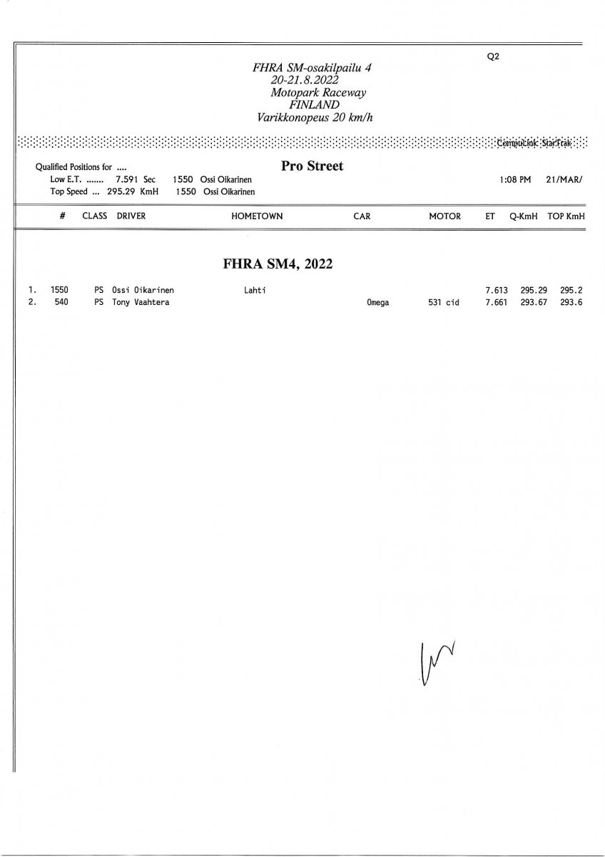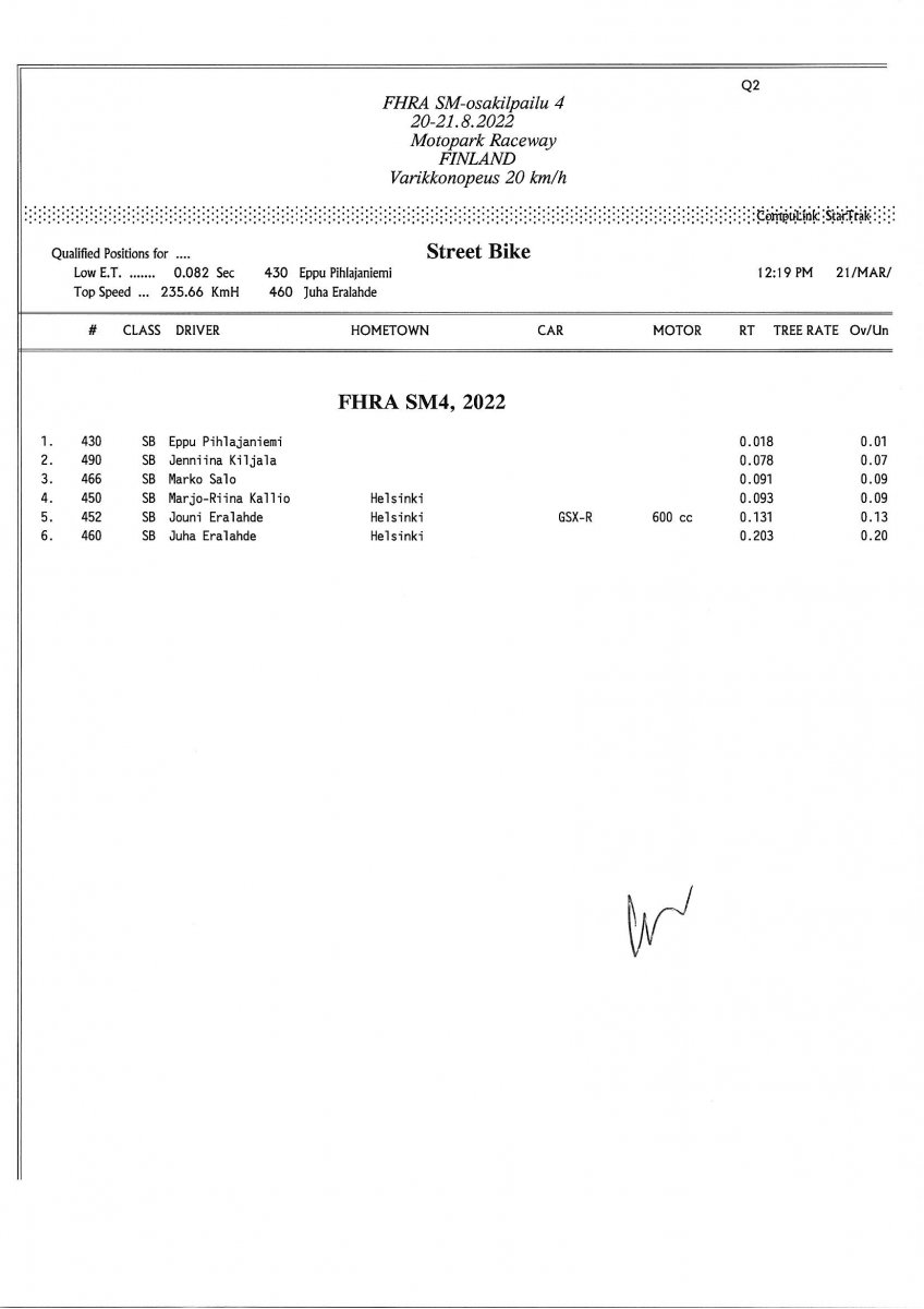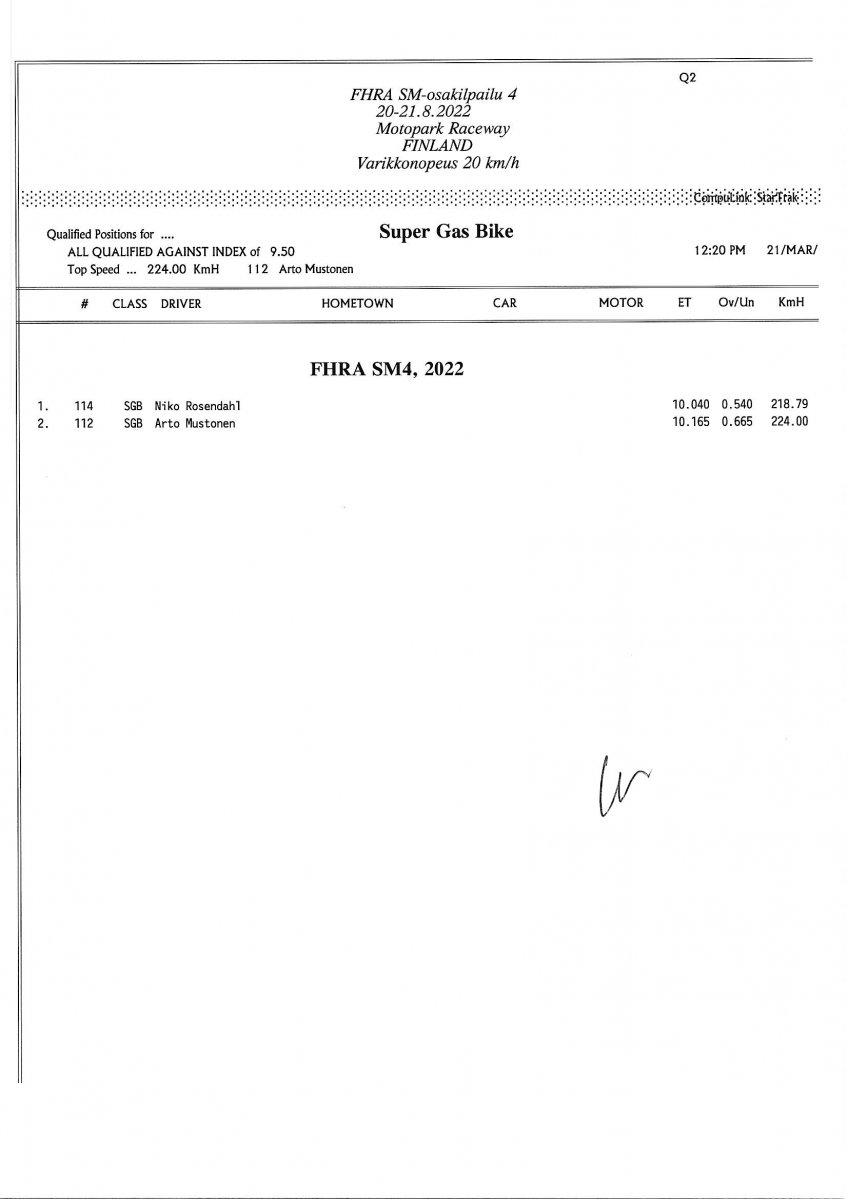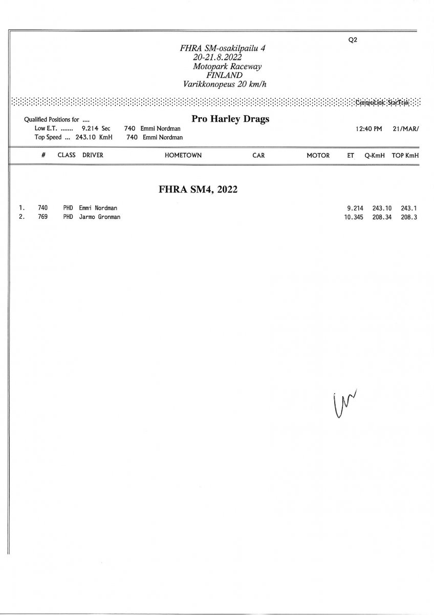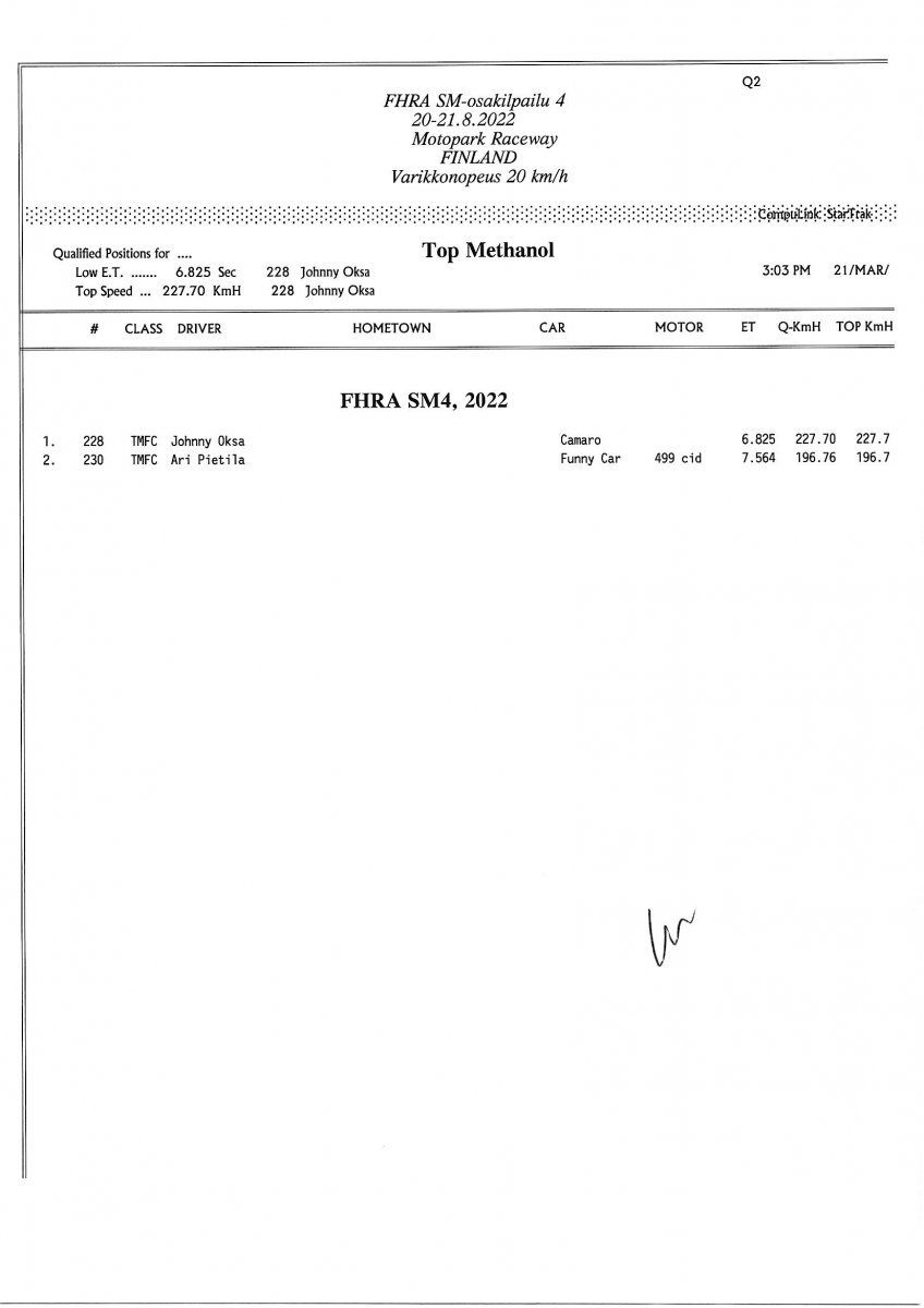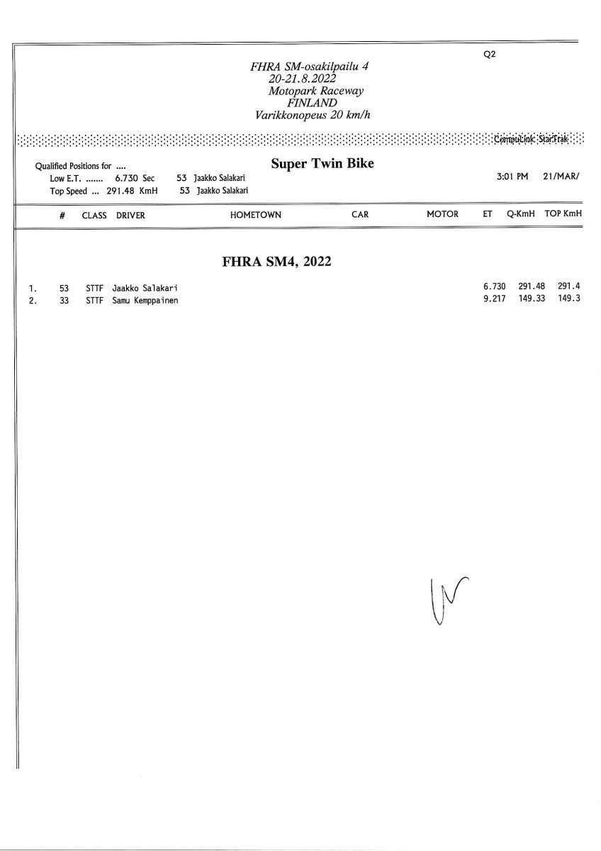 20.-21.8.2022 Kiihdytysajon SM-osakilpailu 4, Motopark Raceway, Pieksämäki Ennen varsinaista kilpailua ajetaan perjantaina 19.8.2022 FHRA Street Mayhem & Test n´Tune Motoparkintie 62, 77330 Pieksämäki SM-kisa vedetään Virtasalmella. Kiihdytysajon SM-sarjan 4. osakilpailu ajetaan legendaariselle Motoparkin radalle. FHRA Street Mayhem & Test n´Tune osallistuu paljon kisakuskeja ja tapahtumaan ovat kaikki tervetulleet testaamaan SM-tasoista rataa. Kuljettajalista päivittyy täällä: FHRA Kiihdytysajon SM-osakilpailu 4 20.-21.8.2022 on www.dragracing.eu Testaajat löydät täältä: FHRA Street Mayhem & Test n´Tune 19.8.2022 on www.dragracing.eu Yleisön majoittuminen: Motomajat tarjoaa asiakkailleen edullisen majoituksen moottoriradan välittömässä läheisyydessä kauniin Etelä-Virmaksen rannalla. Tarjolla kesäkäyttöisiä aittamökkejä, huoneita piharakennuksen yläkerrassa, teltta- ja asuntovaunupaikkoja. Aittamökeissä ja huoneissa on jääkaapit (uusittu vuonna 2022), mutta ei ruoanlaittomahdollisuutta. Suihkut ja wc:t sijaitsevat piharakennuksessa. Alueella on kaksi puulämmitteistä rantasaunaa ja yksi sähkölämmitteinen pihasauna. Motoparkintie 23 77330 Virtasalmi info@motopark.fi puhelimitse tavoitat klo 8 ja 18 välisenä aikana, tapahtumien aikaan 24h, numerosta 044 278 0088 https://www.motopark.fi/ Testipäivän aikataulu: Perjantai 11.00-18.00 Kilpailun aikataulu: Lauantai 10.00-19.00 – Lajitteluajot Sunnuntai 10.00-19.00 – Eliminaatio Kilpailu striimataan FHRA:n Livestream-kanavalle: https://livestream.com/fhra Race-kansaa rata-alueella ja sen ympäristössä viihdyttää FHRA Race Radio taajuudella 93,6 mhz. Pääsyliput: Alle 18-vuotiaille ilmainen pääsy tapahtumaan. Kaikki liput vaihdetaan rannekkeisiin portilla. Päivälippu: 20 € Kokoaikalippu: 30 € Liput ennakkoon myy Tiketti. Lippuja on myynnissä myös tapahtuman sisäänpääsyportilla. Tervetuloa. Huomioithan, että Drag Racing tapahtuma järjestetään säävarauksella. Sateen aikana ei turvallisuussyistä voida ajaa, sään salliessa ajoja jatketaan heti kun se vain on mahdollista. Emme palauta maksua lunastetuista lipuista, emmekä korvaa kadonneita lippuja. Olet alueella omalla vastuullasi.