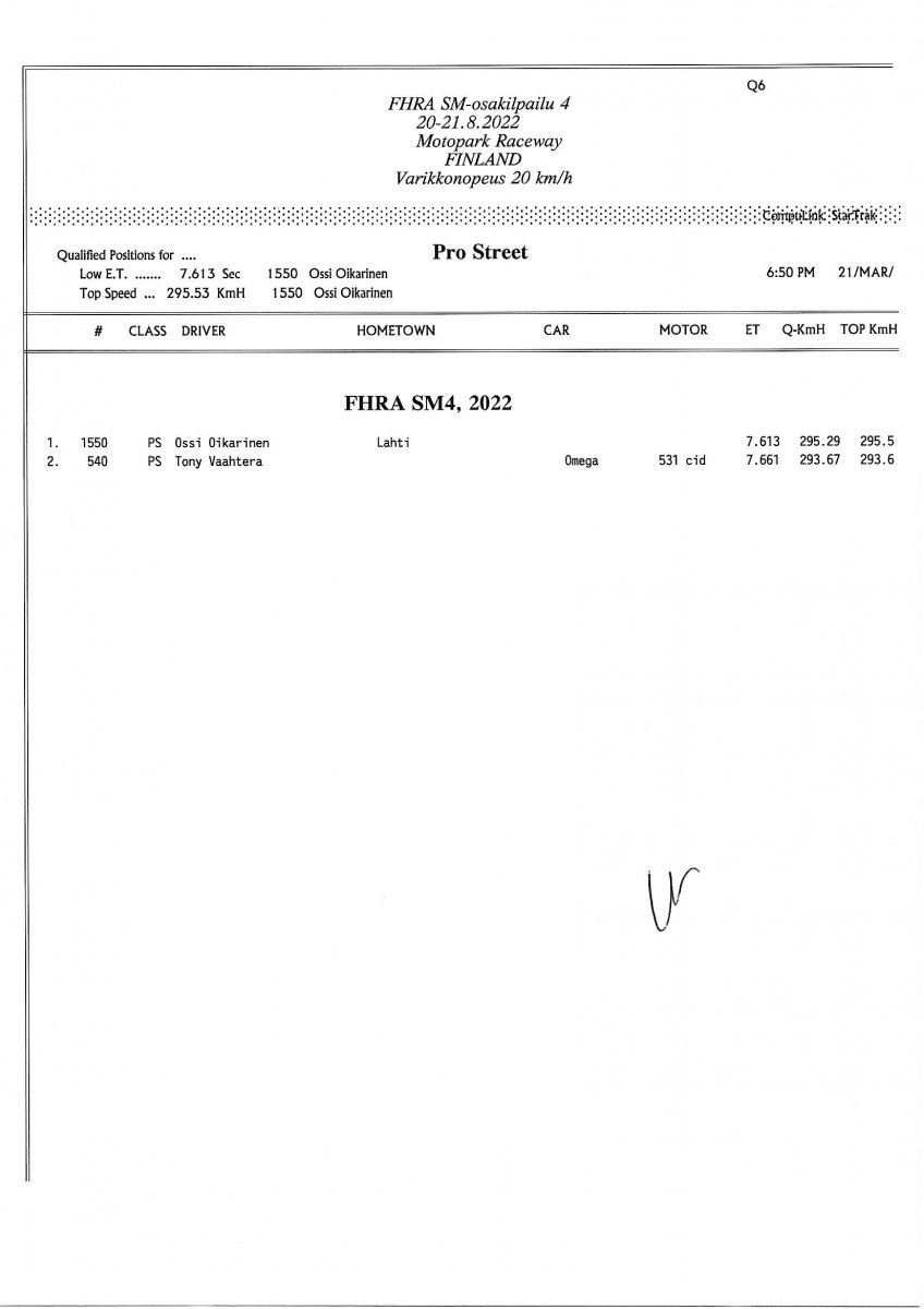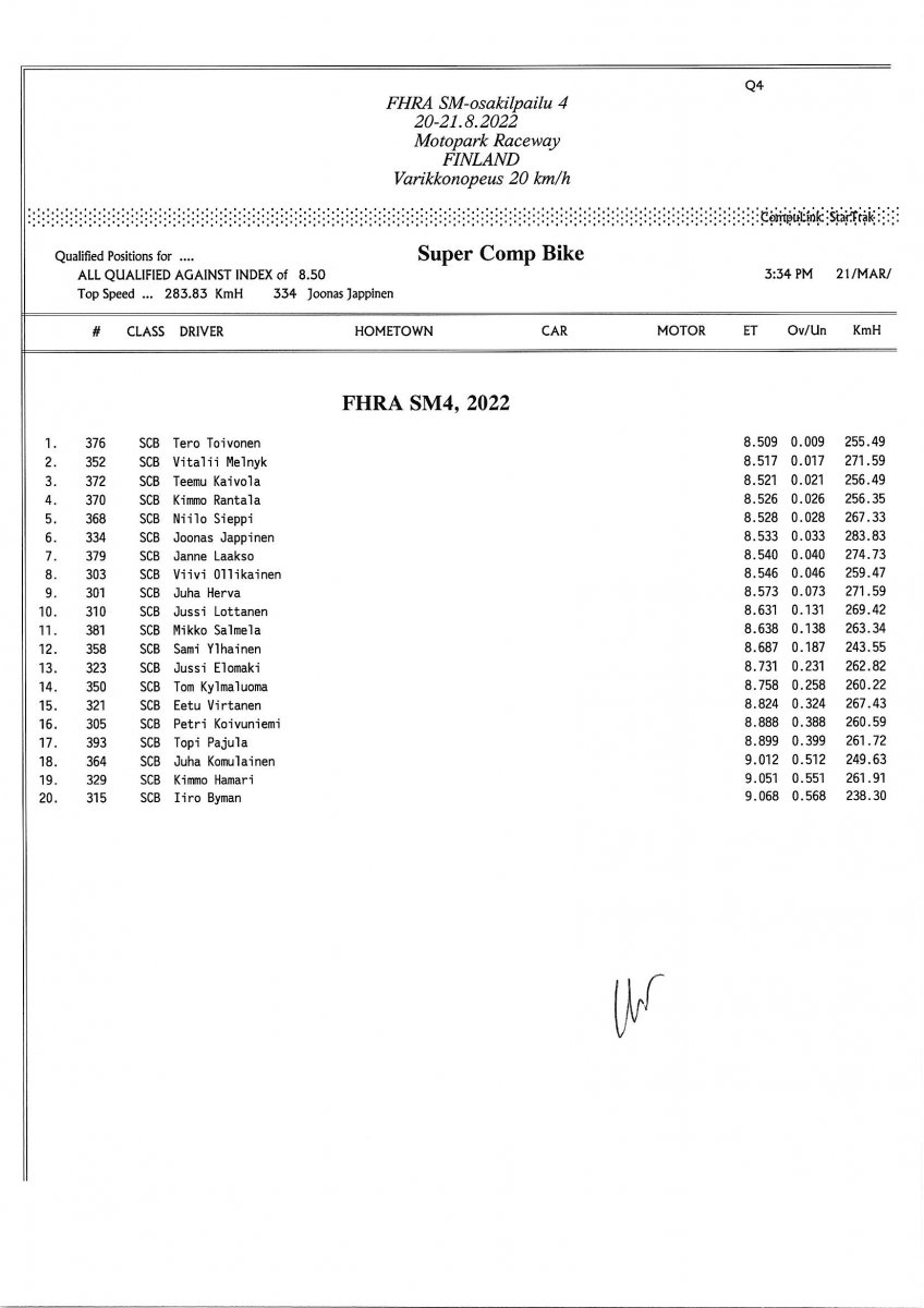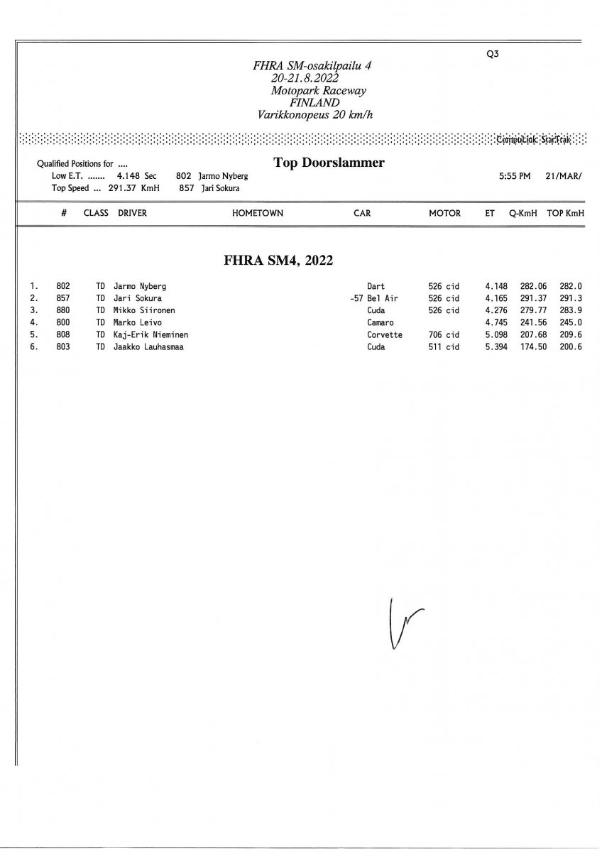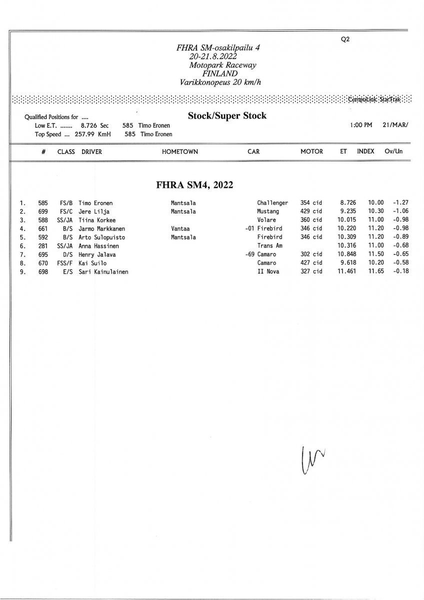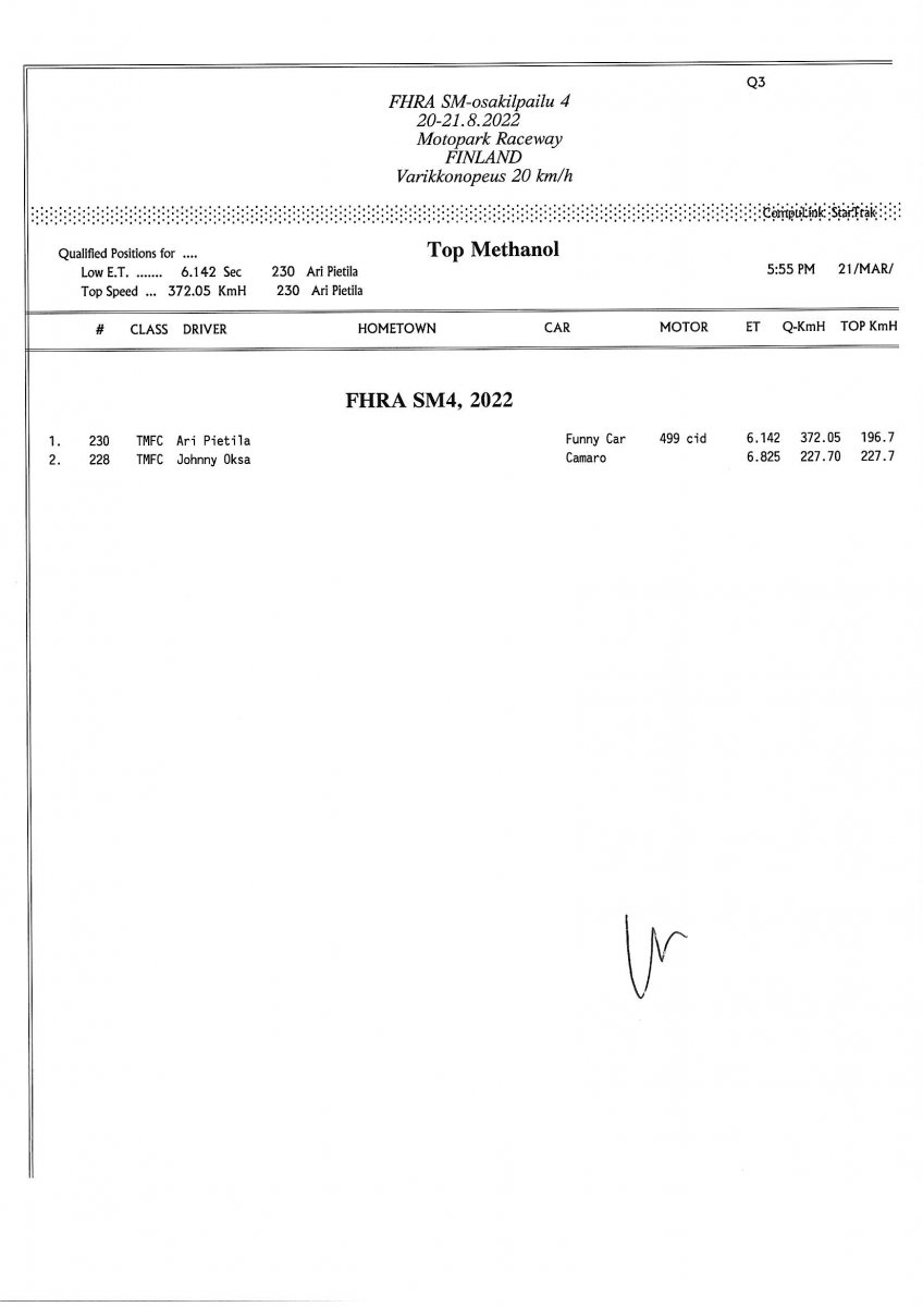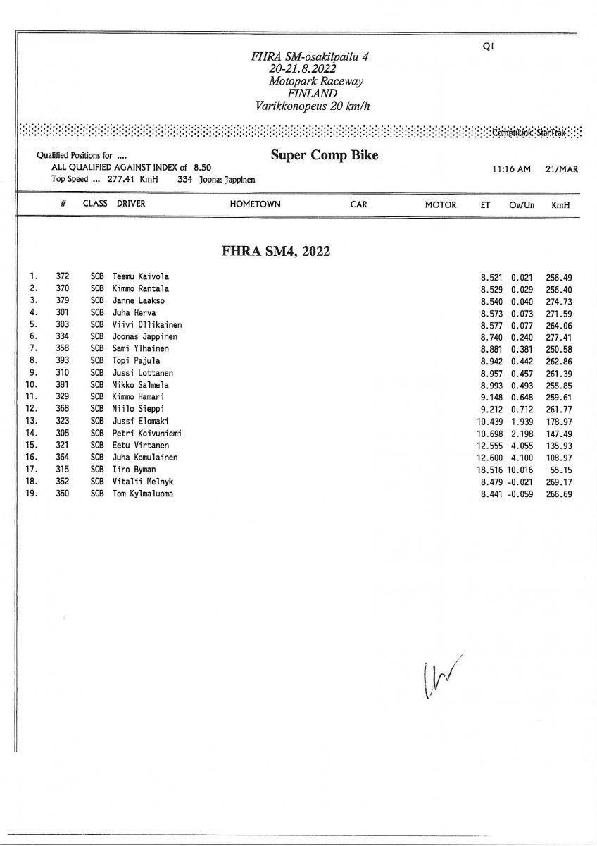 20.-21.8.2022 Kiihdytysajon SM-osakilpailu 4, Motopark Raceway, Pieksämäki Ennen varsinaista kilpailua ajetaan perjantaina 19.8.2022 FHRA Street Mayhem & Test n´Tune Motoparkintie 62, 77330 Pieksämäki SM-kisa vedetään Virtasalmella. Kiihdytysajon SM-sarjan 4. osakilpailu ajetaan legendaariselle Motoparkin radalle. FHRA Street Mayhem & Test n´Tune osallistuu paljon kisakuskeja ja tapahtumaan ovat kaikki tervetulleet testaamaan SM-tasoista rataa. Kuljettajalista päivittyy täällä: FHRA Kiihdytysajon SM-osakilpailu 4 20.-21.8.2022 on www.dragracing.eu Testaajat löydät täältä: FHRA Street Mayhem & Test n´Tune 19.8.2022 on www.dragracing.eu Yleisön majoittuminen: Motomajat tarjoaa asiakkailleen edullisen majoituksen moottoriradan välittömässä läheisyydessä kauniin Etelä-Virmaksen rannalla. Tarjolla kesäkäyttöisiä aittamökkejä, huoneita piharakennuksen yläkerrassa, teltta- ja asuntovaunupaikkoja. Aittamökeissä ja huoneissa on jääkaapit (uusittu vuonna 2022), mutta ei ruoanlaittomahdollisuutta. Suihkut ja wc:t sijaitsevat piharakennuksessa. Alueella on kaksi puulämmitteistä rantasaunaa ja yksi sähkölämmitteinen pihasauna. Motoparkintie 23 77330 Virtasalmi info@motopark.fi puhelimitse tavoitat klo 8 ja 18 välisenä aikana, tapahtumien aikaan 24h, numerosta 044 278 0088 https://www.motopark.fi/ Testipäivän aikataulu: Perjantai 11.00-18.00 Kilpailun aikataulu: Lauantai 10.00-19.00 – Lajitteluajot Sunnuntai 10.00-19.00 – Eliminaatio Kilpailu striimataan FHRA:n Livestream-kanavalle: https://livestream.com/fhra Race-kansaa rata-alueella ja sen ympäristössä viihdyttää FHRA Race Radio taajuudella 93,6 mhz. Pääsyliput: Alle 18-vuotiaille ilmainen pääsy tapahtumaan. Kaikki liput vaihdetaan rannekkeisiin portilla. Päivälippu: 20 € Kokoaikalippu: 30 € Liput ennakkoon myy Tiketti. Lippuja on myynnissä myös tapahtuman sisäänpääsyportilla. Tervetuloa. Huomioithan, että Drag Racing tapahtuma järjestetään säävarauksella. Sateen aikana ei turvallisuussyistä voida ajaa, sään salliessa ajoja jatketaan heti kun se vain on mahdollista. Emme palauta maksua lunastetuista lipuista, emmekä korvaa kadonneita lippuja. Olet alueella omalla vastuullasi.