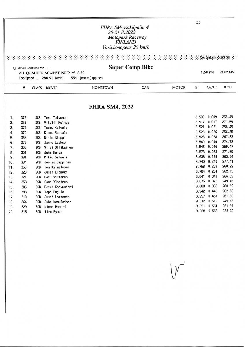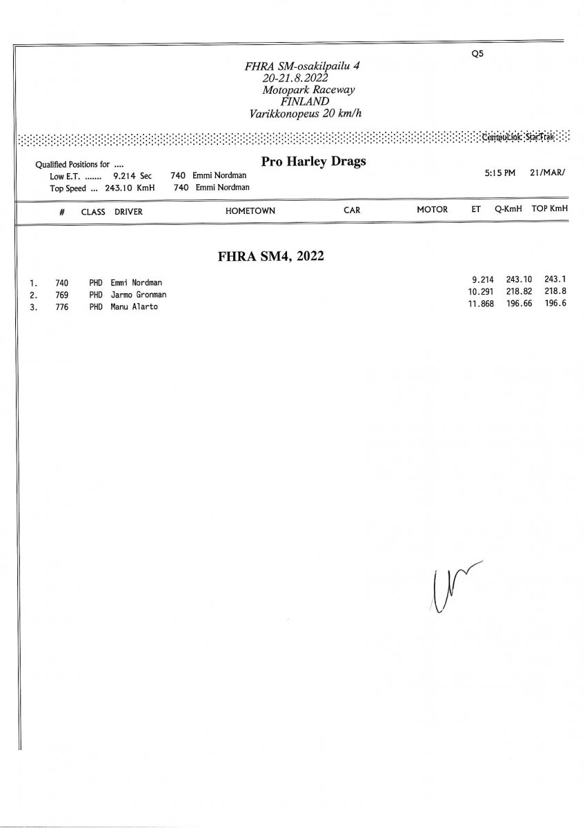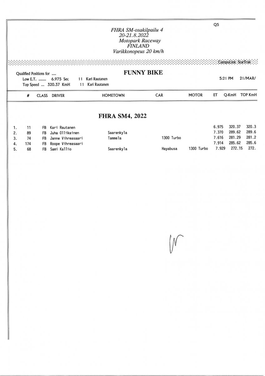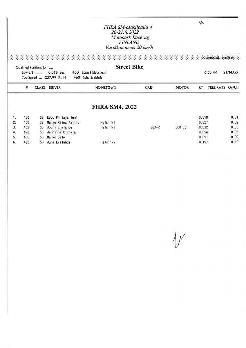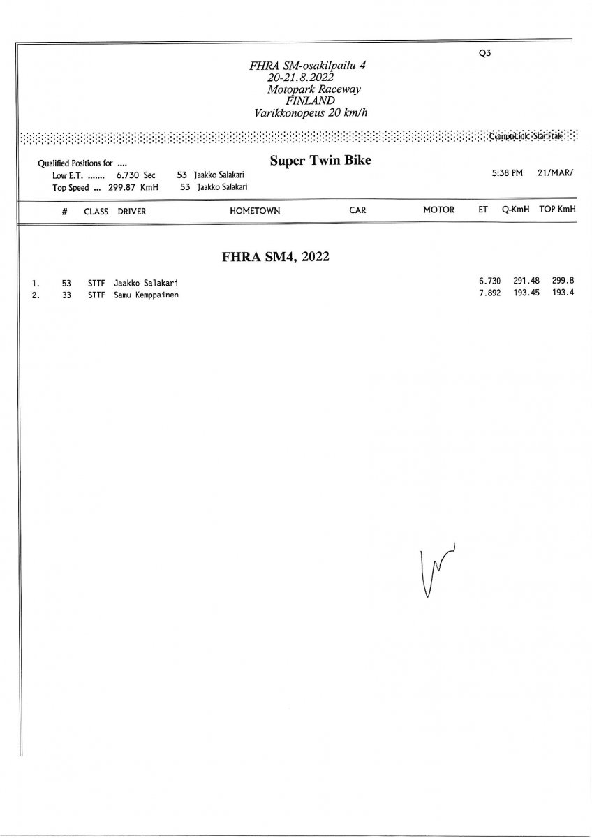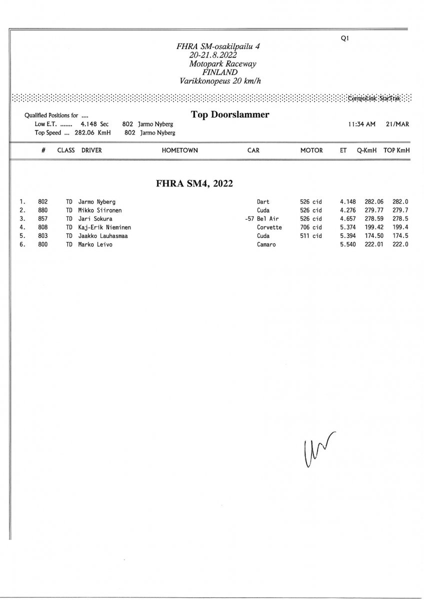 20.-21.8.2022 Kiihdytysajon SM-osakilpailu 4, Motopark Raceway, Pieksämäki Ennen varsinaista kilpailua ajetaan perjantaina 19.8.2022 FHRA Street Mayhem & Test n´Tune Motoparkintie 62, 77330 Pieksämäki SM-kisa vedetään Virtasalmella. Kiihdytysajon SM-sarjan 4. osakilpailu ajetaan legendaariselle Motoparkin radalle. FHRA Street Mayhem & Test n´Tune osallistuu paljon kisakuskeja ja tapahtumaan ovat kaikki tervetulleet testaamaan SM-tasoista rataa. Kuljettajalista päivittyy täällä: FHRA Kiihdytysajon SM-osakilpailu 4 20.-21.8.2022 on www.dragracing.eu Testaajat löydät täältä: FHRA Street Mayhem & Test n´Tune 19.8.2022 on www.dragracing.eu Yleisön majoittuminen: Motomajat tarjoaa asiakkailleen edullisen majoituksen moottoriradan välittömässä läheisyydessä kauniin Etelä-Virmaksen rannalla. Tarjolla kesäkäyttöisiä aittamökkejä, huoneita piharakennuksen yläkerrassa, teltta- ja asuntovaunupaikkoja. Aittamökeissä ja huoneissa on jääkaapit (uusittu vuonna 2022), mutta ei ruoanlaittomahdollisuutta. Suihkut ja wc:t sijaitsevat piharakennuksessa. Alueella on kaksi puulämmitteistä rantasaunaa ja yksi sähkölämmitteinen pihasauna. Motoparkintie 23 77330 Virtasalmi info@motopark.fi puhelimitse tavoitat klo 8 ja 18 välisenä aikana, tapahtumien aikaan 24h, numerosta 044 278 0088 https://www.motopark.fi/ Testipäivän aikataulu: Perjantai 11.00-18.00 Kilpailun aikataulu: Lauantai 10.00-19.00 – Lajitteluajot Sunnuntai 10.00-19.00 – Eliminaatio Kilpailu striimataan FHRA:n Livestream-kanavalle: https://livestream.com/fhra Race-kansaa rata-alueella ja sen ympäristössä viihdyttää FHRA Race Radio taajuudella 93,6 mhz. Pääsyliput: Alle 18-vuotiaille ilmainen pääsy tapahtumaan. Kaikki liput vaihdetaan rannekkeisiin portilla. Päivälippu: 20 € Kokoaikalippu: 30 € Liput ennakkoon myy Tiketti. Lippuja on myynnissä myös tapahtuman sisäänpääsyportilla. Tervetuloa. Huomioithan, että Drag Racing tapahtuma järjestetään säävarauksella. Sateen aikana ei turvallisuussyistä voida ajaa, sään salliessa ajoja jatketaan heti kun se vain on mahdollista. Emme palauta maksua lunastetuista lipuista, emmekä korvaa kadonneita lippuja. Olet alueella omalla vastuullasi.