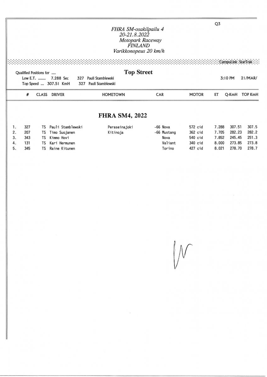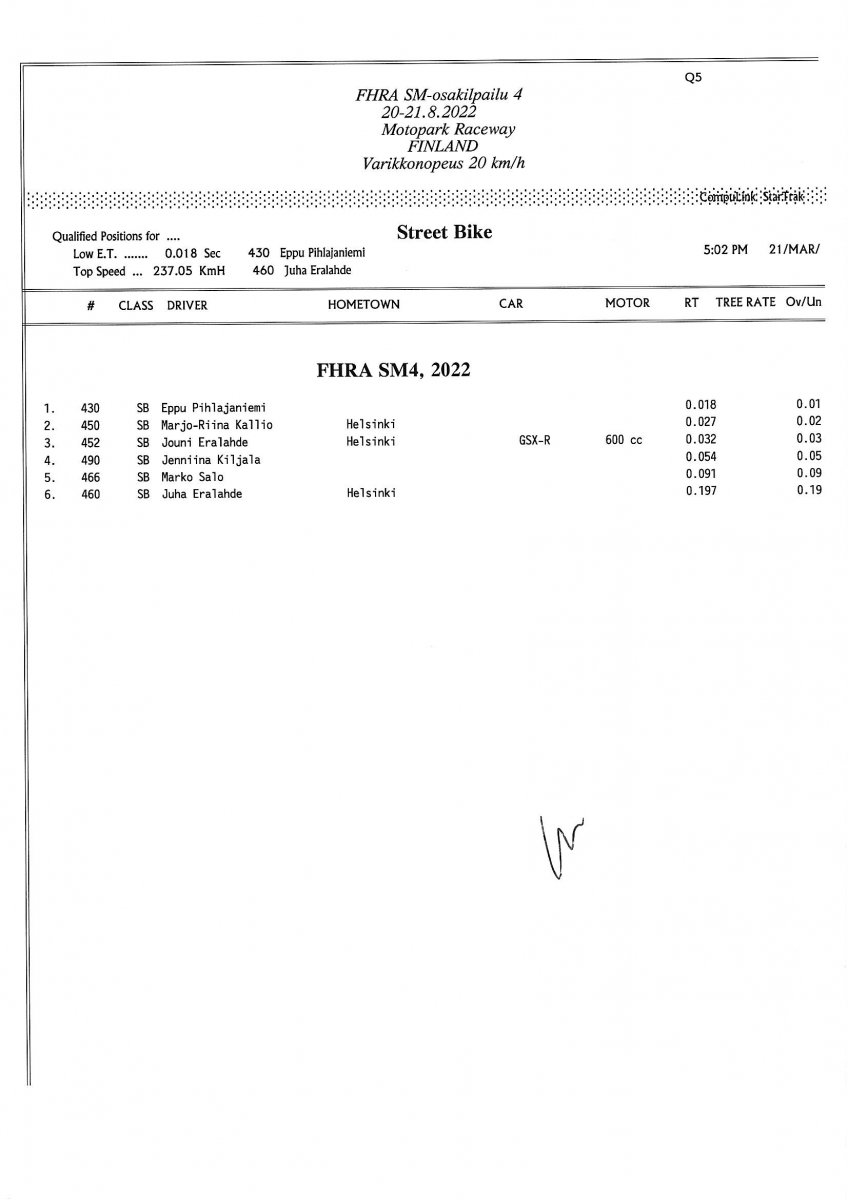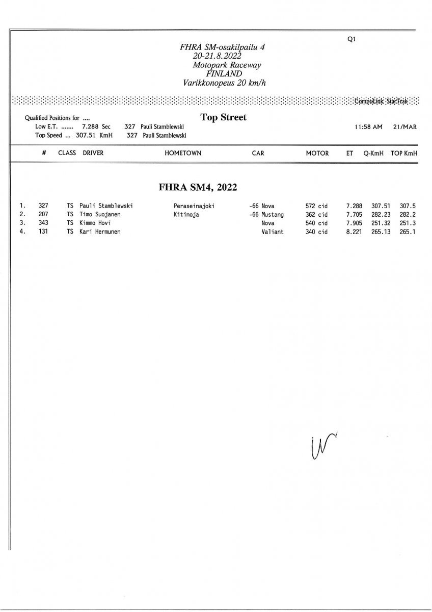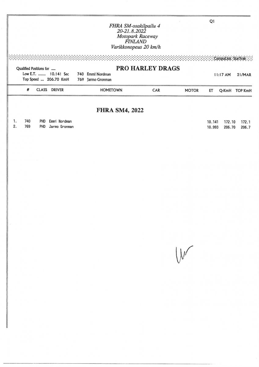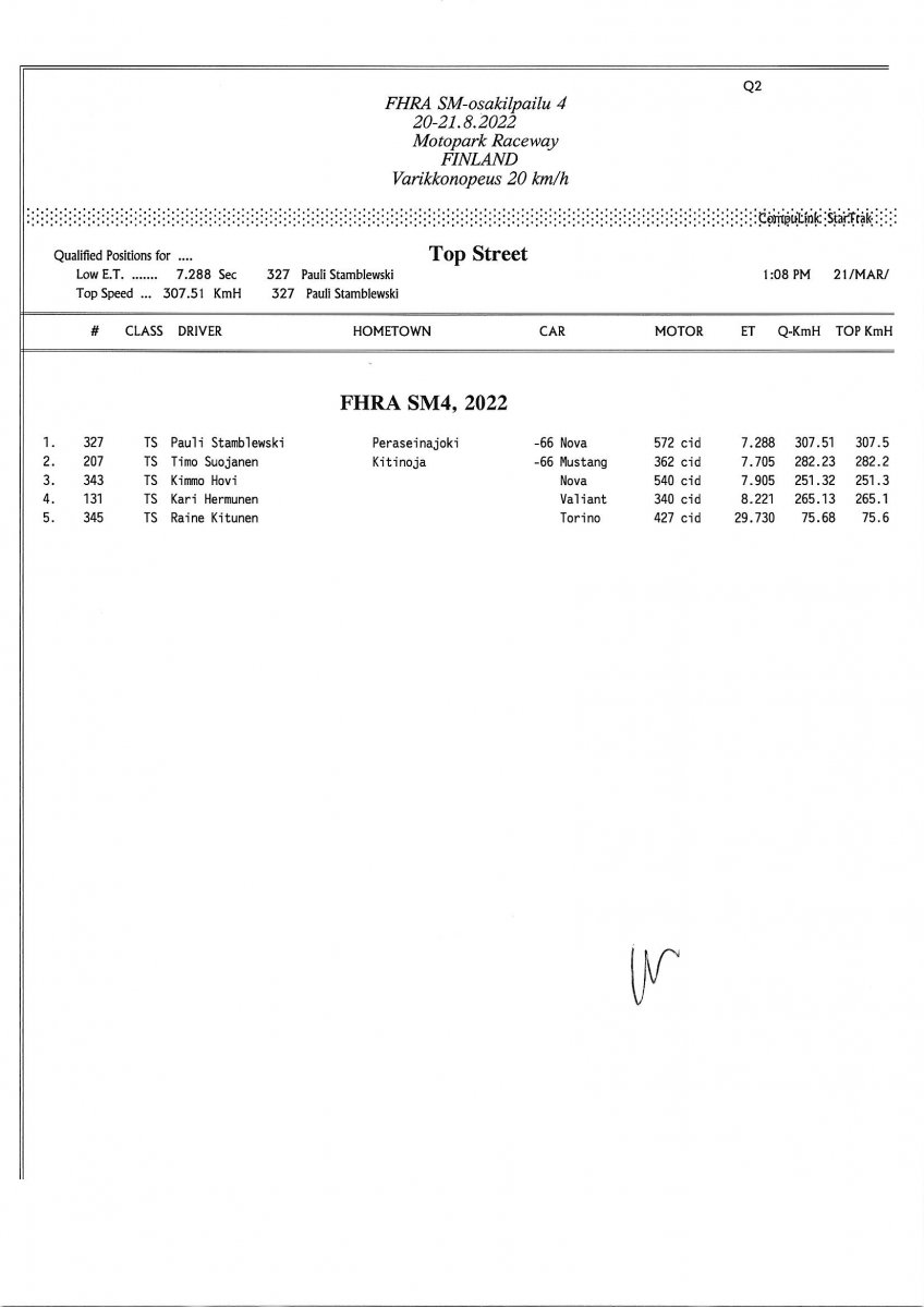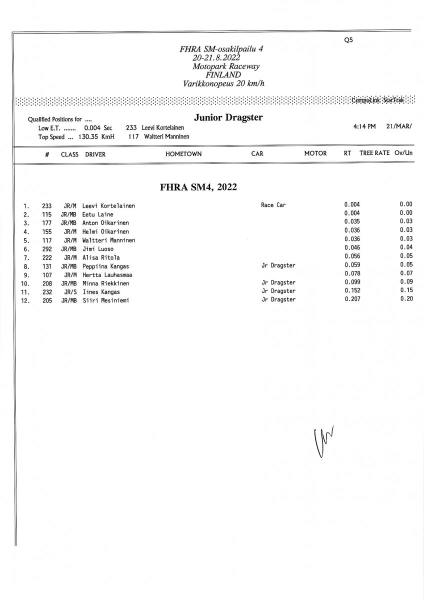 20.-21.8.2022 Kiihdytysajon SM-osakilpailu 4, Motopark Raceway, Pieksämäki Ennen varsinaista kilpailua ajetaan perjantaina 19.8.2022 FHRA Street Mayhem & Test n´Tune Motoparkintie 62, 77330 Pieksämäki SM-kisa vedetään Virtasalmella. Kiihdytysajon SM-sarjan 4. osakilpailu ajetaan legendaariselle Motoparkin radalle. FHRA Street Mayhem & Test n´Tune osallistuu paljon kisakuskeja ja tapahtumaan ovat kaikki tervetulleet testaamaan SM-tasoista rataa. Kuljettajalista päivittyy täällä: FHRA Kiihdytysajon SM-osakilpailu 4 20.-21.8.2022 on www.dragracing.eu Testaajat löydät täältä: FHRA Street Mayhem & Test n´Tune 19.8.2022 on www.dragracing.eu Yleisön majoittuminen: Motomajat tarjoaa asiakkailleen edullisen majoituksen moottoriradan välittömässä läheisyydessä kauniin Etelä-Virmaksen rannalla. Tarjolla kesäkäyttöisiä aittamökkejä, huoneita piharakennuksen yläkerrassa, teltta- ja asuntovaunupaikkoja. Aittamökeissä ja huoneissa on jääkaapit (uusittu vuonna 2022), mutta ei ruoanlaittomahdollisuutta. Suihkut ja wc:t sijaitsevat piharakennuksessa. Alueella on kaksi puulämmitteistä rantasaunaa ja yksi sähkölämmitteinen pihasauna. Motoparkintie 23 77330 Virtasalmi info@motopark.fi puhelimitse tavoitat klo 8 ja 18 välisenä aikana, tapahtumien aikaan 24h, numerosta 044 278 0088 https://www.motopark.fi/ Testipäivän aikataulu: Perjantai 11.00-18.00 Kilpailun aikataulu: Lauantai 10.00-19.00 – Lajitteluajot Sunnuntai 10.00-19.00 – Eliminaatio Kilpailu striimataan FHRA:n Livestream-kanavalle: https://livestream.com/fhra Race-kansaa rata-alueella ja sen ympäristössä viihdyttää FHRA Race Radio taajuudella 93,6 mhz. Pääsyliput: Alle 18-vuotiaille ilmainen pääsy tapahtumaan. Kaikki liput vaihdetaan rannekkeisiin portilla. Päivälippu: 20 € Kokoaikalippu: 30 € Liput ennakkoon myy Tiketti. Lippuja on myynnissä myös tapahtuman sisäänpääsyportilla. Tervetuloa. Huomioithan, että Drag Racing tapahtuma järjestetään säävarauksella. Sateen aikana ei turvallisuussyistä voida ajaa, sään salliessa ajoja jatketaan heti kun se vain on mahdollista. Emme palauta maksua lunastetuista lipuista, emmekä korvaa kadonneita lippuja. Olet alueella omalla vastuullasi.