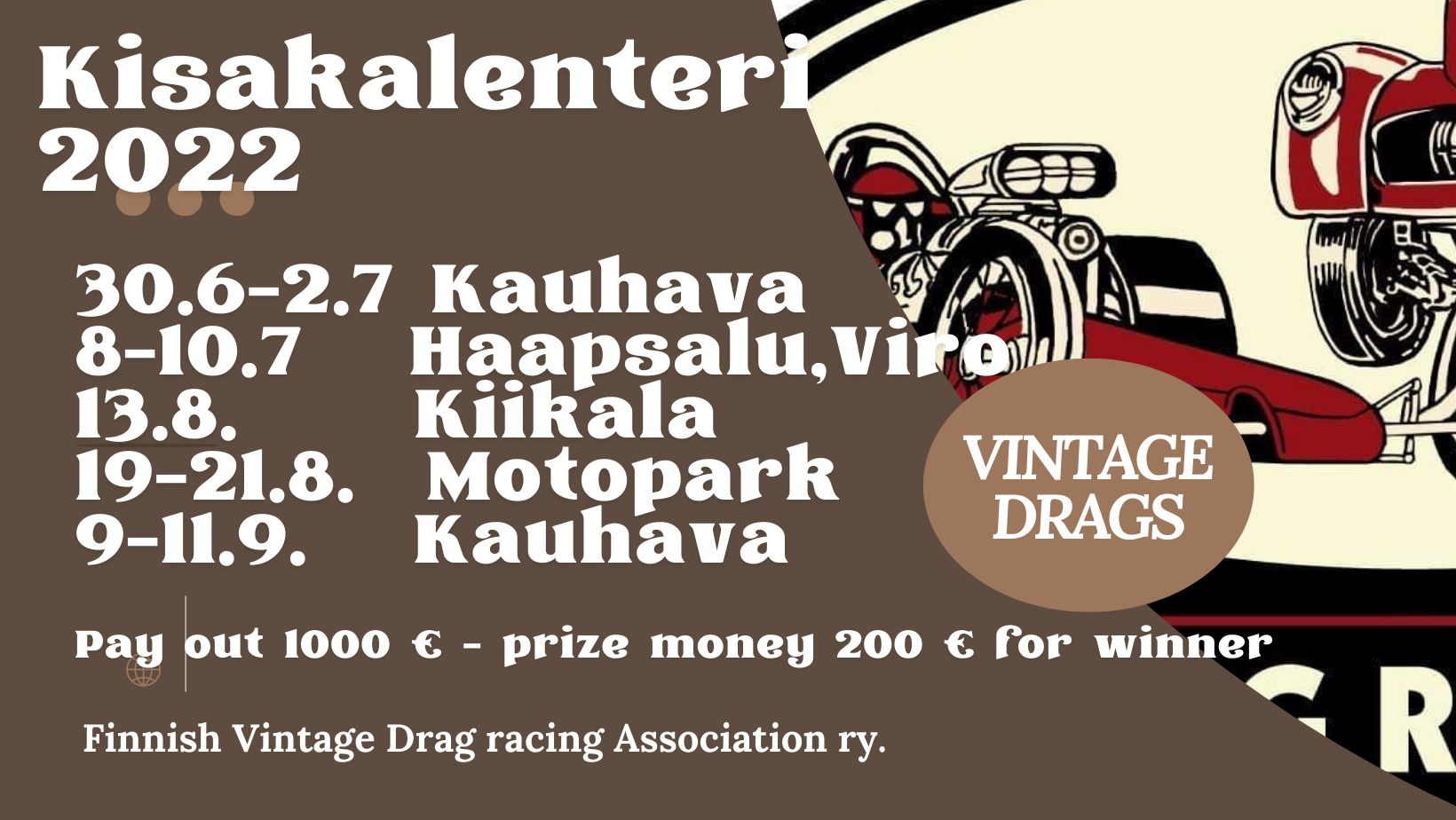 Finnish Vintage Drag racing Association Vintage Drags virallinen osakilpailu Motoparkissa. Upeat Vintage kilpurit nähdään siis radalla. So cool. Tervetuloa.