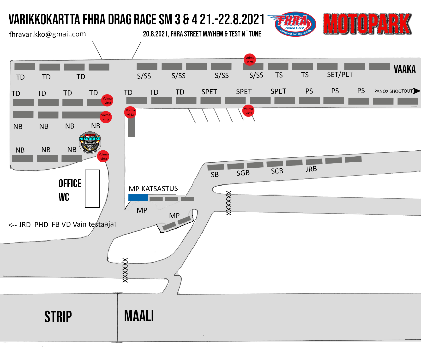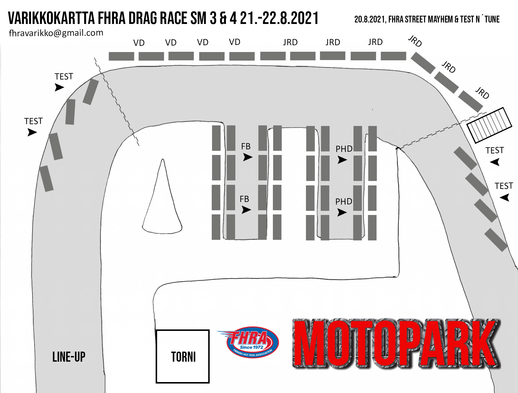 21.-22.8.2021 Kiihdytysajon SM-osakilpailu 3 & 4, Motopark Raceway, Pieksämäki Ennen varsinaista kilpailua ajetaan perjantaina 20.8.2021, FHRA Street Mayhem & Test n´Tune Motoparkintie 62, 77330 Pieksämäki Ajetaan kuin viimeistä päivää, god damn it. WE ARE RACING at SAVO. FHRA Kiihdytysajon SM-osakilpailu 3 & 4 ajetaan avauskisan tapaan kahden osakilpailun taktiikalla. Tervetuloa. SM-kisa vedetään Virtasalmella. Kiihdytysajon SM-sarjan 3. osakilpailu ajetaan legendaariselle Motoparkin radalle. Kamoon, nyt kaikki viivalle. Jo korona on tehnyt motorsportista ja tapahtumista hankalaa, saati sitten kaikki muu. No mutta Motoparkissa vedetään. FHRA Street Mayhem & Test n´Tune -päivälle osallistuu paljon kisakuskeja ja tapahtumaan ovat kaikki tervetulleet testaamaan SM-tasoista rataa. Fueltech Nitrobike Showdown 2021 -osakilpailu ja paikalla komea määrä nitroprätkiä. Pistä sarja seurantaan Facebookissa Fueltech Nitrobike Showdown ja Instagramissa @nitrobikeshowdown Motoparkissa nähdään PANOX WILDEST ONES SHOOT OUT Kesän kovin katuautojen kutsukilpailu tulee taas. Kisaan mahtuu kukaan n. 20 autoa ja 16 nopeinta mahtuu kaavioon. Kisa ajetaan FHRA SM-kilpailun yhteydessä liimaradalla motoparkissa. Kilpailussa mittavat raha- ja tavarapalkinnot kuskeille. Mikäli mielit kuskina mukaan, tai haluat kilpailun tukijaksi/yhteiskumppaniksi niin laita yv: Kari Hermunen tai PANOX Racing team Tervetuloa kannustamaan ja katsomaan. Kuljettajalista päivittyy täällä: Kiihdytysajon SM-osakilpailu 3 & 4 21.-22.8.2021 on www.dragracing.eu Testaajat löydät täältä: FHRA Street Mayhem & Test n´Tune 20.8.2021 on www.dragracing.eu Testipäivän aikataulu: Perjantai 11.00-18.00 Kilpailun aikataulu: Lauantai 10.00-19.00 – Lajitteluajot ja eliminaatio Sunnuntai 10.00-19.00 – Lajitteluajot ja eliminaatio Kilpailu striimataan FHRA:n Livestream-kanavalle: https://livestream.com/fhra Race-kansaa rata-alueella ja sen ympäristössä viihdyttää FHRA Race Radio taajuudella 93,6 mhz. Pääsyliput: Alle 18-vuotiaille ilmainen pääsy tapahtumaan. Kaikki liput vaihdetaan rannekkeisiin portilla. Päivälippu: 20 € Kokoaikalippu: 30 € Liput myy Tiketti. Huomioithan, että Drag Racing tapahtuma järjestetään säävarauksella. Sateen aikana ei turvallisuussyistä voida ajaa, sään salliessa ajoja jatketaan heti kun se vain on mahdollista. Emme palauta maksua lunastetuista lipuista, emmekä korvaa kadonneita lippuja. Olet alueella omalla vastuullasi. Tapahtuma-alueen karttoja: Tulokset: SM-pistetilanne: Ajojärjestykset: FHRA Varikko: 0400 242892 fhravarikko@gmail.com Varikkokartat: Päivittyy pian. Hyvä median edustaja. Voit ilmoittautua samalla lomakkeella vaikka kaikkiin tapahtumiin yhdellä kertaa.