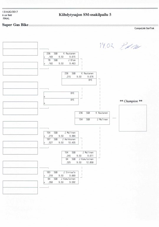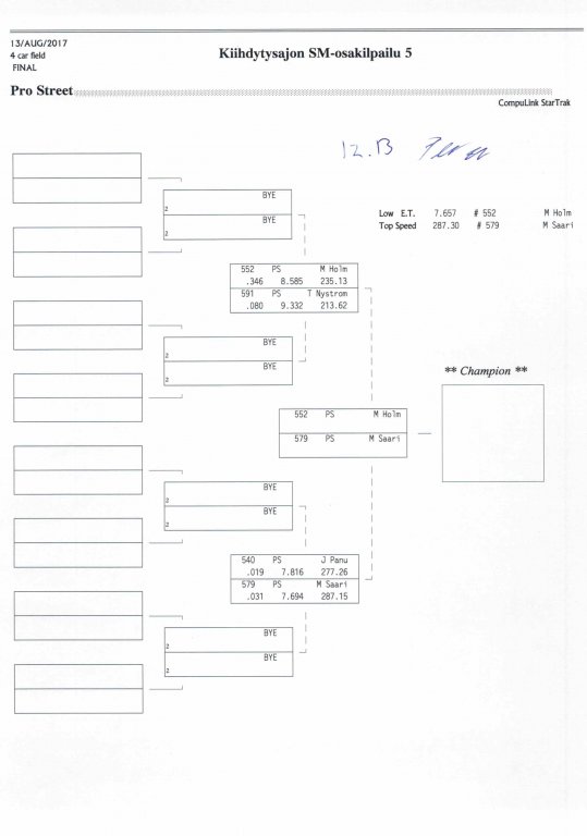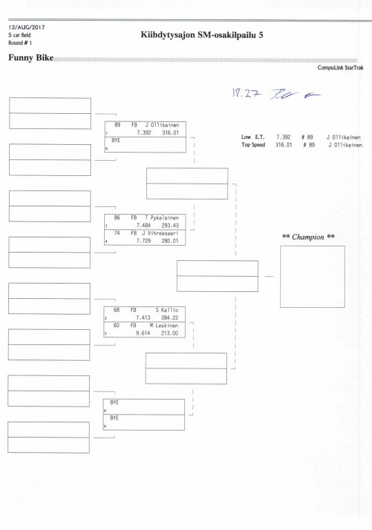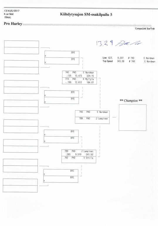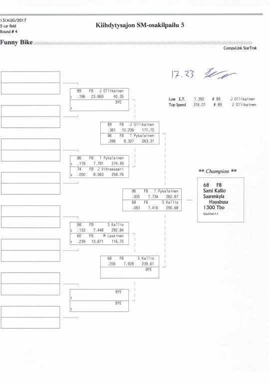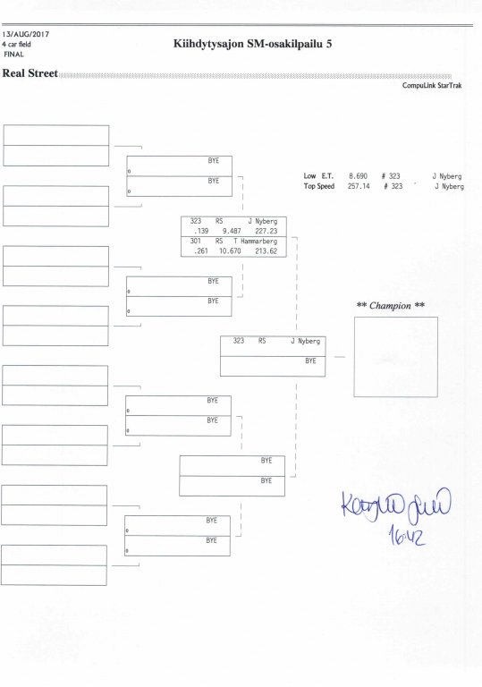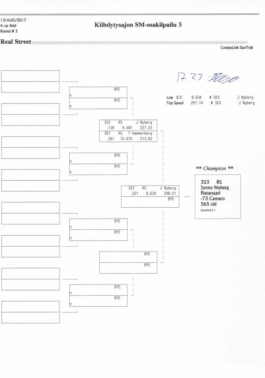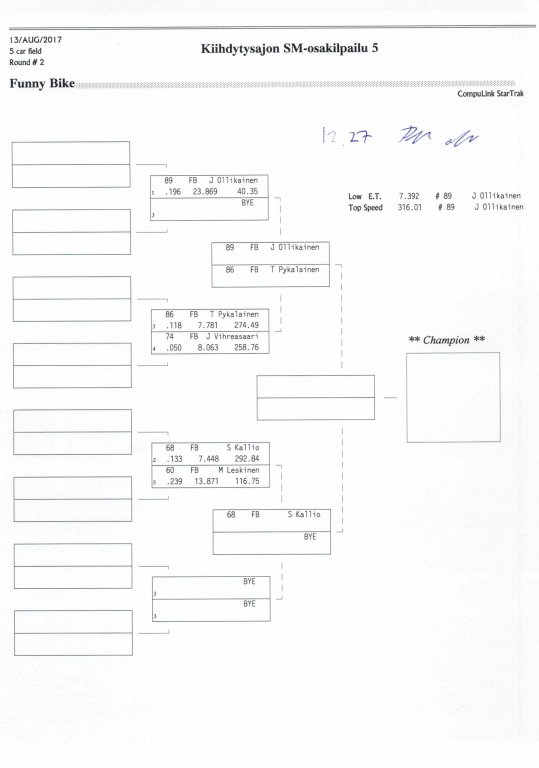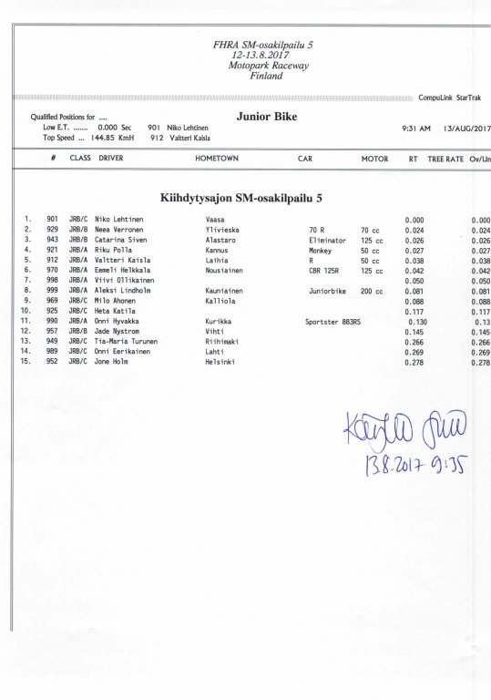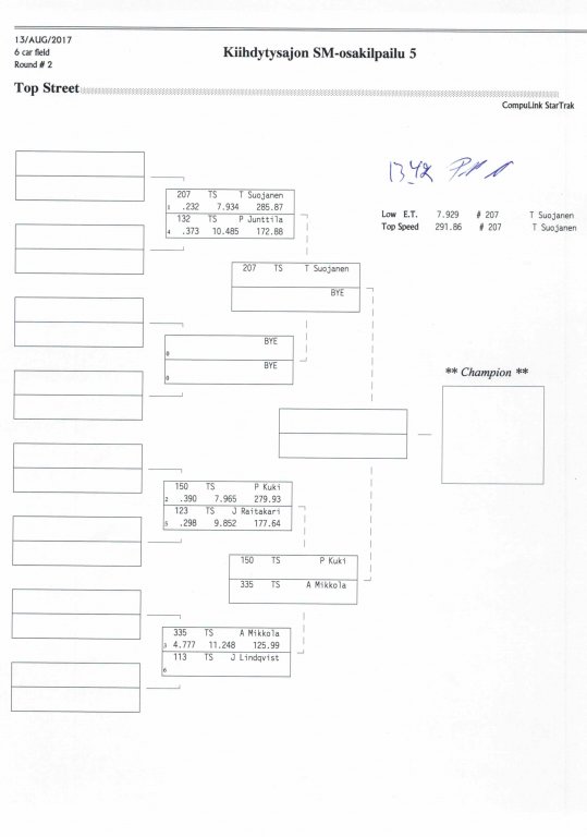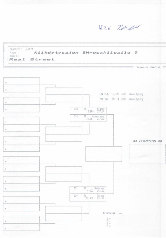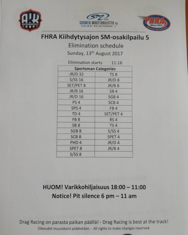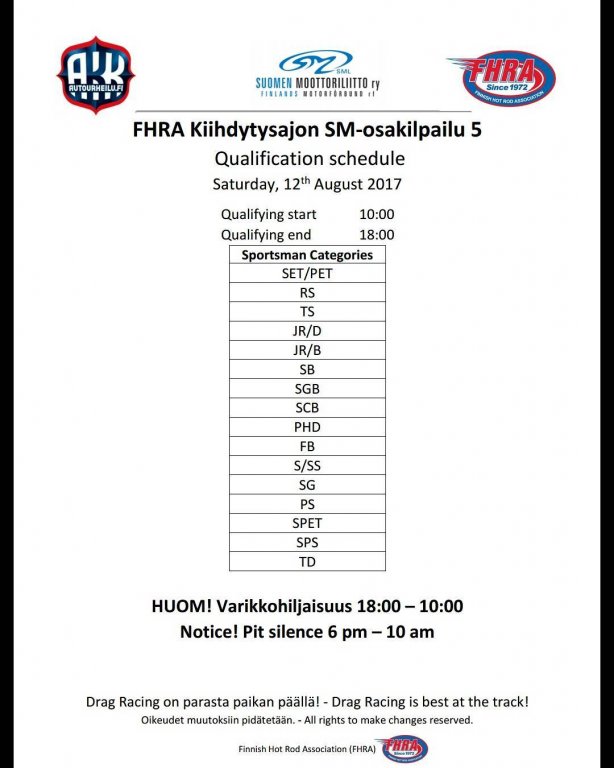 12.-13.8.2017 FHRA kiihdytysajon SM-osakilpailu 5, Motopark Motoparkintie 62, 77330 Pieksämäki Drag Race -kauden viides ja toiseksi viimeinen osakilpailu ajetaan Virtasalmen Motoparkissa. Suomen osalta Drag Race -kausi lähenee loppuaan ja taistelu pisteistä käy kuumana. Tule paikan päälle jännittämään kuinka kuljettajat pärjäävät taistelussa toisiaan vastaan. Ilmoittautuminen: http://www.dragracing.eu/index.asp Racekansaa rata-alueella ja sen ympäristössä viihdyttää FHRA:n oma race radio taajuudella 96,8 mhz. Tapahtuma aikataulu: La 10.00-18.00 – Lajitteluajot Su 11.00-17.00 Lajitteluajot Kilpailu striimataan FHRA:n Livestream-kanavalle: https://livestream.com/fhra Varikkokartat: Pääsyliput: Pääsyliput ennakkoon: 16€/päivä, 24€/kokoaikalippu Portilta: 20€/päivä, 30€/kokoaikalippu Alle 12-vuotiaat ilmaiseksi sisään aikuisen seurassa. Pääsyliput on nyt myynnissä Tiketissä. Hyvä asiakkaamme. Huomioithan, että Drag Racing kilpailu järjestetään säävarauksella. Sateen aikana ei turvallisuussyistä voida ajaa, sään salliessa ajoja jatketaan heti kun se vain on mahdollista. Emme palauta maksua lunastetuista lipuista, emmekä korvaa kadonneita lippuja. Emme vastaa alueella tapahtuneista henkilö- tai omaisuusvahingoista. Olet alueella omalla vastuulla. Lataa tapahtumajuliste tästä alta löytyvästä linkistä ja jaa se, jos haluat kertoa tapahtumasta muillekin. Rohkeimmat voivat, jos niin tahtovat, tulostaa aineiston ja laittaa vaikka lähikaupan ilmoitustaululle. Jos näin päätät tehdä, laitathan ilmoituksen esille niille tarkoitettuihin paikkoihin. Kiitos jo etukäteen. SM5A3_2017 Hyvä median edustaja. Voit ilmoittautua samalla lomakkeella vaikka kaikkiin tapahtumiin yhdellä kertaa. Drag Racing on parasta paikan päällä. Tervetuloa.