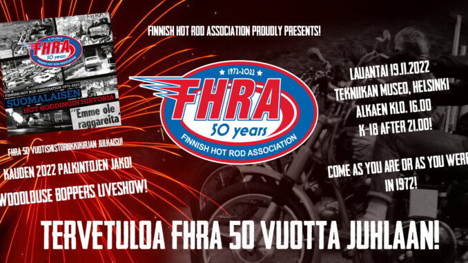 Puolivuosisataa sitten perustivat Mätäkukot Finnish Hot Rod Associationin. Nyt on aika juhlia ja nostaa maljat kerhon viisikymmenvuotisen taipaleen kunniaksi. Juhlapaikaksi on valikoitunut Helsingin Tekniikan museo. Vuosisadan karkeloissa julkaistaan FHRA historiakirja, jonka työstäminen on aloitettu jo syksyllä 2018. Livemusiikista vastaa Woodlouse Boppers. Tietäjät tietää ja luvassa kaksi settiä. Juhlallisuudet aloitetaan kauden 2022 Drag Race mestaruusjuhlallisuuksilla ja palkintojen jako seremonialla. Siihen perään jaetaan kerhon muutkin tunnustuspalkinnot. Tervetuloa juhlistamaan FHRA:n pitkää historiaa. Aika: Lauantai 19.11.2022, klo: 16.00 alkaen Paikka: Helsingin tekniikan museo, Energia Sali, Viikintie 1, 00520 Helsinki Suuntaa antava aikataulu: 15.30 Ovet aukeaa 16.00 Palkintojen jako alkaa 18:00 FHRA 50 vuotta tervetuliaispuhe ja tarjoilut alkaa 18.30 FHRA Historiikkikirjan julkaisu 21:00 Juhla muuttuu K-18-tilaisuudeksi 22.00 Woodlouse Boppers liveshow 23.40 Woodlouse Boppers liveshow 00.30 Pilkku, nyt on aika vetää viimeiset juhlabisset kitusiin 01.00 Bailut ohi Juhlalippuja rajoitettu määrä, olethan nopea. Pääsylippu oikeuttaa tarjoiluun. Liput myy Tiketti. HUOM. Palkittaville ja kutsuvieraille on lähetetty sähköpostitse kutsu juhlaan. Tarkistakaa sähköpostinne kutsun varalta. Vahvistattehan saapumisenne meille, niin osaamme varautua tuloosi. Pukukoodi Casual Lämpimästi tervetuloa. FHRA on sopinut majoitustarjouksesta juhlavieraille. Hotellitarjous juhlien ajankohtaan Holiday Inn Helsinki – Expo Aika 19.11.2022 – 20.11.2022 Huonetyppi Standard Hinta 99 € yhden hengen huone / vuorokausi Hinta 119 € kahden hengen huone / vuorokausi Huonetyyppi Standard. Huonehinnat sisältävät aamiaisen Jokainen majoittuja varaa huoneensa itse. Linkki verkkovarausjärjestelmään tässä: LINKKI. Varaukset voi tehdä myös varaustunnuksella ”FHRA Marketing Oy” myös puhelimitse tai sähköpostilla hotellin yhteystietoja käyttäen. Hotelli: Holiday Inn Helsinki – Expo Osoite Messuaukio 1, 00520 HELSINKI Puhelinnumero: 09 150 900 Sähköposti: expo@holidayinnhelsinki.fi Huoneet ovat varattavissa 5.11.2022 mennessä tai hotellin varaustilanteen mukaan.