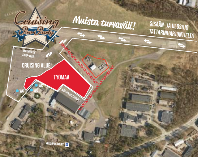 FHRA Cruising Pre-Party vol. 28 aluekarttaa. Olemme tehneet muutoksia ajojärjestykseen, viimekertaisen liikenneruuhkan takia. Ajatus on, että saamme jonot pois pääväyliltä ja cruisaajat mahdollisimman pian pois julkisen liikenteen alta. Kuuntelethan, liikenteenohjaajia, joita olemme saaneet lisää. Kiitos siitä kaikille vapaaehtoisille. Lisäksi hangaarin portti on nyt käytössämme ja olemme pyhittäneet sen vain ja ainoastaan FHRA:n jäsenille. Tuntuu hassulta, että emme ole tätä aikaisemmin tajunneet tehdä. Nyt teemme. FHRA:n jäsenet ovat meille erittäin tärkeitä ja haluamme näin osoittaa kuinka tärkeitä. Teille on varattu oma paikka ja ns. ohituskaista. Näytä FHRA:n jäsenkorttiasi liikenteenohjaajalle ja aja suorempaa reittiä alueelle. FHRA:lla on myös oma piste, jossa voit käydä jäsenyysasian hoitamassa kuntoon, jos jostain syystä et ole vielä FHRA:n jäsen. Tiskille olemme hoitaneet muutakin support-tuotetta. Käykää tukemassa kerhoa, jotta voimme jatkossakin tehdä näitä ilmaisiakin tapahtumia teille. Pidättehän edelleen etäisyyttä kanssaharrastajaan ja noudatatte liikenteenohjaajien opastusta. Pyrimme luomaan sellaiset puitteet harrastamiselle, että kaikkien on turvallista ja helppoa kokoontua asetusten mukaisesti. Muistakaa pitää turvaväliä, käyttäkää kasvomaksia, älkää parveilko liian lähekkäin ja käyttäkää tarjoamaamme käsidesiä, jota löytyy alueelta useammasta kohdasta. Finnish Hot Rod Association ry toivottaa kaikki harrastajat tervetulleeksi paikalle.