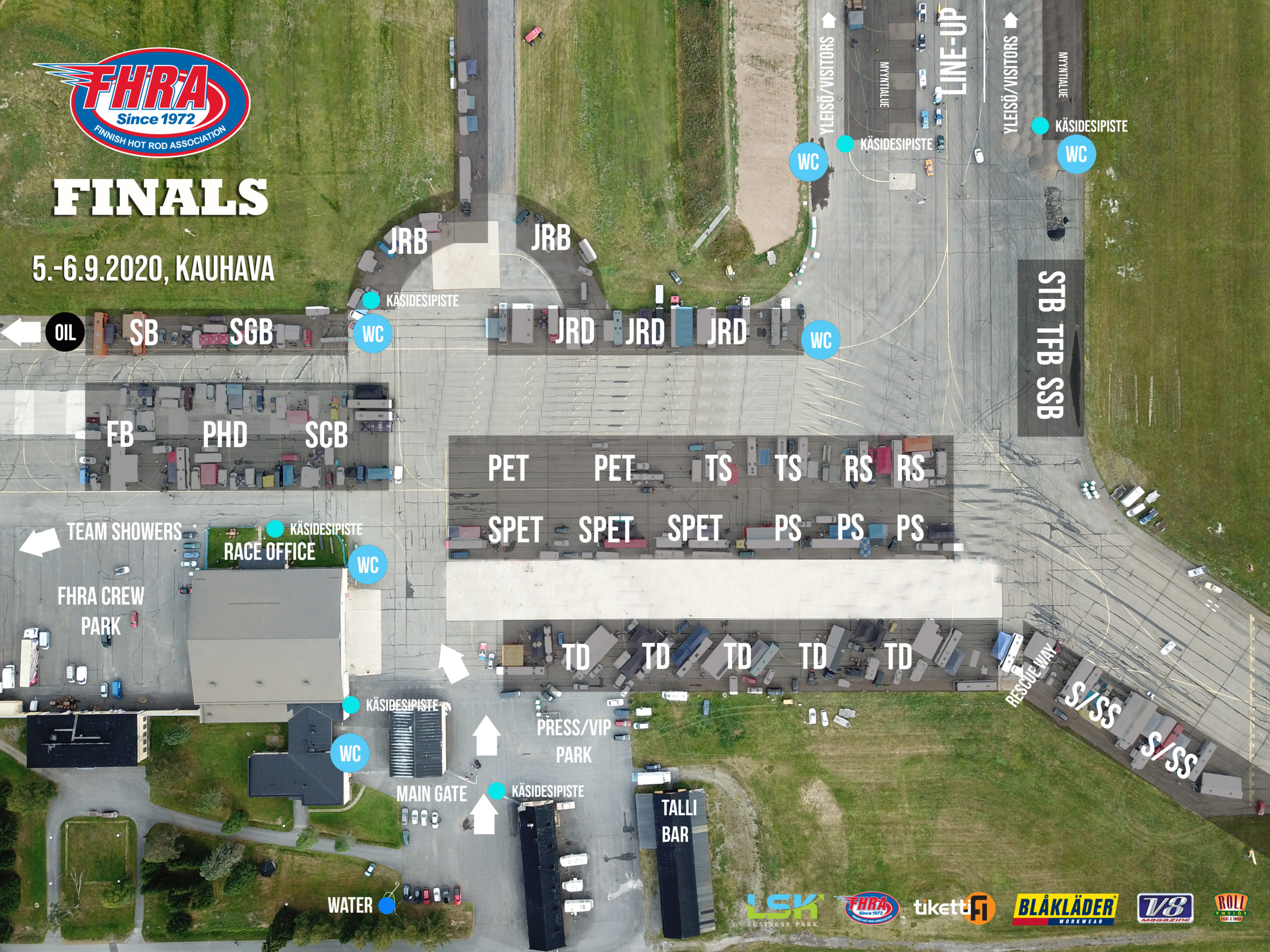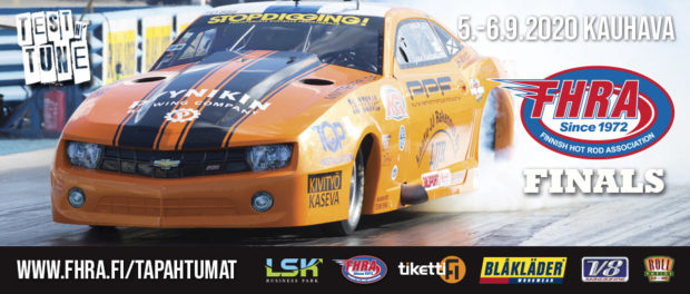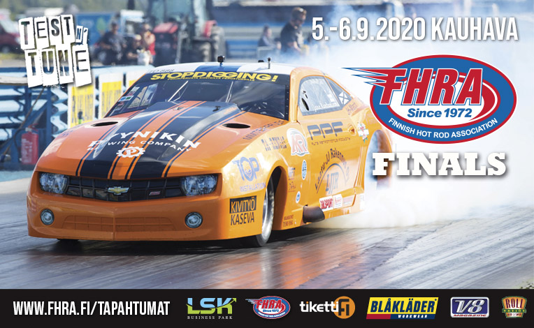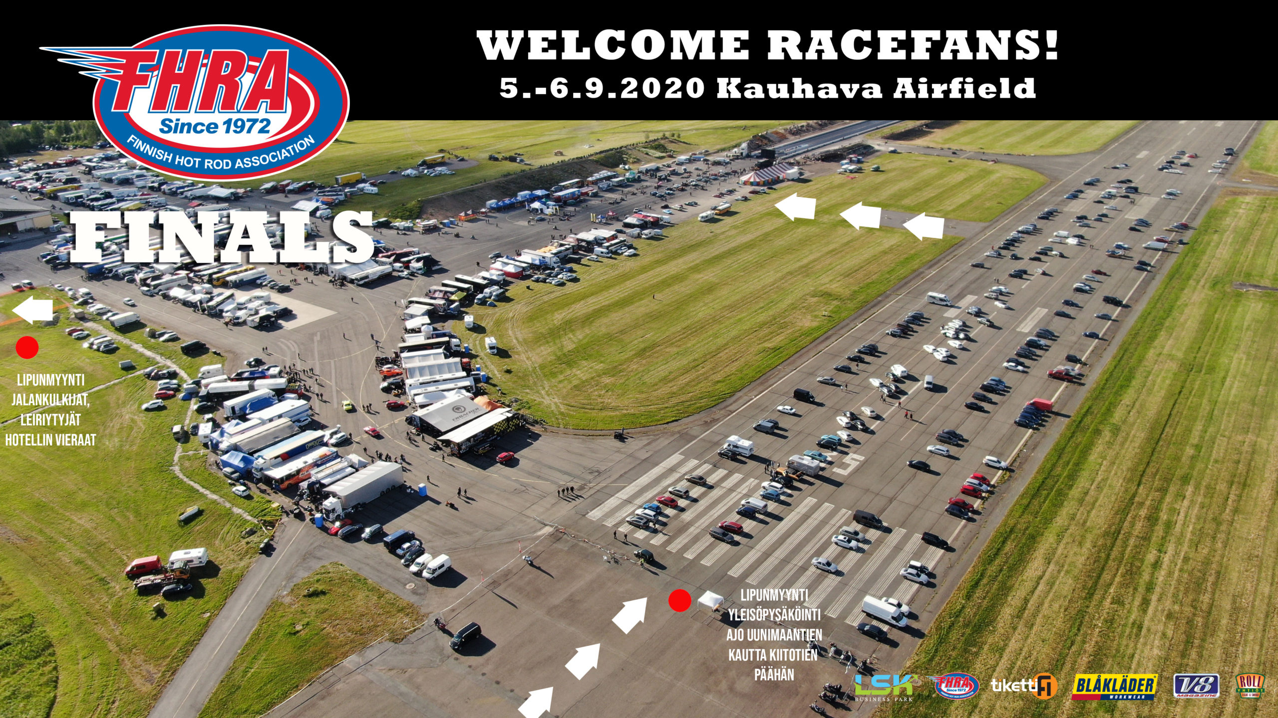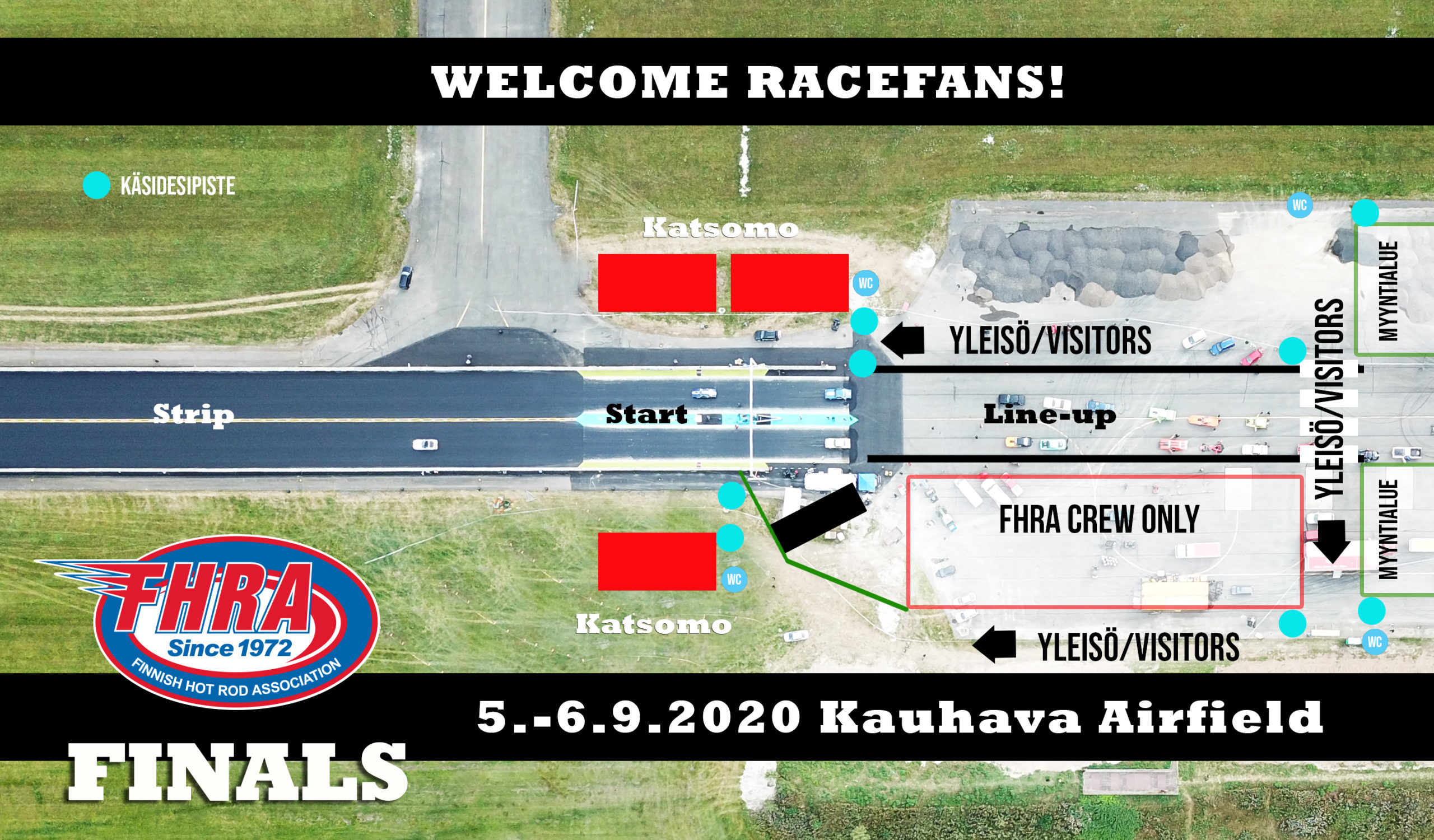 5.-6.9.2020, FHRA kiihdytysajon finaalit, LSK Business Park, Kauhava 4.9. FHRA Test n´Tune Ilmoittautuminen avoinna: http://www.dragracing.eu/index.asp WE ARE RACING AGAIN. Paikka: LSK Business Park, Loppusuora 22, 62200 Kauhava (Navigaattoriin Sotakouluntie) Aika: 5.-6.9.2020 klo: 10.00 alkaen Poikkeusvuosi päättyy poikkeusoloissa. FHRA kiihdytysajon finaalikisa ajetaan Kauhavan lentokentälle. Kilpailujärjestäminen on ollut tänä vuonna haastavampaa kun koskaan. Tilanteet on koronakevään aikana muuttuneet ja niihin on jouduttu reagoimaan hyvinkin nopealla aikajänteellä. Nyt on kuitenkin aika selvittää drag race -kauden 2020 suomenmestaruudet. Aloitamme viikonlopun Kauhavalla Test n´Tune testipäivällä. Testipäivälle voi osallistua kaikki halukkaat ja ilmoittautuminen tapahtuu dragracing.eu -kilpailijaportaalissa. Testipäivää voit tulla seuraamaan ilmaiseksi. Kilpailu striimataan FHRA:n Livestream-kanavalle: https://livestream.com/fhra Race-kansaa rata-alueella ja sen ympäristössä viihdyttää FHRA Race Radio taajuudella 89,1 mhz. Kauhava tarjoaa upeat puitteet lomailuun ja tekemistä riittää niin radalla kuin sen ympäristössä koko perheelle. Kauhavalle pääsee helposti niin junalla kuin autollakin. Kauhavan kiihdytysradan lähellä on kaikki Kauhavan kaupungin palvelut. Huvivaltio PowerPark kaikkine huvituksineen on vain 24 km päässä Yleisön majoittuminen: Leiriintyminen hoidetaan Lentohotellin kautta ja leiriytymisalueella on sähkö. Saunamahdollisuus löytyy myös kaikkina tapahtumapäivinä. Tiedustelut Lentohotellista koskien saunoja, suihkuja ja majoittumista. Alueella on myös muita suihkutiloja. info@lentohotelli.fi 050-4637515 Verkkosivut: https://www.lentohotelli.fi/ facebook: https://www.facebook.com/lentohotelli/ Aikataulu: Testipäivän aikataulu: Perjantai 10.00-18.00 Kilpailun aikataulu: Lauantai 10.00-18.00 – Lajitteluajot Sunnuntai 11.00-17.00 – Pudotusajot Pääsyliput: Alle 18-vuotiaille ilmainen pääsy tapahtumaan. Kaikki liput vaihdetaan rannekkeisiin portilla. Ikäraja: Ikärajaton, alle 12-vuotiaat vain huoltajan seurassa. Päivälippu: 20 € Kokoaikalippu: 30 € Sisältää katsomopaikan ja pysäköinnin. Pääsylippuja voi ostaa myös tapahtuma-alueen porteilta. PÄÄSYLIPUT MYYNNISSÄ NYT TIKETISSÄ. Hyvä asiakkaamme. Huomioithan, että Drag Racing kilpailu järjestetään säävarauksella. Sateen aikana ei turvallisuussyistä voida ajaa, sään salliessa ajoja jatketaan heti kun se vain on mahdollista. Emme palauta maksua lunastetuista lipuista, emmekä korvaa kadonneita lippuja. Emme vastaa alueella tapahtuneista henkilö- tai omaisuusvahingoista. Olet alueella omalla vastuulla. Aluekarttoja: Päivittyy pian. Yleisöparkkiin ajo KT63 (Kauhava-Ylivieska) varrelta, tarkka osoite on Uunimaantie 55. Yleisöpysäköinnin luona lipunmyynti. Pääsylippuun sisältyy pysäköinti ja katsomopaikka. Toinen lipunmyynti on auki hotellin puolella, tarkoitettu jalankulkijoille ja hotellivieraille. Tervetuloa. Tapahtuma-alueen kartat ja suunnitelmat on tehty THL:n sekä STM:n ohjeistusten mukaan. Olemme suunnitelleet tapahtuma-alueen siten, että yleisön ja tiimien terveys on etusijalla. Muistathan pitää etäisyyttä muihin kisakatsojiin. Varikko on avoin yleisölle, mutta pyydämme huomiomaan THL:n suositukset turvaväleistä, maskeista ja hygieniasta yleisötapahtumassa. Tapahtuma-alueelle on tarjolla käsidesiä, jota toivomme teidän käyttävän. Kiitos. Ilmoittautuneiden lista: FHRA Finals 2020 on www.dragracing.eu Tuloksia: FHRA Varikko: 0400 242892 fhravarikko@gmail.com Varikkokartat: Päivittyy pian. Hyvä median edustaja. Voit ilmoittautua samalla lomakkeella vaikka kaikkiin tapahtumiin yhdellä kertaa. Lataa tapahtumajuliste tästä alta löytyvästä linkistä painotuotteena tai yllä oleva .jpg-kuva ja jaa se, jos haluat kertoa tapahtumasta muillekin. Rohkeimmat voivat, jos niin tahtovat, tulostaa aineiston ja laittaa vaikka lähikaupan ilmoitustaululle. Jos näin päätät tehdä, laitathan ilmoituksen esille niille tarkoitettuihin paikkoihin. Kiitos jo etukäteen. SMfinaali_A3_2020 Drag Racing on parasta paikan päällä. Tervetuloa.