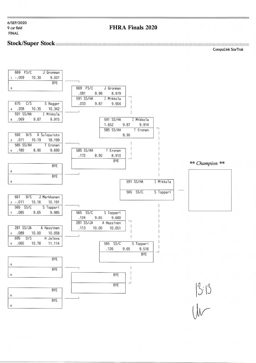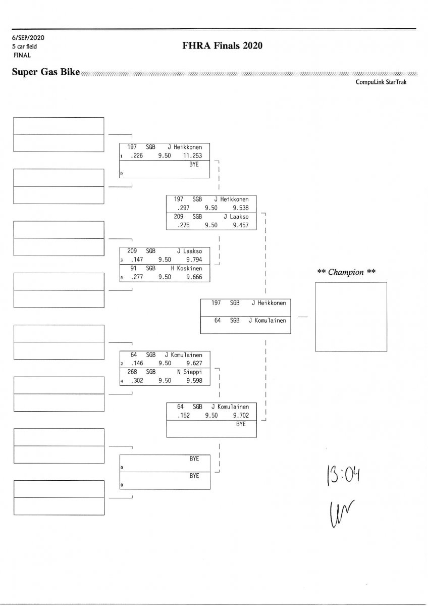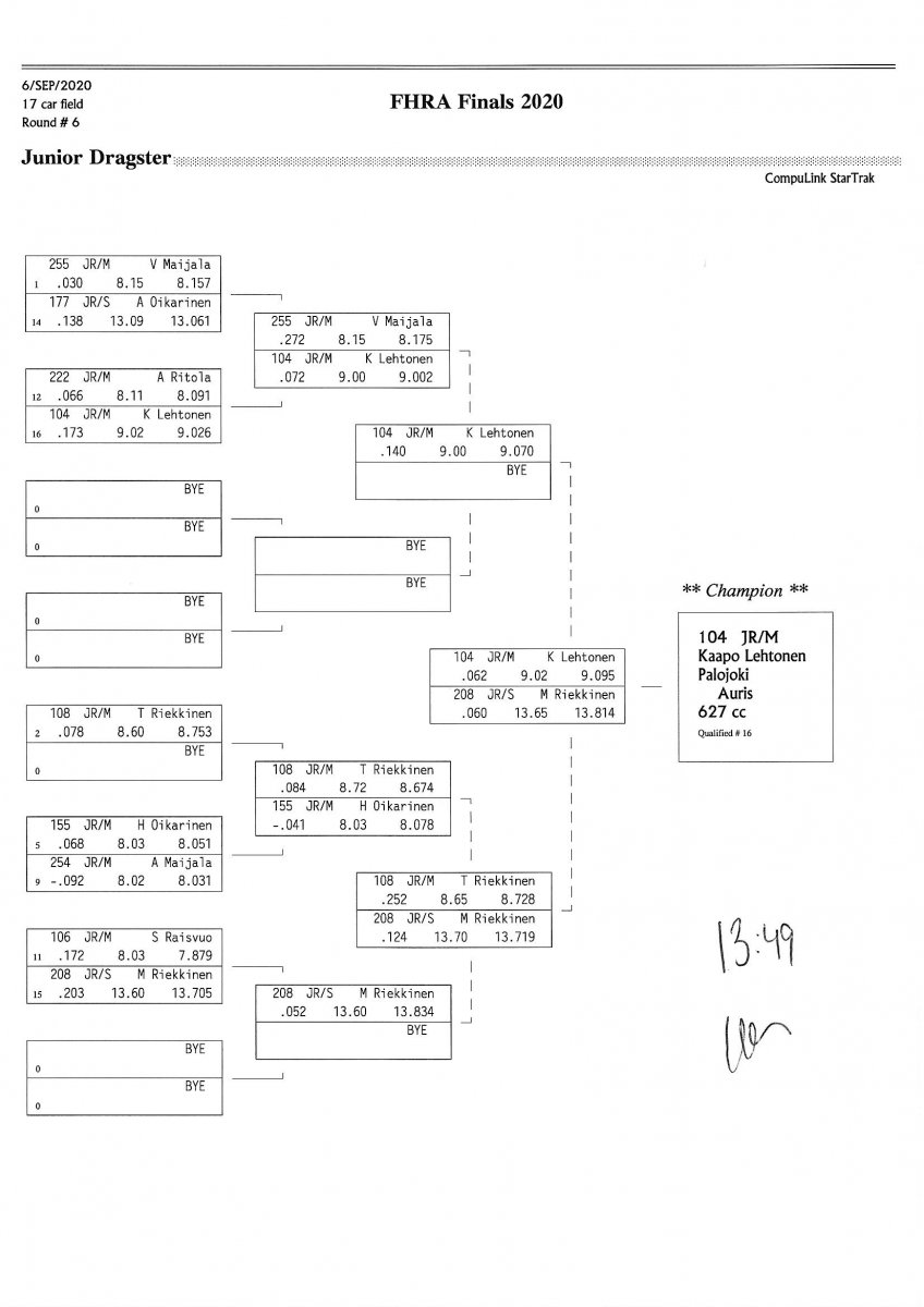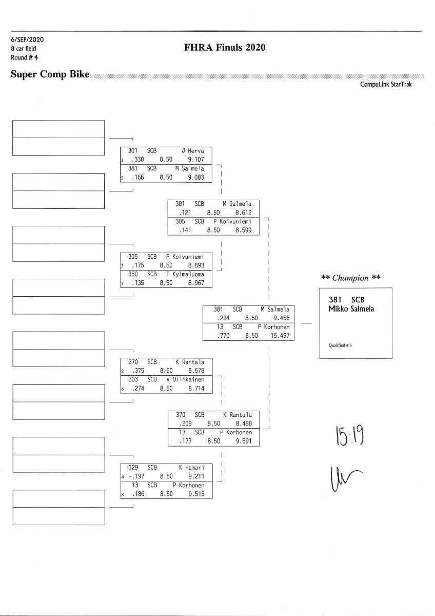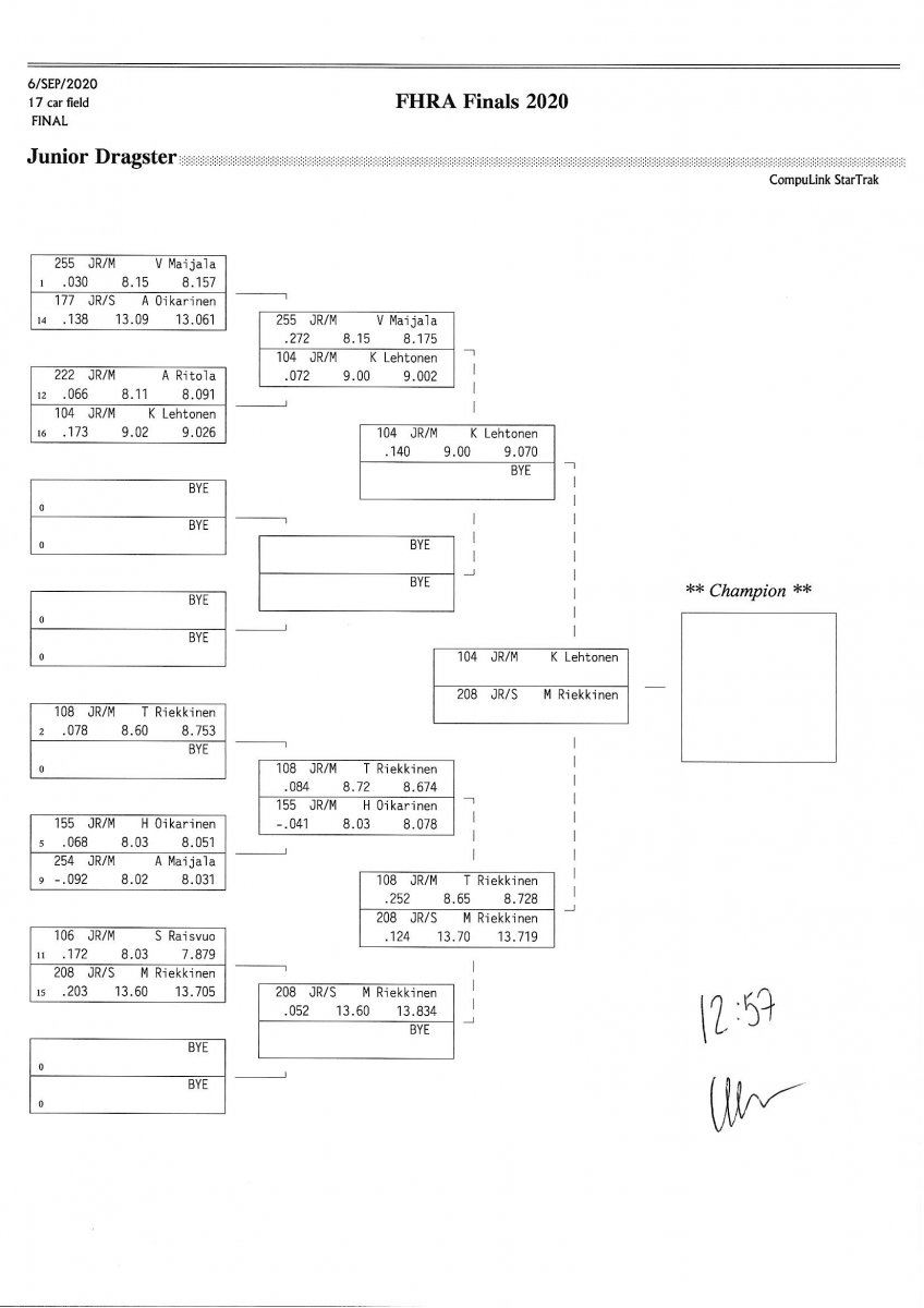 Junior Dragster: Kaapo Lehtonen Junior Bike: Eemeli Helkkala Pro ET: Rasmus Koivula Pro Street: Ossi Oikarinen Street Bike: Juha Erälähde Funnybike: Juha Ollikainen Top Fuel Bike: Mikko Rajaniemi Super Pro ET: Janne Söderqvist Super Gas Bike: Juha Komulainen Super Comp Bike: Mikko Salmela Pro Harley: Emmi Nordman Top Street: Pauli Kuki Real Street: Kenneth, Mattfolk Stock/Super Stock: Iiro Mikkola Top Doorslammer: Jere Rantaniemi Kuvat: TMu Photography TMu Photography