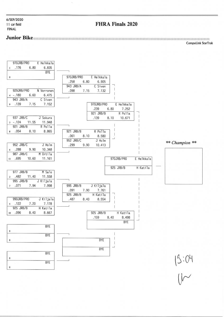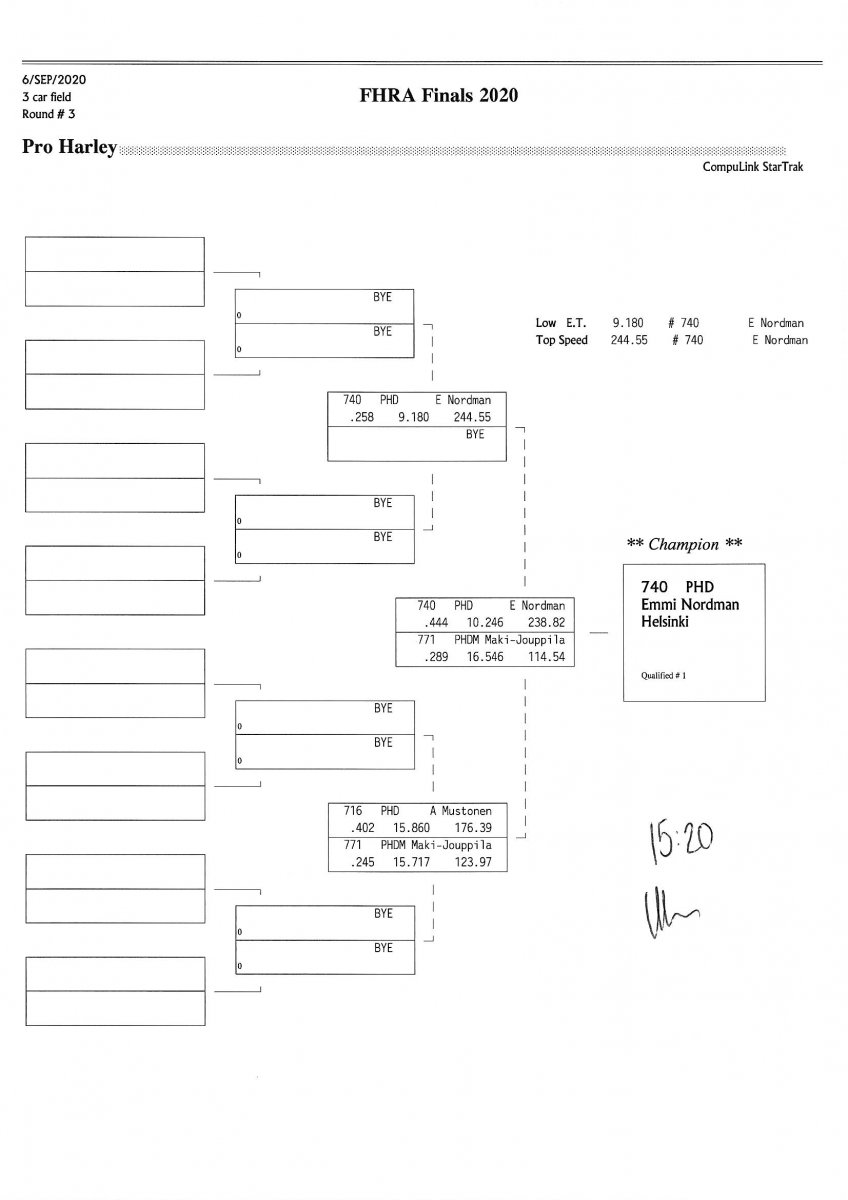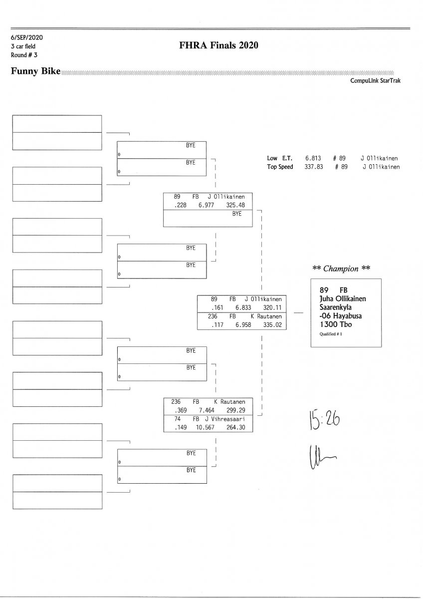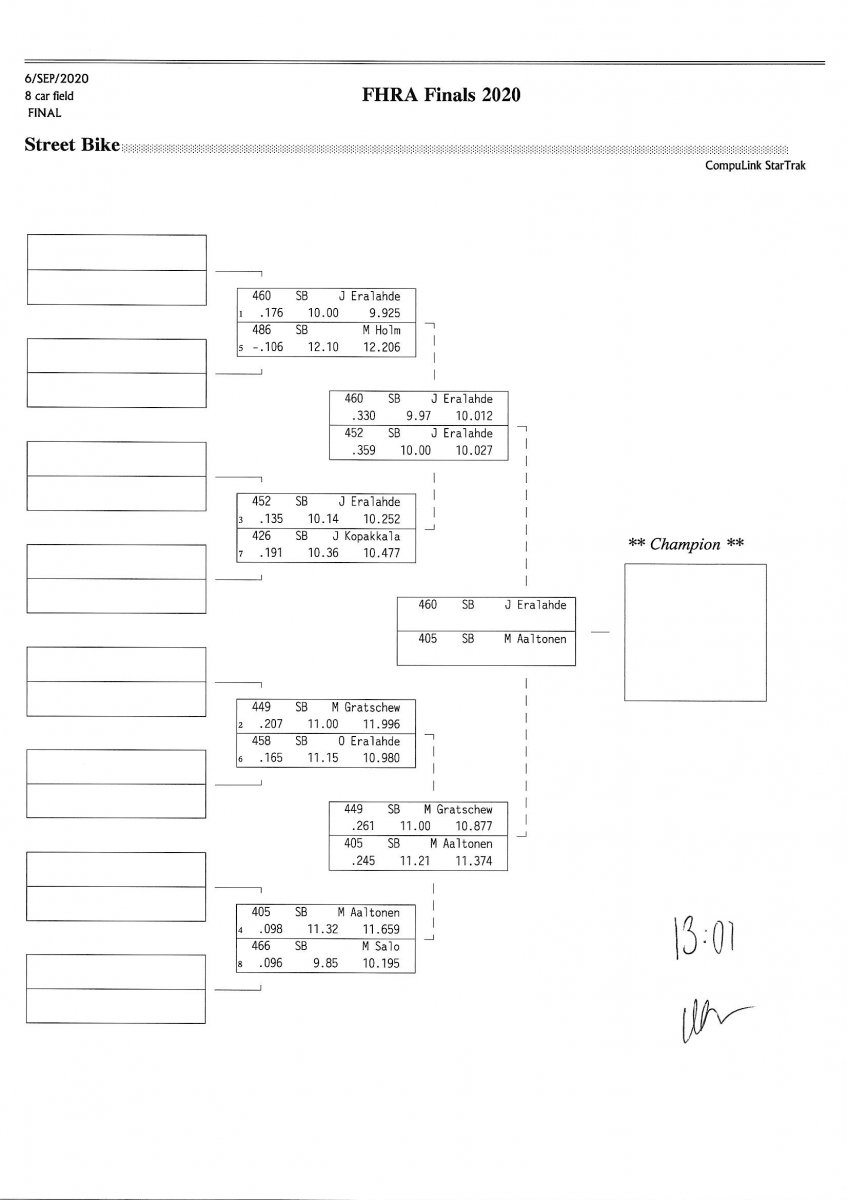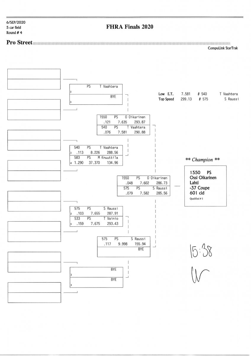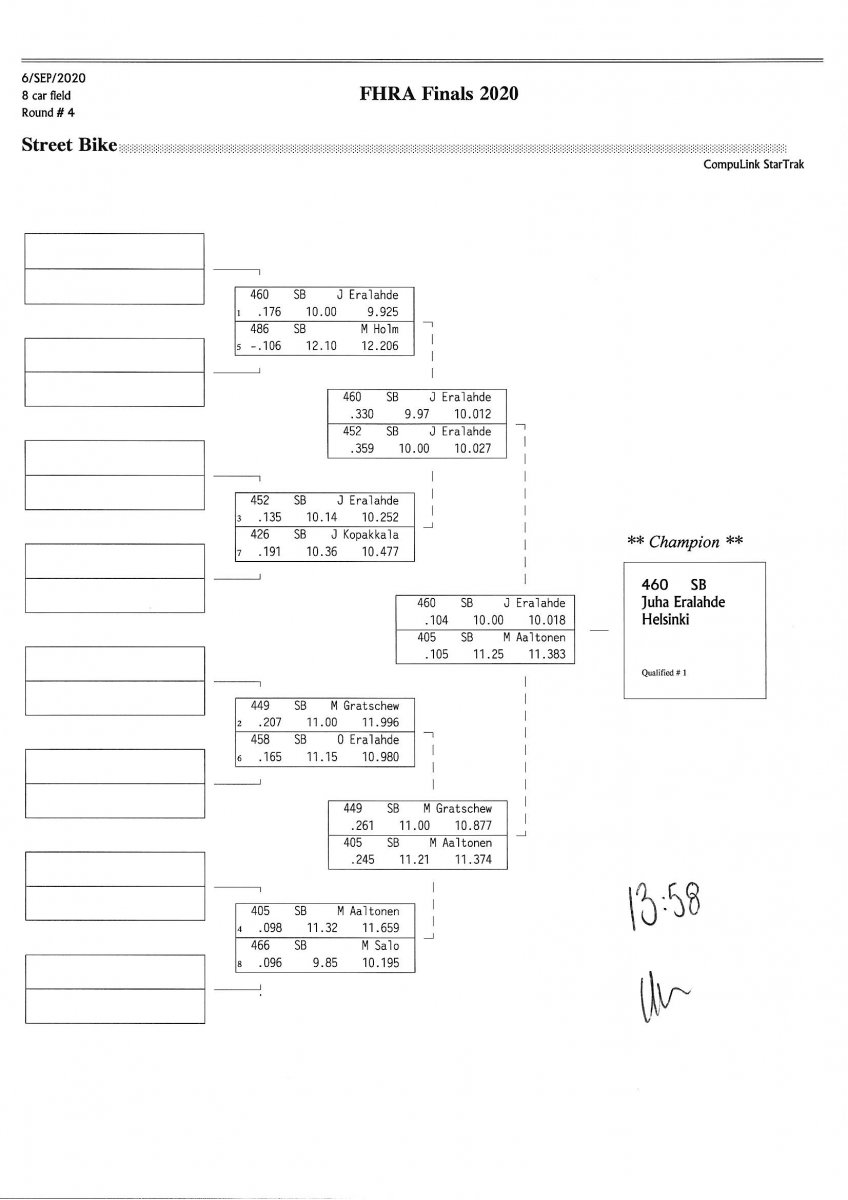 Junior Dragster: Kaapo Lehtonen Junior Bike: Eemeli Helkkala Pro ET: Rasmus Koivula Pro Street: Ossi Oikarinen Street Bike: Juha Erälähde Funnybike: Juha Ollikainen Top Fuel Bike: Mikko Rajaniemi Super Pro ET: Janne Söderqvist Super Gas Bike: Juha Komulainen Super Comp Bike: Mikko Salmela Pro Harley: Emmi Nordman Top Street: Pauli Kuki Real Street: Kenneth, Mattfolk Stock/Super Stock: Iiro Mikkola Top Doorslammer: Jere Rantaniemi Kuvat: TMu Photography TMu Photography