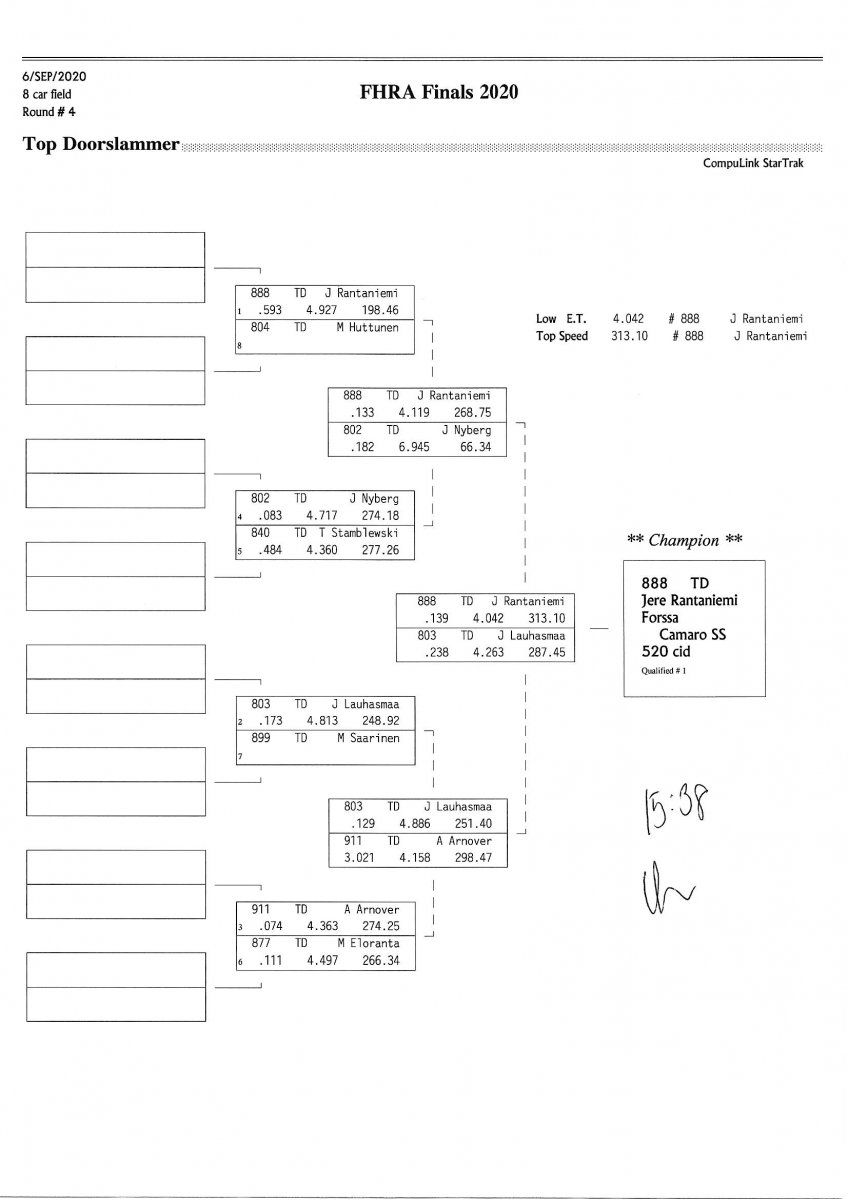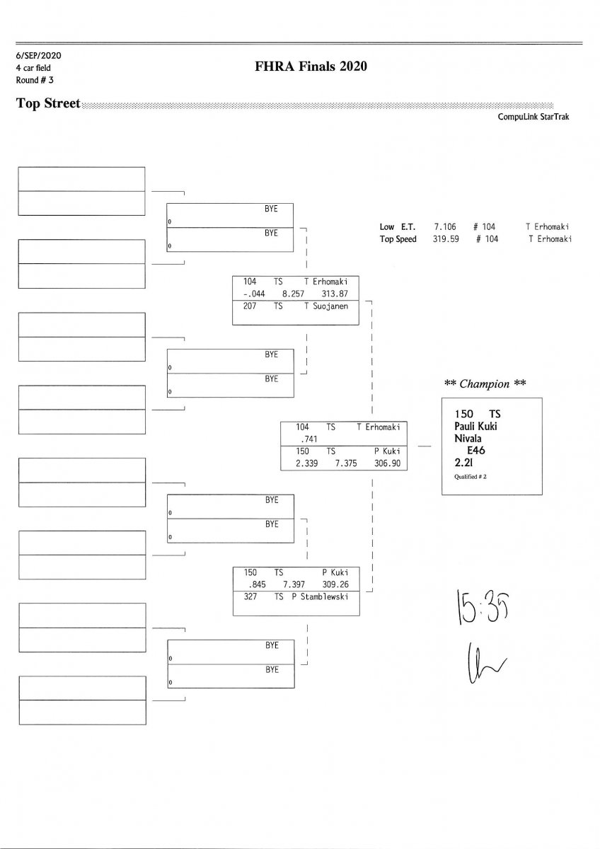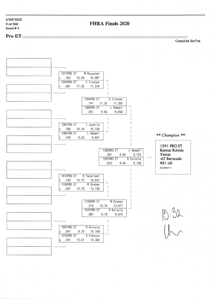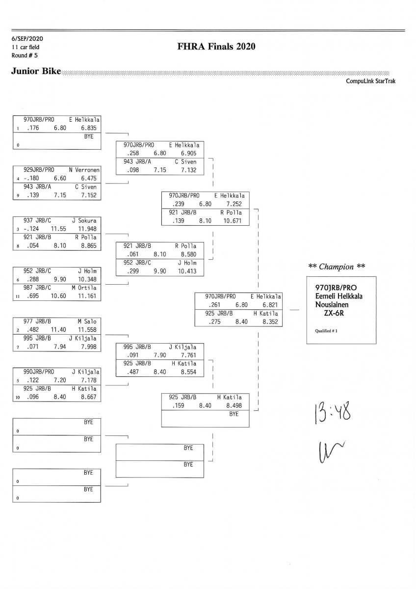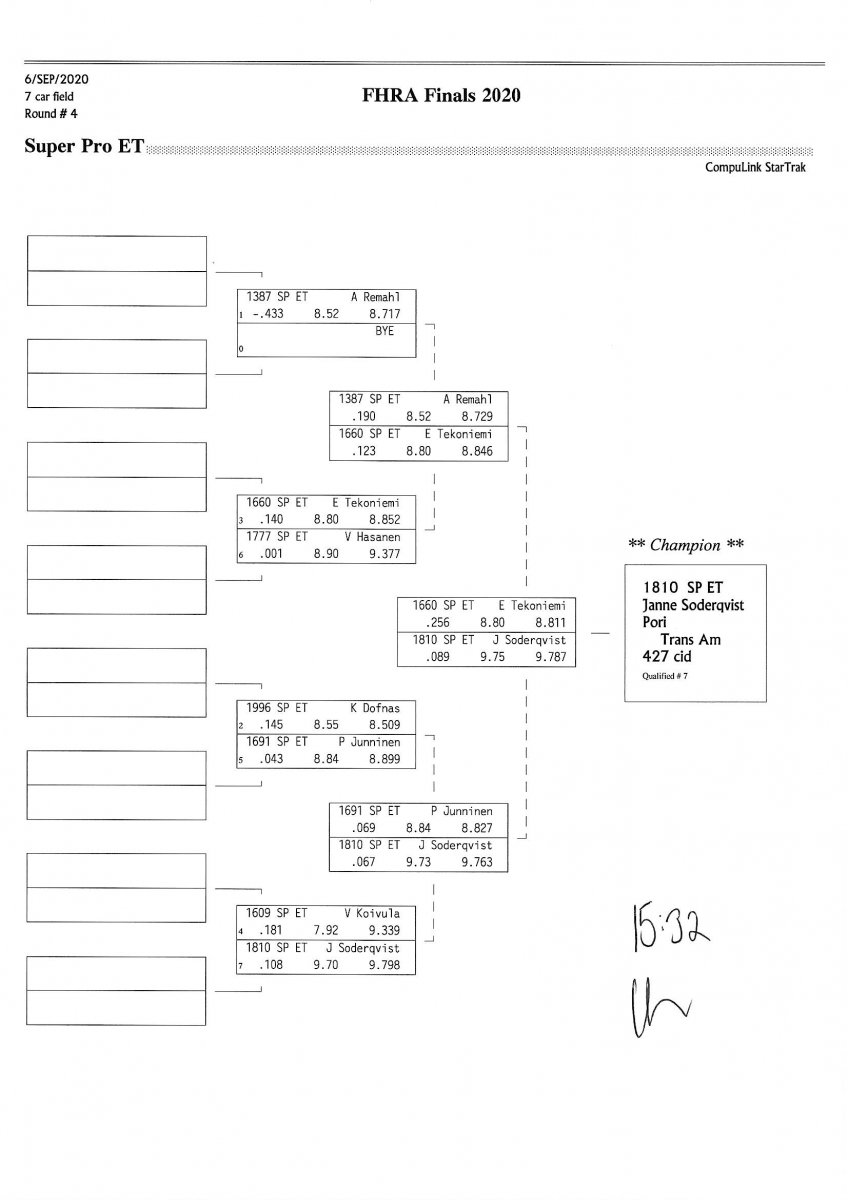 Junior Dragster: Kaapo Lehtonen Junior Bike: Eemeli Helkkala Pro ET: Rasmus Koivula Pro Street: Ossi Oikarinen Street Bike: Juha Erälähde Funnybike: Juha Ollikainen Top Fuel Bike: Mikko Rajaniemi Super Pro ET: Janne Söderqvist Super Gas Bike: Juha Komulainen Super Comp Bike: Mikko Salmela Pro Harley: Emmi Nordman Top Street: Pauli Kuki Real Street: Kenneth, Mattfolk Stock/Super Stock: Iiro Mikkola Top Doorslammer: Jere Rantaniemi Kuvat: TMu Photography TMu Photography
