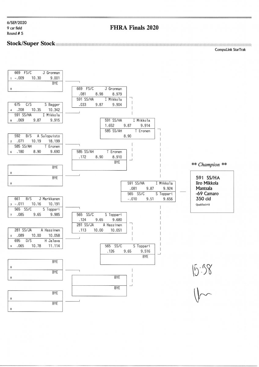 Kiihdytysajon suomenmestarit ratkottiin Kauhavalla viikonloppuna. Posted on 6.9.2020 in Drag Racing Jere Rantaniemi Tiedote 6.9.2020 JULKAISUVAPAA FHRA drag race kauden finaalikisa, FHRA Finals ajettiin LSK Business Parkissa 5.-6.9.2020. Syksyn ollessa jo ovella, oli säätiedotukset ennen kisaviikonloppua kovin syksyiset. Kilpailua edeltävä perjantain testipäivänä päästiin kuitenkin ajamaan useampi rundi. Rata oli saatu hyvään kuntoon, mutta kylmä sää piti radan kylmänä, joten edellisen kisan huippulukemia ei vielä nähty. Kova sade pilasi testipäivän ajoja urakalla ja yö oli myös sateinen ja kolea. Lauantain lajittelupäivä oli sateen vuoksi katkonainen. FHRA:n rataryhmä joutui kahteen otteeseen tekemään täyden kuivauksen. Epävakaisesta säästä huolimatta saimme nauttia huippuajoista ja reippaasta kilvanajosta. Kaikkiaan saimme ajettua kolme kokonaista lajittelukierrosta. Lauantaina pidimme hiljaisen hetken tapaturmassa menehtyneen Sami Mannermaan muistolle. Sami oli paikallinen yrittäjä ja suuri apu, kun Kauhavan rataa alettiin rakentaa ja hän on avustanut FHRA:ta kisatouhuissa paljon. FHRA ottaa osaa omaisten suruun. Kilpailujohto päätti aloittaa sunnuntain jo kymmeneltä sadeuhkan vuoksi. Päivä aloitettiin suoraan pudotusajoilla, koska säätiedotus lupasi sadekuuroja. Eliminaatiot ajettiin hyvään tahtiin ja finaalitauon jälkeen ehdittiin ajaa junnuryhmät ja Street Bike-ryhmän finaalit. Street Bike -lähdössä voiton vienyt Juha Erälähde valitettavasti kaatui maalissa. Erälähde on kuitenkin kunnossa hyvien varusteiden ansiosta. Finaalikierroksen katkaisi pian kaatumisen jälkeen kova sadekuuro. Onneksemme tuuli vei sadepilvet pois ja auringon ja FHRA:n suihkumoottorilla varustetulla kuivurin ansiosta, rata saatiin taas ajokuntoon reilussa tunnissa. Finaalit jatkuivat vauhdikkaasti uusien sateiden jo siintäessä taivaanrannassa. Erittäin vaikea korona-kausi saatiin kuitenkin ajettua kolmella kilpailulla ja meillä on poikkeusvuodellekin suomenmestarit. Kauhavan rata tuotti taas uusi ennätyksiä. Kuskien omat ennätykset paukkuivat monissa ryhmissä ja Ollikaisen Juha uusi taas Suomen ennätysajan, ja Jere Rantaniemi ajoi Top doorslammer-ryhmän suomen ennätysajan. Tarkempia aikoja löytyy keskustelupalstaltamme: FHRA uutiset - FHRA Finals 5.-6.9.2020 Valtava kiitos FHRA Crew ja lukuisat vapaaehtoiset, jotka auttoivat tapahtuman läpiviennissä. Kiitos LSK Business Park ja kaikki yhteistyökumppanit. FHRA livestream taltioi viikonlopun kilpailun. Katso tallenne täältä: FHRA - Finnish Hot Rod Association Kauden finaalikilpailun pisteet kiihdytysajossa on nyt jaettu. Pistetilanne päivittyy pian verkkosivuillamme. Lopulliset SM-pisteet löytyvät täältä: SM-pisteet | FHRA ry Seuraavaksi tapahtuu Malmilla. Malmi Show & Go Power Festival. Katukiihdyttelyä, näyttely ja kaikkea kivaa. Tervetuloa. Mikko Rajaniemi FHRA Finals 2020 tulokset: Autot Junior Dragster Kaapo Lehtonen, Palojoki Minna Riekkinen, Ruuhimäki Pro ET Rasmus Koivula, Vantaa Lotta Remahl, Klaukkala Super Pro ET Jannne Söderqvist, Pori Emilia Tekoniemi, Real Street Kenneth, Mattfolk, Kristiinankaupunki Rauli Rautio, Lappeenranta Top Street Pauli Kuki, Nivala Timo Erhomäki, Jyväskylä Stock/Super Stock Iiro Mikkola, Mäntsälä Sami Toppari, Koskenkorva Pro Street Ossi Oikarinen, Lahti Seppo Raussi, Vantaa Top Doorslammer Jere Rantaniemi, Forssa Jaakko Lauhasmaa, Seinäjoki Moottoripyörät Junior Bike Eemeli Helkkala, Nousiainen Heta Katila, Seinäjoki Street Bike Juha Erälähde, Helsinki Miika Aaltonen Super Gas Bike Juha Komulainen, Kerava Jani Heikkonen, Valkeala Super Comp Bike Mikko Salmela, Rovaniemi Piia Korhonen, Saarenkylä Pro Harley Emmi Nordman. Helsinki Martti Mäki-Jouppila Funnybike Juha Ollikainen, Saarenkylä Kari Rautanen, Espoo Super Street Bike Vesa Ruhanen, Taivalsalo Ida Zetterström, Jomala Top Fuel Bike Mikko Rajaniemi, Alavieska Samu Kemppainen, Vantaa Kiihdytysajoissa ajetaan parilähtöjä loppuun saakka. joten jäljelle jää vain voittaja (1) ja toisena tullut runnerup (2) Drag racing on parasta paikan päällä. Junior Bike 1. Eemeli Helkkala, Nousiainen 2. Heta Katila, Seinäjoki Junior Dragster 1. Kaapo Lehtonen, Palojoki 2. Minna Riekkinen, Ruuhimäki Street Bike 1. Juha Erälähde, Helsinki (Kuvassa Jouni Erälähde) 2. Miika Aaltonen Super Gas Bike 1. Juha Komulainen, Kerava 2. Jani Heikkonen, Valkeala Super Comp Bike 1. Mikko Salmela, Rovaniemi 2. Piia Korhonen, Saarenkylä Pro Harley 1. Emmi Nordman. Helsinki 2. Martti Mäki-Jouppila Pro ET 1. Rasmus Koivula, Vantaa 2. Lotta Remahl, Klaukkala Real Street 1. Kenneth, Mattfolk, Kristiinankaupunki (Kuvassa) 2. Rauli Rautio, Lappeenranta Top Street 1. Pauli Kuki, Nivala 2. Timo Erhomäki, Jyväskylä Super Pro ET 1. Jannne Söderqvist, Pori 2. Emilia Tekoniemi Pro Street 1. Ossi Oikarinen, Lahti 2. Seppo Raussi, Vantaa Stock/Super Stock 1. Iiro Mikkola, Mäntsälä 2. Sami Toppari, Koskenkorva Top Doorslammer 1. Jere Rantaniemi, Forssa 2. Jaakko Lauhasmaa, Seinäjoki Funnybike 1. Juha Ollikainen, Saarenkylä 2. Kari Rautanen, Espoo Super Street Bike 1. Vesa Ruhanen, Taivalsalo 2. Ida Zetterström, Jomala Teksti: FHRA tiedotus Kuvat: TMu Photography TMu Photography