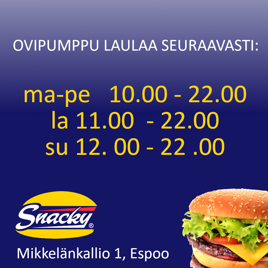 Snacky – Mikkelänkallio 1, 02770 Espoo Snacky tunnetaan legendaarisista Poliisi, Pressa, Taksi ja Kerros hampurilaisista. Snackyn tuotteet valmistetaan ehdottoman ensiluokkaisista ja laadukkaista raaka-aineista. Hampurilaisemme ovat muhkeita, reiluja, täyttäviä ja ennen kaikkea maukkaita. Pihveissä käytämme ainoastaan täyslihatuotteita, tomaattiviipaleet leikkaamme itse mehevistä pihvitomaateista. Hampurilaiset kruunaa Snackyn omalla salaisella reseptillä valmistettu Royal -kastike. Aukioloajat: MA-PE 10-22, LA 11-22, SU 12-22 Osoite: Mikkelänkallio 1, 02770 Espoo Some: Instagram | Facebook | Twitter Kotisivu: snacky.fi Sähköposti: info@snacky.fi Kyselijöille tiedoksi, että kyllä löytyy Heavy Monster. … ja muistakaa, että Poliisissa on edelleenkin munaa. Huom. Espoo Cruising joka kuun TOINEN perjantai, jolloin esim. kaikille ilmaiset kahvit.
