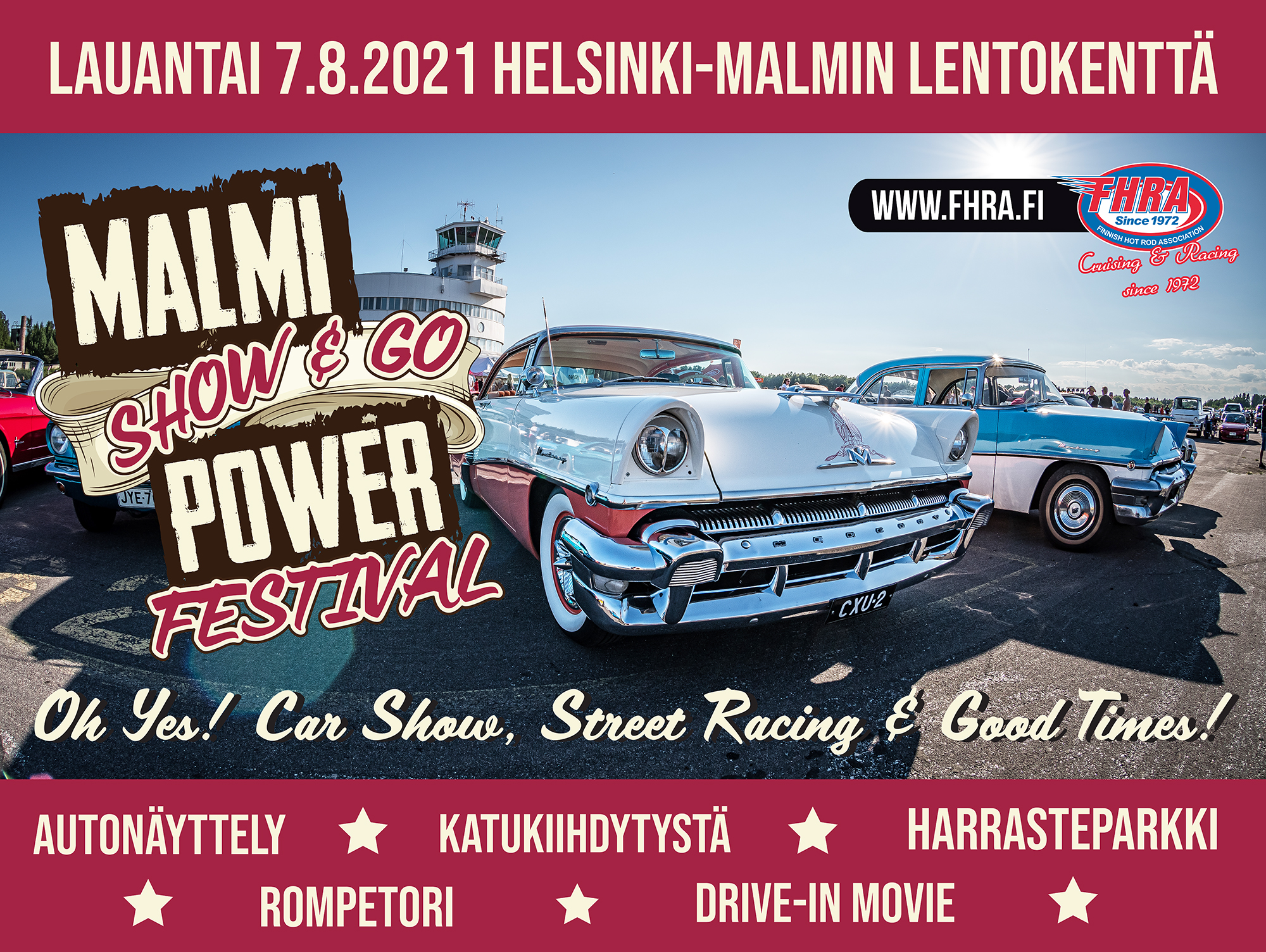 Lauantaina 7.8.2021 klo. 10.00–18.00 Malmi Show & Go Power Festival 2021. Toista kertaa järjestettävä tapahtuma on koko perheen pärinäpäivä. FHRA:n järjestämä Suomen vanhin ajoneuvonäyttely American Car Show on jouduttu siirtämään nyt jo kaksi kertaa koronapandemian vuoksi. Tapaamme nyt pienemmissä puitteissa ja lentokenttäalueella, jonne voimme kokoontua terveysturvallisemmin. FHRA ry pitää päämajaansa Malmin lentokentän terminaalirakennuksessa ja näyttely pidetään lentokonehangaarissa. Ajoneuvonäyttely, katukiihdytystä katulaillisilla ajoneuvoilla kiitoradalla, swap, harrasteparkki, FHRA jäsenkerhoja ja kisatiimejä esittelemässä toimintaansa. paikan päällä ruokakojuja ja muita virvokkeita. Koko kentän täydeltä säpinää. Lapset alle 12-vuotiaat ilmaiseksi huoltajan seurassa. Liput ennakkoon Tiketistä tai portilta. 20 €, ilmainen pysäköinti. Tiketin myyntisivulle: Malmi Show & Go Power Festival 2021 | Osta lippu helposti | Tiketti Lisäinfot: Malmi Show & Go Power Festival – FHRA ry Facebook: Illan kruunaa tapahtuman päätyttyä Drive-in elokuvaesitys ilman erillistä veloitusta. Elokuvana American Graffiti ja FHRA:n jäsenille on ilmaiset popcornit luvassa. Videolla tunnelmia viime vuoden tapahtumasta. Videon meille tuotti Soldeman Oy. Malmi Show & Go Power Festival 2021 Paikka: Helsinki-Malmin Lentoasema, 00700 Helsinki Tapahtuma-aika: 10.00–18.00 Leffanäytös: 20.00 alkaen Lämpimästi tervetuloa. FHRA – Racing and cruising since 1972.