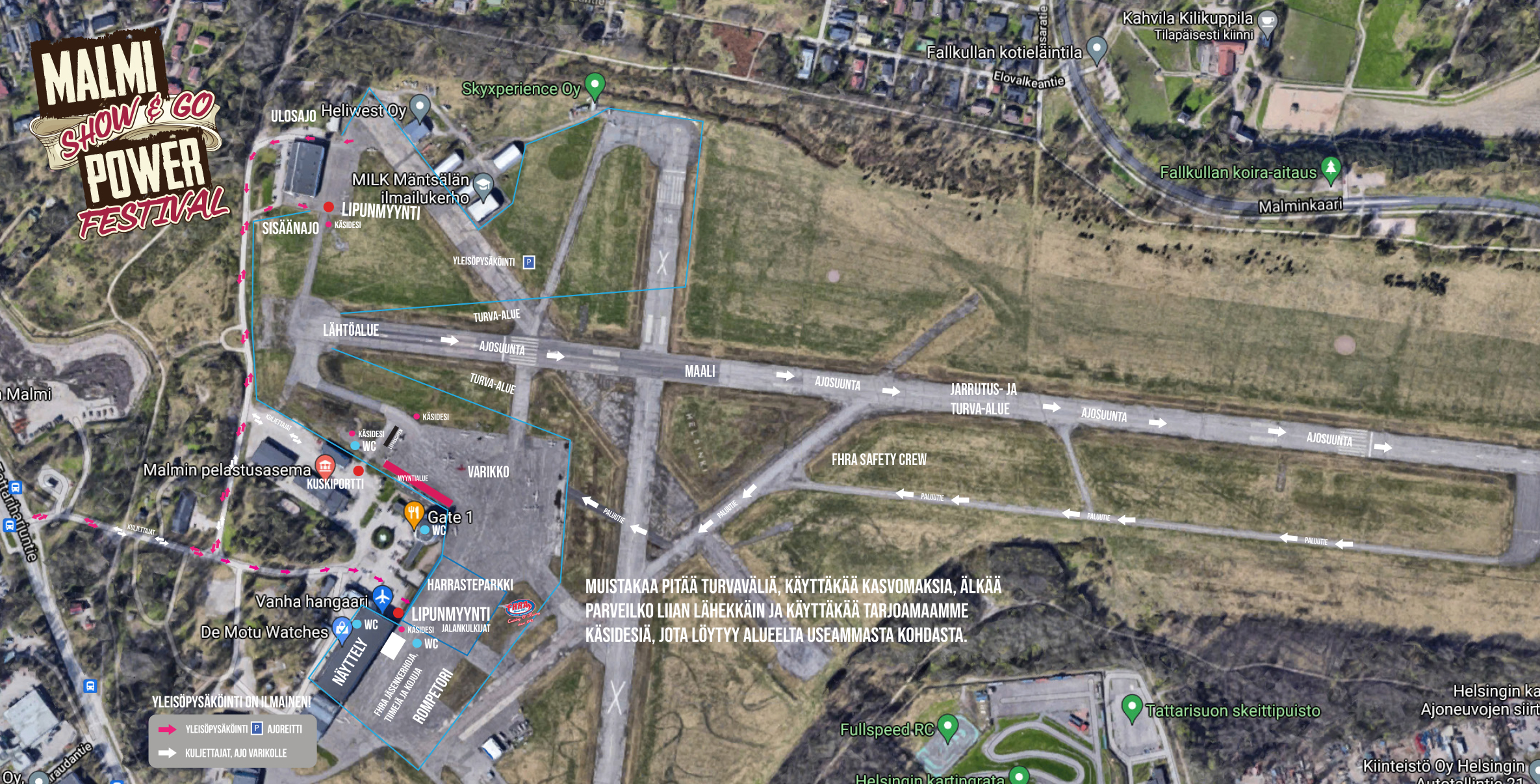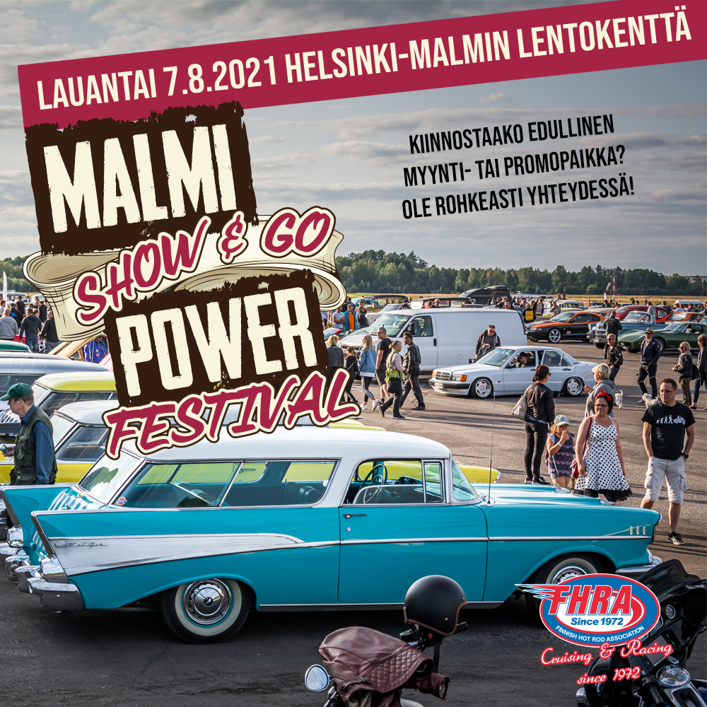 7.8.2021 Malmi Show & Go Power Festival 2021 Helsinki-Malmin lentokentällä. FHRA:n uusi tapahtuma Malmi Show & Go Power Festival toivottaa sinut lämpimästi tervetulleeksi tutustumaan ajoneuvonäyttelyyn sekä viettämään vauhdikasta päivää Helsinki-Malmin lentokentälle lauantaina 7.8.2021. Hangaarin näyttelyyn on kutsuttu Suomen hienoimmat rakennellut ajoneuvot. Kiitoradalla katulailliset ajoneuvot testaavat kiihtyvyyttään varttimailin matkalla. Paikalla FHRA:n ajanotto ja rataryhmä. Tule kokemaan koko perheen voimin upea näyttely sekä kiihdytystapahtuman vauhti ja äänet. Meillä on koko kenttä vuokrattuna. Kiitotiellä vedetään katukiihdytystä, 4000 m2 hangaarissa pieni näyttely ja n. 15.000 m2 pihatilaa, jonne on suunniteltu harrasteparkkia ja jäsenkerhoja yms. esittelemään toimintaansa. Ajoneuvoilmoittautumiset: Jos omistat näyttelyyn sopivan ajoneuvon, niin ilmoittautuminen löytyy kotisivuiltamme. Kyseessä on tukitapahtuma. Emme maksa näytteilleasettajille kilometrikorvauksia tai kerhoavustuksia kuten American Car Show´ssa. FHRA:n jäsenkerhot ja kisatiimit, olette tervetulleet esittelemään toimintaanne tapahtumaan, laitathan ilmoittautumisen tulemaan. Lue lisää tapahtumasta ja ilmoittaudu: https://www.fhra.fi/malmi-show-go-power-festival/ Kyseessä yhden päivän tapahtuma. Katukiihdyttelyä, näyttely ja muuta harrastuksen ympärille kuuluvaa toimintaa. Tervetuloa. Kiinnostaako myynti- tai promopaikka? Ole rohkeasti yhteydessä. Martti Luoso – martti.luoso (@)fhra.fi / 0207 430 753 FHRA Marketing Oy / Finnish Hot Rod Association FHRA ry Helsinki-Malmin lentoasema 00700 Helsinki Puhelin: 0207 430 750 sähköposti: info(@)fhra.fi Lue lisää: https://www.fhra.fi/malmi-show-go-power-festival/ Pääsyliput: Kaikki liput vaihdetaan rannekkeisiin portilla. Ikäraja: Ikärajaton, alle 12-vuotiaat ilmaiseksi vain huoltajan seurassa. Päivälippu: 20 € Liput ennakkoon Tiketistä.