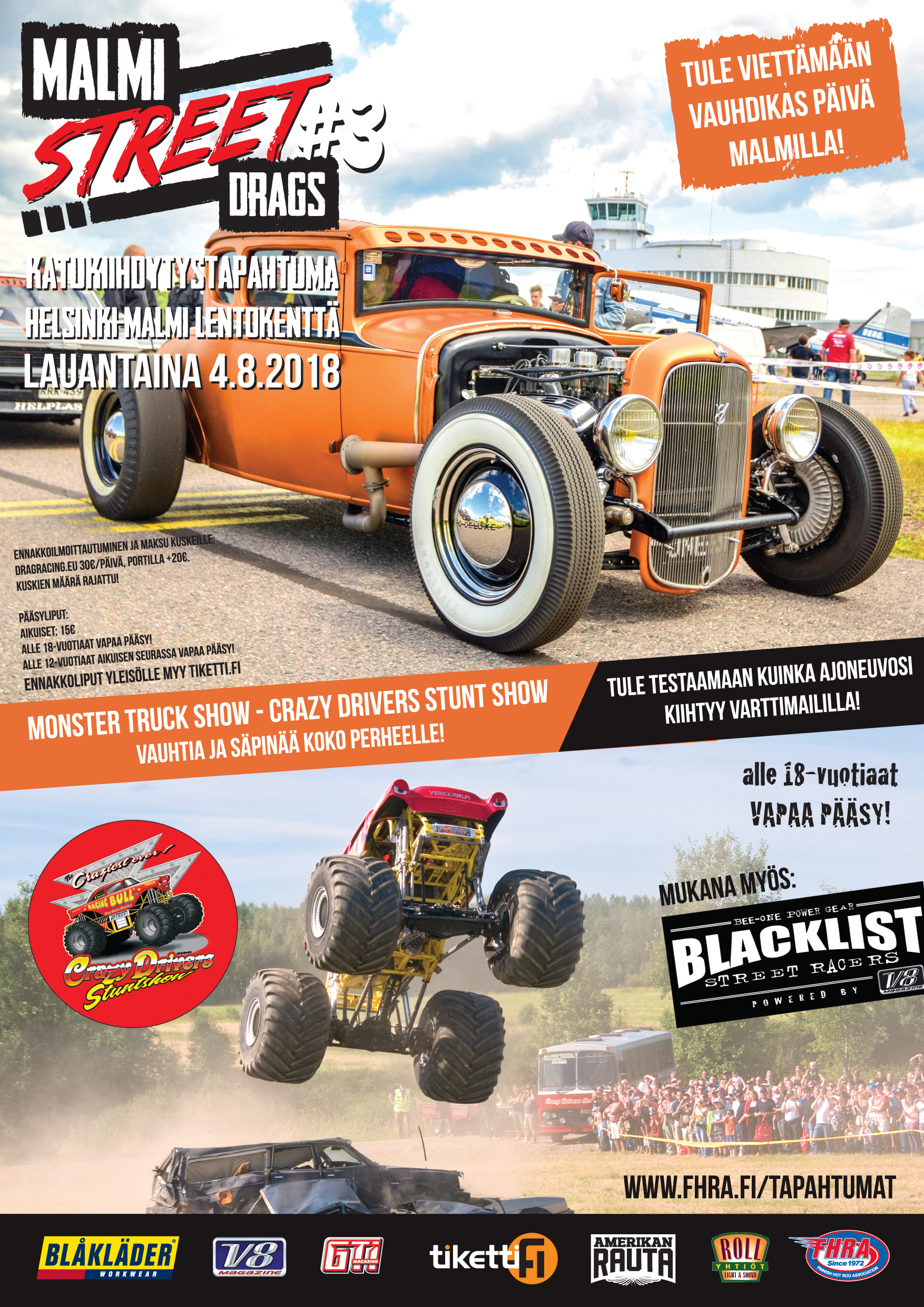 4.8.2018 Malmi Street Drags #3, Malmin lentokenttä Tule paikan päälle kokeilemaan kuinka oma ajokkisi kiihtyy varttimaililla. Kuka on Malmin kingi? Tule viettämään vauhdikasta päivää Helsinki-Malmin lentokentälle. Tapahtumassa katulailliset ajoneuvot testaavat kiihtyvyyttään varttimailin matkalla. Paikalla FHRA:n ajanotto ja rataryhmä. Tule kokemaan, vaikka koko perheen voimin, kiihdytystapahtuman vauhti ja äänet. Paikka: Helsinki-Malmin Lentoasema, 00700 Helsinki Aika: Lauantai 4.8.2018 klo. 10.00-18.00 Kuskit: Ennakkoilmoittautuminen kuskeille http://www.dragracing.eu/index.asp Kuljettajien tulee luoda profiili palveluun. Kilpailijanumeroksi laitetaan ajoneuvon rekisterinumero. Kuljettajia otetaan mukaan tapahtumaan rajattu määrä, että voimme taata kuskeille tarpeeksi monta vetoa päivälle. Ennakkoilmoittautumisen yhteydessä maksetaan osallistumismaksu, joka on koko päivästä 30€+ 3€ käsittelymaksu. Hinta sisältää kaikki päivän vedot ja katsastusmaksun. Dragracing.eu -palvelussa voi maksaa Paytrailin kautta useimpien suomalaisten pankkien verkkomaksuna, luottokortilla tai laskulla. Otamme ilmoittautumisia vastaan myös paikan päällä, jos tapahtumaan vielä mahtuu vetäjiä. Osallistumismaksu portilla on 30€ + 20€ käsittelymaksu. Pyydämme siis ennakkoilmoittautumisia, jotta voimme taata jouhevampaa ajoa. Jos ilmoittaudut vetämään vasta paikan päällä, emme voi taata, että mahdut mukaan. Olemme rajanneet osallistujien määrää juuri tästä syystä, että kaikki ennakkoonilmoittautuneet varmasti pääsevät vetämään useamman kerran. Pääsyliput: Alle 18-vuotiaille ilmainen pääsy tapahtumaan. Kaikki liput vaihdetaan rannekkeisiin portilla. Early Bird -hintaiset liput ovat myynnissä vain rajoitetun ajan, toimithan siis nopeasti. Ennakkohintainen lipunmyynti päättyy 27.7. klo 23.59, tämän jälkeen myydään normaalihintaisia pääsylippuja. Ennakkohinta 12 € / Normaalihinta 15 € Hyvä asiakkaamme. Huomioithan, että Drag Racing kilpailu järjestetään säävarauksella. Sateen aikana ei turvallisuussyistä voida ajaa, sään salliessa ajoja jatketaan heti kun se vain on mahdollista. Emme palauta maksua lunastetuista lipuista, emmekä korvaa kadonneita lippuja. Emme vastaa alueella tapahtuneista henkilö- tai omaisuusvahingoista. Olet alueella omalla vastuulla. Lataa tapahtumajuliste tästä alta löytyvästä linkistä painotuotteena tai yllä oleva .jpg-kuva ja jaa se, jos haluat kertoa tapahtumasta muillekin. Rohkeimmat voivat, jos niin tahtovat, tulostaa aineiston ja laittaa vaikka lähikaupan ilmoitustaululle. Jos näin päätät tehdä, laitathan ilmoituksen esille niille tarkoitettuihin paikkoihin. Kiitos jo etukäteen. FHRA_malmi_3_A3 Paikalla myös Blacklist-kuskeja testaamassa ajokkiensa tehoja varttimailin matkalla. Lue lisää Blacklististä Facebookissa: Blacklist Street Racers TV Hyvä median edustaja. Voit ilmoittautua samalla lomakkeella vaikka kaikkiin tapahtumiin yhdellä kertaa. Kiinnostaako myynti- tai promopaikka? Ole rohkeasti yhteydessä. Leo Laurell, toimitusjohtaja – leo.laurell (@) fhra.fi/ 0207 430 751 Vaatimukset testiajoa varten: Ajoneuvojen täytyy olla rekisteröityjä ja katsastettuja katukäyttöön (ei kilpa-ajoneuvoja, ei slicksejä, ei matkustajia). Autot: Voimassa oleva ajokortti, umpinaiset kengät, kypärä, ajohanskat, pitkät housut ja pitkähihainen paita, turvavyö pakollinen kaikissa autoissa. Moottoripyörät: Voimassa oleva ajokortti, ajopuku, umpinaiset kengät, umpikypärä ja ajohanskat (selkäpanssari suositus) Muuta huomioitavaa: – Rekisteröinti: ei liikenteestä poistettuja, pitää olla ote ja jonkunlainen kilpi, joka kuuluu ajoneuvoon. – Vakuutus: liikennevakuutuksen voimassaoloa emme pysty valvomaan, mutta huomioithan, että se ei ole voimassa suljetulla alueella. – Katsastus: ei tarvitse olla katsastuksen voimassa, eikä muutoksien otteessa. – Ilokaasu: saa ajaa ilokaasulla, koska kyseessä on katukulkine, jota ajetaan suljetulla alueella. – Slicksit: Katukäyttöön tarkoitetut DOT hyväksytyt sallittu Hyvä asiakkaamme. Huomioithan, että Drag Racing kilpailu järjestetään säävarauksella. Sateen aikana ei turvallisuussyistä voida ajaa, sään salliessa ajoja jatketaan heti kun se vain on mahdollista. Emme palauta maksua lunastetuista lipuista, emmekä korvaa kadonneita lippuja. Emme vastaa alueella tapahtuneista henkilö- tai omaisuusvahingoista. Olet alueella omalla vastuulla. OHJEITA TESTAAJILLE. Toivotamme sinut tervetulleeksi testaamaan ajoneuvosi kiihtyvyyttä. Sinun pitäisi toimia seuraavien ohjeiden mukaan. VARIKKO JA SIISTEYS Ilmoittautumisesi jälkeen sinut ohjataan katsastuspaikalle ja tämän jälkeen omalle varikkopaikalle joka sinulla on käytössäsi koko tapahtuman ajan. Näin ollen huolehdit paikkasi siisteydestä myös lähtiessäsi pois. Alueella on riittävästi jäteastioita. Ongelmajätteitä kuten esim. jäteöljyä, ei saa jättää tapahtuma-alueelle. KATSASTUS Ajoneuvot katsastetaan katsastuspaikalla, joten ole ajoneuvosi lähettyvillä, jotta katsastus voidaan suorittaa. Saat autoosi osallistumisnumeron ja katsastustarran, ilman niitä et pääse ajamaan. LÄHTÖÖN VALMISTAUTUMINEN Itse ajoon lähdön teet oma-aloitteisesti, emme tule hakemaan sinua ajamaan, vaan sinun täytyy siirtyä lähtöalueelle omin keinoin. Lähtöjärjestelyalueelle tulee kaksi parijonoa autoille ja yksi pyörille. FHRA:n toimitsijat näyttävät sinulle mihin jonoon menet,lähtöalueella tarkistamme ajolupasi. Kun olet lähtövuorossa toimitsijamme näyttää sinulle koska voit siirtyä ns. burnis-alueelle. Siellä seuraava toimitsija näyttää sinulle koska saat aloittaa renkaiden lämmityksen. Jos et lämmitä renkaita, siirry muutama metri eteenpäin ja jää odottamaan lähettäjän käsimerkkejä, jolla hän ilmoittaa koska saat asettua lähtövaloihin. AJAMINEN Lähtövaloihin asetutaan hiljaa eteenpäin liikkuen, kun näet, että ensimmäine