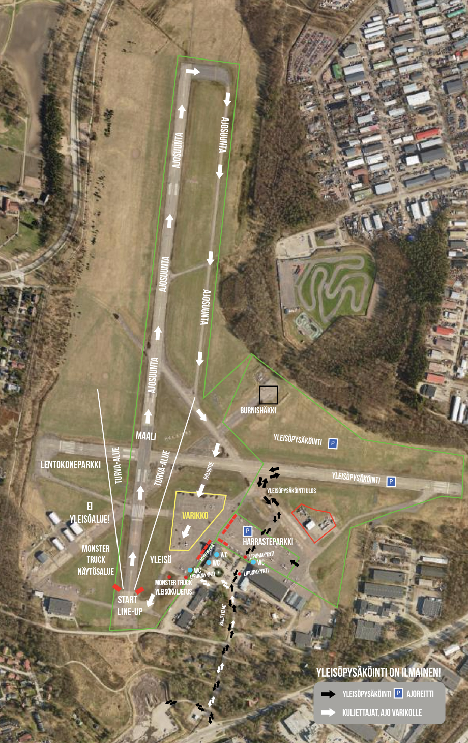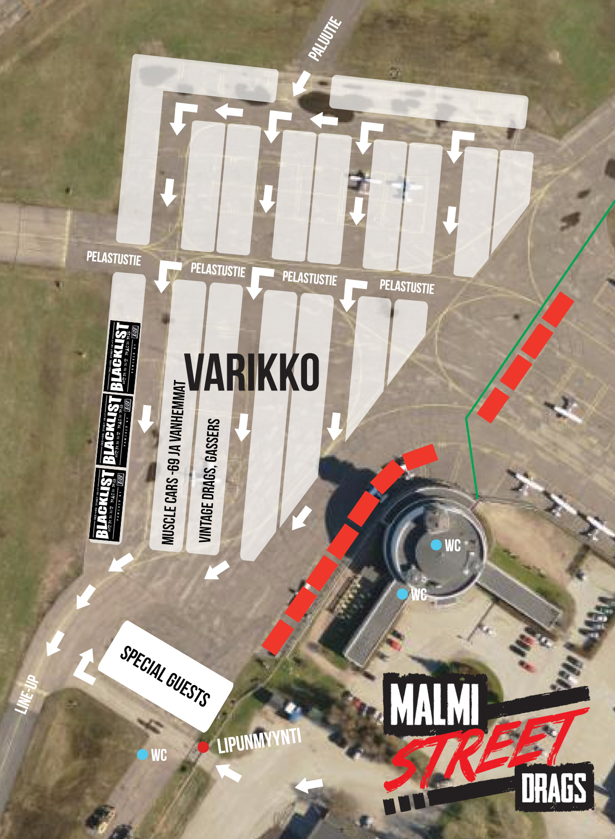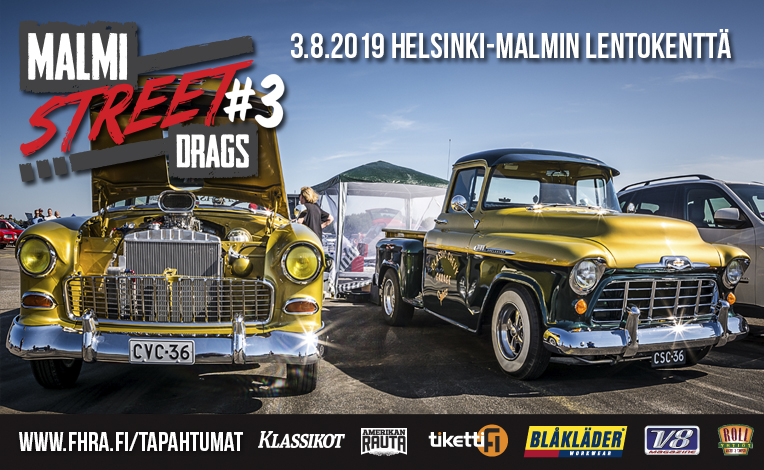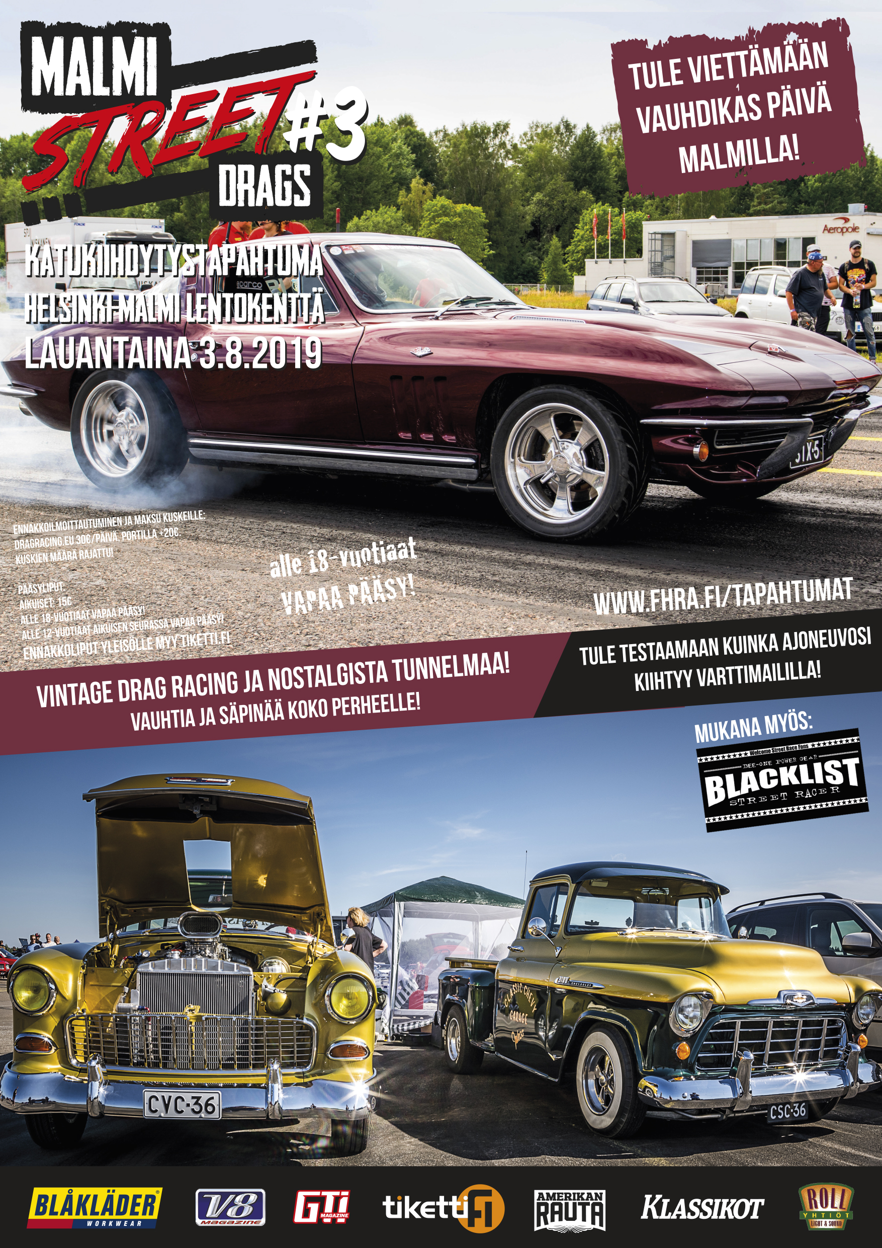 3.8.2019, Malmi Street Drags #3, Helsinki-Malmin lentokenttä Tule paikan päälle kokeilemaan kuinka oma ajokkisi kiihtyy varttimaililla. Kuka on Malmin kingi? Tule viettämään vauhdikasta päivää Helsinki-Malmin lentokentälle. Tapahtumassa katulailliset ajoneuvot testaavat kiihtyvyyttään varttimailin matkalla. Paikalla FHRA:n ajanotto ja rataryhmä. Tule kokemaan, vaikka koko perheen voimin, kiihdytystapahtuman vauhti ja äänet. Ohjelmassa Vintage drags -osastoa ja nostalgia tunnelmaa. Tervetuloa. Paikka: Helsinki-Malmin Lentoasema, 00700 Helsinki Aika: Lauantai 3.8.2019 klo. 10.00-18.00 Tapahtuman aikataulu: Päivittyy pian. Tapahtuma-alueen kartat: Päivittyy pian. Kuskit: Ennakkoilmoittautuminen kuskeille http://www.dragracing.eu/index.asp Ilmoittautuminen avataan pian. Kuljettajien tulee luoda profiili palveluun. Kilpailijanumeroksi laitetaan ajoneuvon rekisterinumero. Kuljettajia otetaan mukaan tapahtumaan rajattu määrä, että voimme taata kuskeille tarpeeksi monta vetoa päivälle. Ennakkoilmoittautumisen yhteydessä maksetaan osallistumismaksu, joka on koko päivästä 30€+ 3€ käsittelymaksu. Hinta sisältää kaikki päivän vedot ja katsastusmaksun. Dragracing.eu -palvelussa voi maksaa Paytrailin kautta useimpien suomalaisten pankkien verkkomaksuna, luottokortilla tai laskulla. Otamme ilmoittautumisia vastaan myös paikan päällä, jos tapahtumaan vielä mahtuu vetäjiä. Osallistumismaksu portilla on 30€ + 20€ käsittelymaksu. Pyydämme siis ennakkoilmoittautumisia, jotta voimme taata jouhevampaa ajoa. Jos ilmoittaudut vetämään vasta paikan päällä, emme voi taata, että mahdut mukaan. Olemme rajanneet osallistujien määrää juuri tästä syystä, että kaikki ennakkoonilmoittautuneet varmasti pääsevät vetämään useamman kerran. Pääsyliput: Tapahtuman yleisöennakkoliput on nyt myynnissä Tiketissä. Early Bird -hintaiset liput ovat myynnissä vain rajoitetun ajan, toimithan siis nopeasti. Early Bird -lippujen myynti päättyy 27.7. klo 23:59, tämän jälkeen myydään normaalihintaisia pääsylippuja. Ennakkohinta 12 € / Normaalihinta 15 € Alle 18-vuotiaille ilmainen pääsy tapahtumaan. Hyvä asiakkaamme. Huomioithan, että Drag Racing kilpailu järjestetään säävarauksella. Sateen aikana ei turvallisuussyistä voida ajaa, sään salliessa ajoja jatketaan heti kun se vain on mahdollista. Emme palauta maksua lunastetuista lipuista, emmekä korvaa kadonneita lippuja. Emme vastaa alueella tapahtuneista henkilö- tai omaisuusvahingoista. Olet alueella omalla vastuulla. Paikalla myös Blacklist-kuskeja testaamassa ajokkiensa tehoja varttimailin matkalla. Lue lisää Blacklististä Facebookissa: Blacklist Street Racers TV Hyvä median edustaja. Voit ilmoittautua samalla lomakkeella vaikka kaikkiin tapahtumiin yhdellä kertaa. Kiinnostaako myynti- tai promopaikka? Ole rohkeasti yhteydessä. Leo Laurell, toimitusjohtaja – leo.laurell (@) fhra.fi/ 0207 430 751 Vaatimukset testiajoa varten: Ajoneuvojen täytyy olla rekisteröityjä ja katsastettuja katukäyttöön (ei kilpa-ajoneuvoja, ei slicksejä, ei matkustajia). Autot: Voimassa oleva ajokortti, umpinaiset kengät, kypärä, ajohanskat, pitkät housut ja pitkähihainen paita, turvavyö pakollinen kaikissa autoissa. Moottoripyörät: Voimassa oleva ajokortti, ajopuku, umpinaiset kengät, umpikypärä ja ajohanskat (selkäpanssari suositus) Muuta huomioitavaa: – Rekisteröinti: ei liikenteestä poistettuja, pitää olla ote ja jonkunlainen kilpi, joka kuuluu ajoneuvoon. – Vakuutus: liikennevakuutuksen voimassaoloa emme pysty valvomaan, mutta huomioithan, että se ei ole voimassa suljetulla alueella. – Katsastus: ei tarvitse olla katsastuksen voimassa, eikä muutoksien otteessa. – Ilokaasu: saa ajaa ilokaasulla, koska kyseessä on katukulkine, jota ajetaan suljetulla alueella. – Slicksit: Katukäyttöön tarkoitetut DOT hyväksytyt sallittu Hyvä asiakkaamme. Huomioithan, että Drag Racing kilpailu järjestetään säävarauksella. Sateen aikana ei turvallisuussyistä voida ajaa, sään salliessa ajoja jatketaan heti kun se vain on mahdollista. Emme palauta maksua lunastetuista lipuista, emmekä korvaa kadonneita lippuja. Emme vastaa alueella tapahtuneista henkilö- tai omaisuusvahingoista. Olet alueella omalla vastuulla. OHJEITA TESTAAJILLE. Toivotamme sinut tervetulleeksi testaamaan ajoneuvosi kiihtyvyyttä. Sinun pitäisi toimia seuraavien ohjeiden mukaan. VARIKKO JA SIISTEYS Ilmoittautumisesi jälkeen sinut ohjataan katsastuspaikalle ja tämän jälkeen omalle varikkopaikalle joka sinulla on käytössäsi koko tapahtuman ajan. Näin ollen huolehdit paikkasi siisteydestä myös lähtiessäsi pois. Alueella on riittävästi jäteastioita. Ongelmajätteitä kuten esim. jäteöljyä, ei saa jättää tapahtuma-alueelle. KATSASTUS Ajoneuvot katsastetaan katsastuspaikalla, joten ole ajoneuvosi lähettyvillä, jotta katsastus voidaan suorittaa. Saat autoosi osallistumisnumeron ja katsastustarran, ilman niitä et pääse ajamaan. LÄHTÖÖN VALMISTAUTUMINEN Itse ajoon lähdön teet oma-aloitteisesti, emme tule hakemaan sinua ajamaan, vaan sinun täytyy siirtyä lähtöalueelle omin keinoin. Lähtöjärjestelyalueelle tulee kaksi parijonoa autoille ja yksi pyörille. FHRA:n toimitsijat näyttävät sinulle mihin jonoon menet,lähtöalueella tarkistamme ajolupasi. Kun olet lähtövuorossa toimitsijamme näyttää sinulle koska voit siirtyä ns. burnis-alueelle. Siellä seuraava toimitsija näyttää sinulle koska saat aloittaa renkaiden lämmityksen. Jos et lämmitä renkaita, siirry muutama metri eteenpäin ja jää odottamaan lähettäjän käsimerkkejä, jolla hän ilmoittaa koska saat asettua lähtövaloihin. AJAMINEN Lähtövaloihin asetutaan hiljaa eteenpäin liikkuen, kun näet, että ensimmäinen (ylin) valkoinen lamppu syttyy liikut vielä hiukan eteenpäin, jolloin toinen valkoinen valo syttyy. Silloin olet valmiina lähtövaloissa, kun molempien ajajien valkoiset valot pala