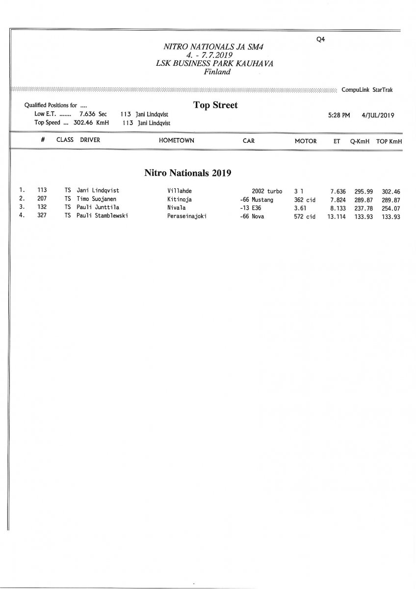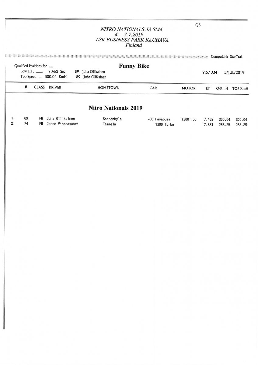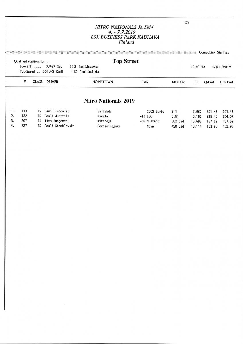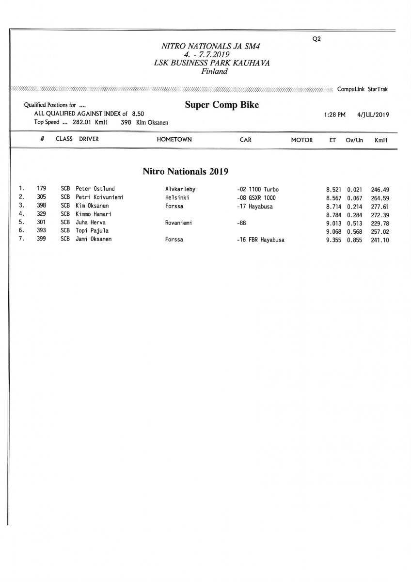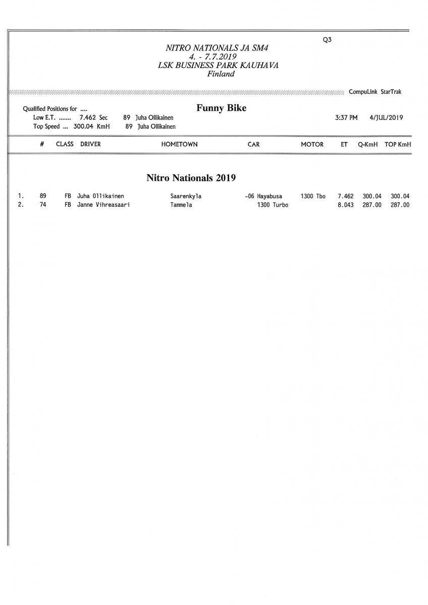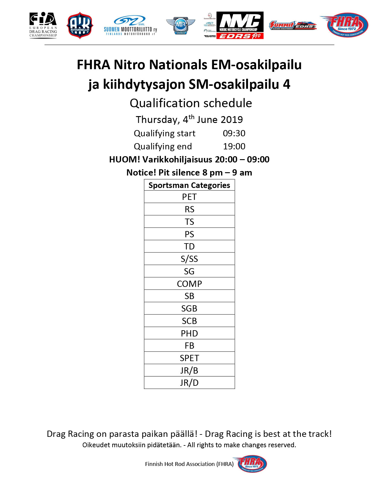 Invitation & Supplementary Regulations Nitro Nationals 2019. Posted on 10.5.2019 in Drag Racing, Nitro Nationals, Tapahtumat Invitation for FIA-, FIM-E -, EDRS Pro-, EDRS-classes 2019. The Invitation is finally online and the entrance for the FIA-, FIM-E -, EDRS -, EDRS Pro-classes and EDRS Pro MC for the FIA European Drag Racing Championship event Nitro Nationals on July 4th – July 7th 2019 at new track at LSK Business Park, Loppusuora 22 (Sotakouluntie), 62200 Kauhava, Finland is available on dragracing.eu. Please read the invitation below or on dragracing.eu. The last entrance date is 21st of June. Late entry may be accepted after this date but no later than June 28th 2019. If accepted, an extra fee will be charged. Kutsu FIA -, FIM-E -, EDRS -, EDRS Pro – Ja EDRS Pro MC-ryhmille on nyt linjoilla ja ilmoittautuminen on nyt mahdollista dragracing.eu-palvelussa FHRA Nitro Nationals European Drag Racing Championship tapahtumaan 4.-7.7.2019, joka ajetaan uudella radalla LSK Business Parkissa. Olkaa hyvä ja lukekaa koko kutsu tästä alta tai dragracing.eu-palvelusta. Viimeinen ilmoittautumispäivä on 21.6.2018. Ilmoittautumisia otetaan vastaan vielä 28.6. asti, mutta hintaan lisätään jälki-ilmoittautumismaksu. Invitation can be read here/Voit lukea kutsun täältä. https://www.fhra.fi/wp-content/uplo...LEMENTARY-REGULATIONS-NitroNationals_2019.pdf https://www.fhra.fi/wp-content/uploads/2019/05/KILPAILUKUTSU_SM_CUP_2019.pdf Race entry open at www.dragracing.eu Welcome Race fans.