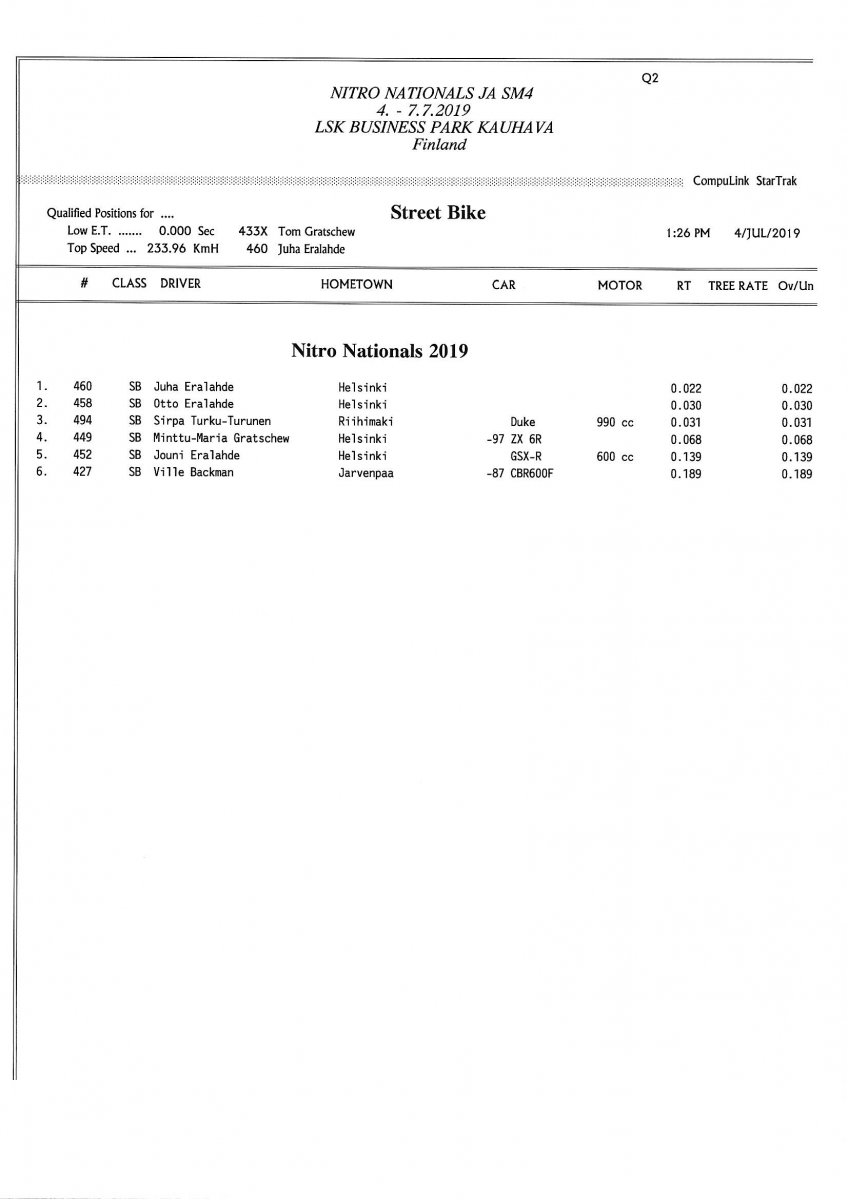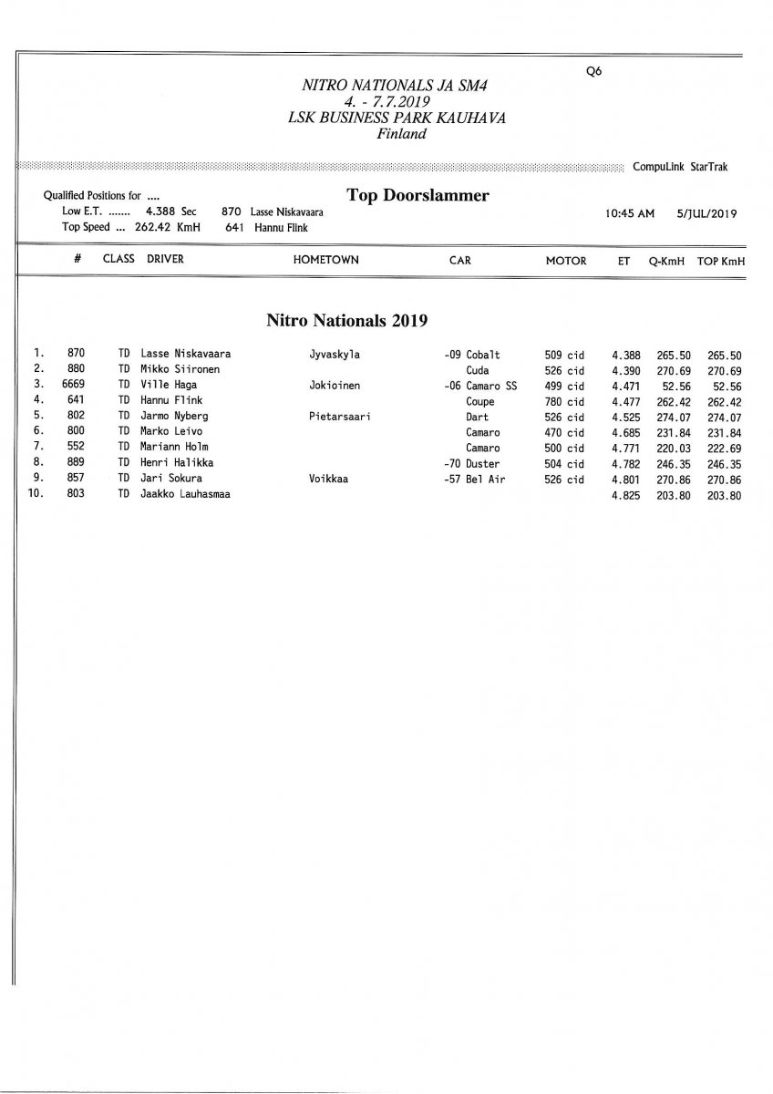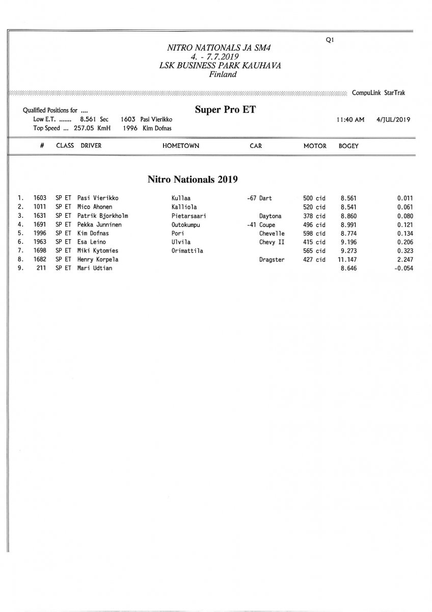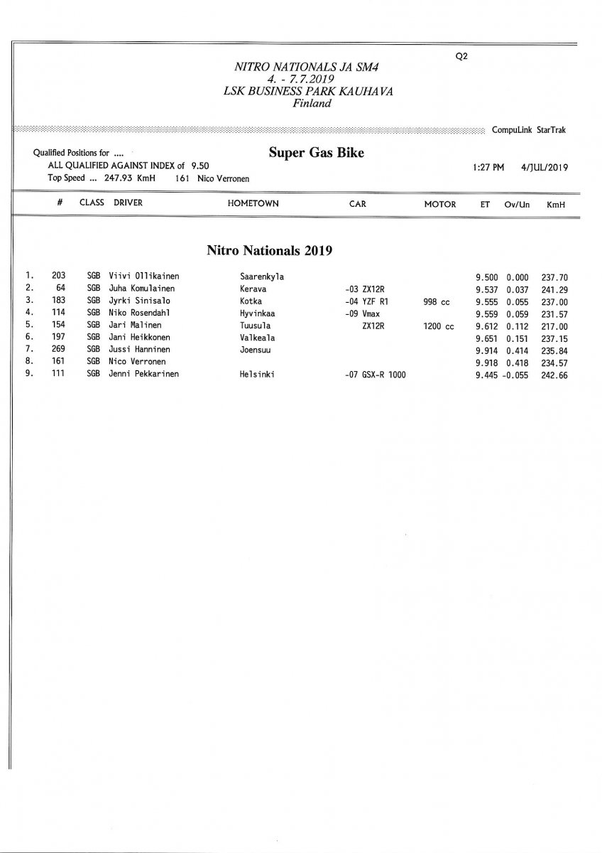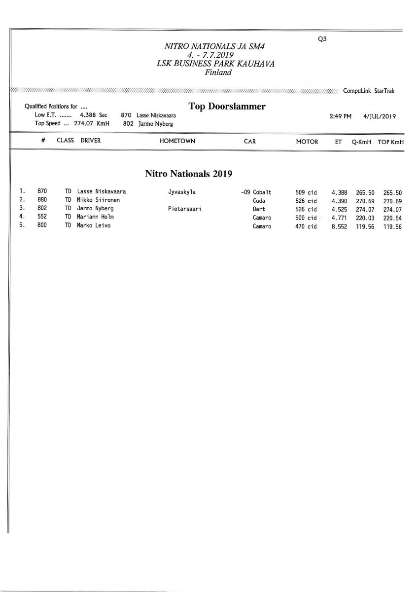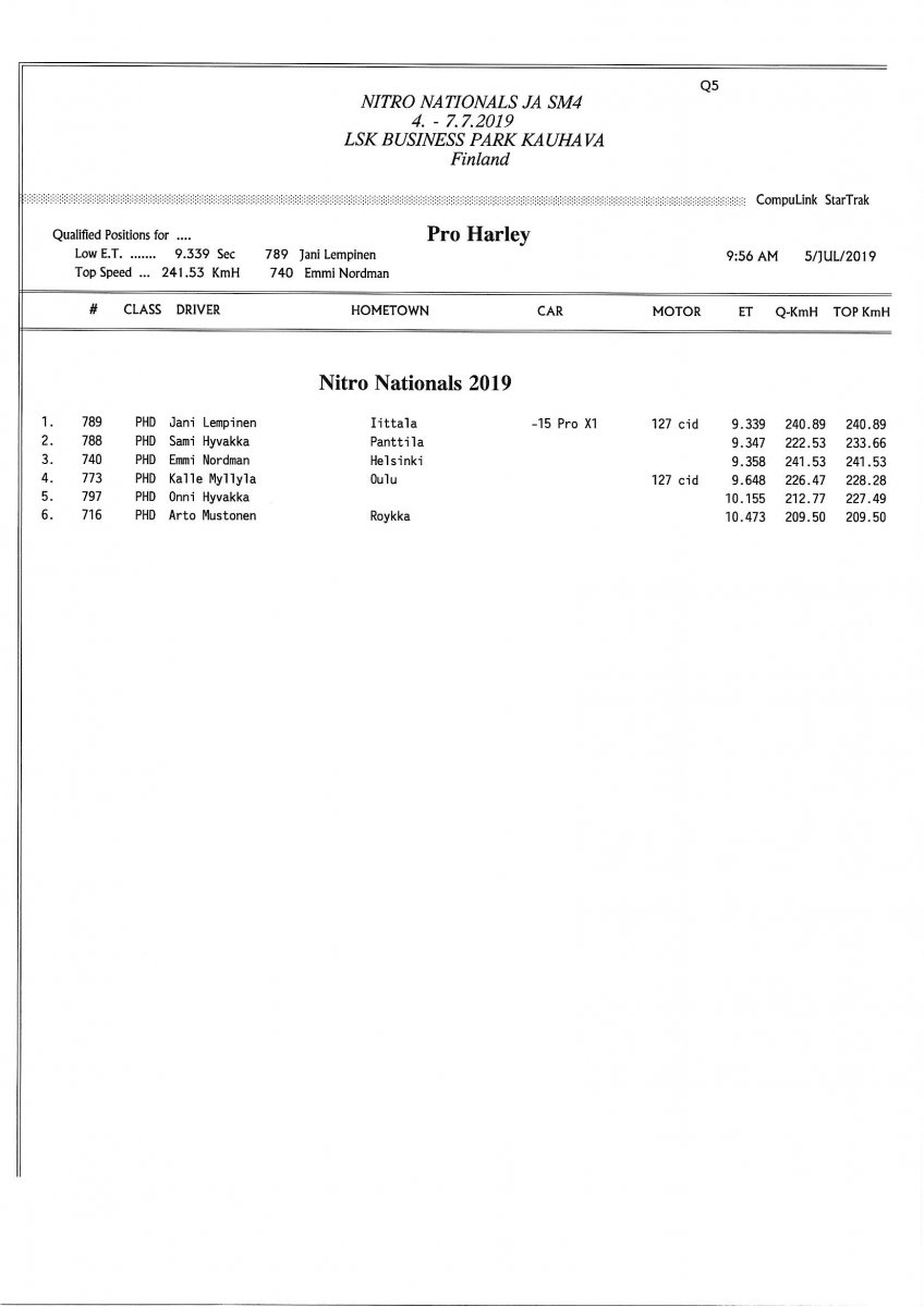 Invitation & Supplementary Regulations Nitro Nationals 2019. Posted on 10.5.2019 in Drag Racing, Nitro Nationals, Tapahtumat Invitation for FIA-, FIM-E -, EDRS Pro-, EDRS-classes 2019. The Invitation is finally online and the entrance for the FIA-, FIM-E -, EDRS -, EDRS Pro-classes and EDRS Pro MC for the FIA European Drag Racing Championship event Nitro Nationals on July 4th – July 7th 2019 at new track at LSK Business Park, Loppusuora 22 (Sotakouluntie), 62200 Kauhava, Finland is available on dragracing.eu. Please read the invitation below or on dragracing.eu. The last entrance date is 21st of June. Late entry may be accepted after this date but no later than June 28th 2019. If accepted, an extra fee will be charged. Kutsu FIA -, FIM-E -, EDRS -, EDRS Pro – Ja EDRS Pro MC-ryhmille on nyt linjoilla ja ilmoittautuminen on nyt mahdollista dragracing.eu-palvelussa FHRA Nitro Nationals European Drag Racing Championship tapahtumaan 4.-7.7.2019, joka ajetaan uudella radalla LSK Business Parkissa. Olkaa hyvä ja lukekaa koko kutsu tästä alta tai dragracing.eu-palvelusta. Viimeinen ilmoittautumispäivä on 21.6.2018. Ilmoittautumisia otetaan vastaan vielä 28.6. asti, mutta hintaan lisätään jälki-ilmoittautumismaksu. Invitation can be read here/Voit lukea kutsun täältä. https://www.fhra.fi/wp-content/uplo...LEMENTARY-REGULATIONS-NitroNationals_2019.pdf https://www.fhra.fi/wp-content/uploads/2019/05/KILPAILUKUTSU_SM_CUP_2019.pdf Race entry open at www.dragracing.eu Welcome Race fans.