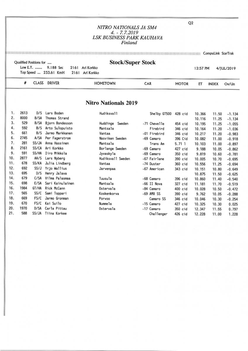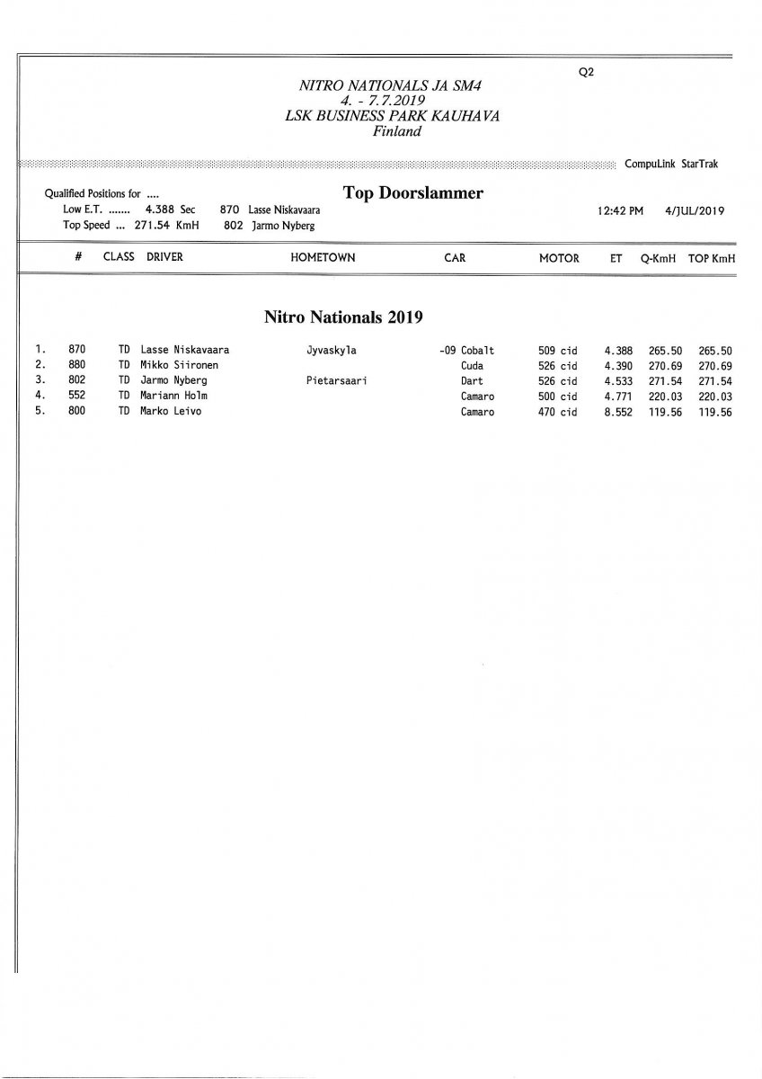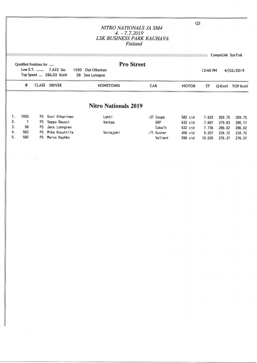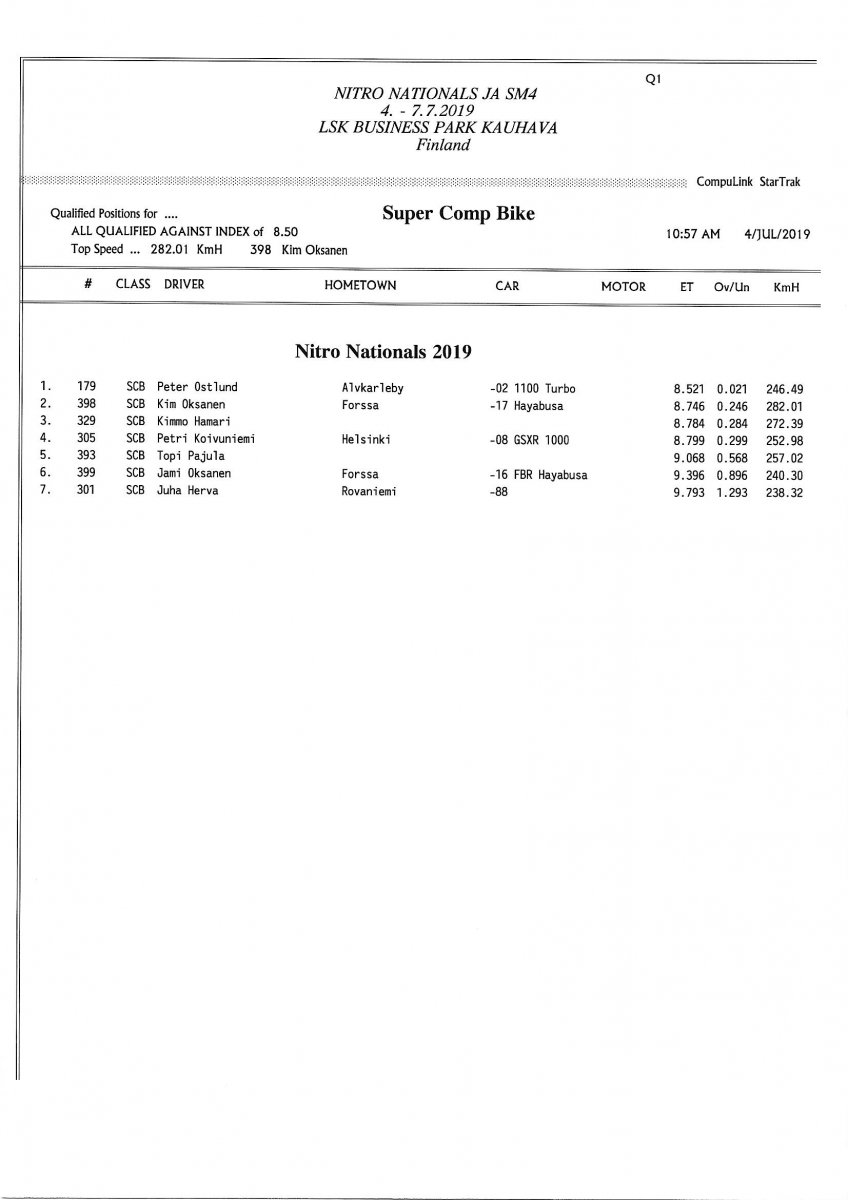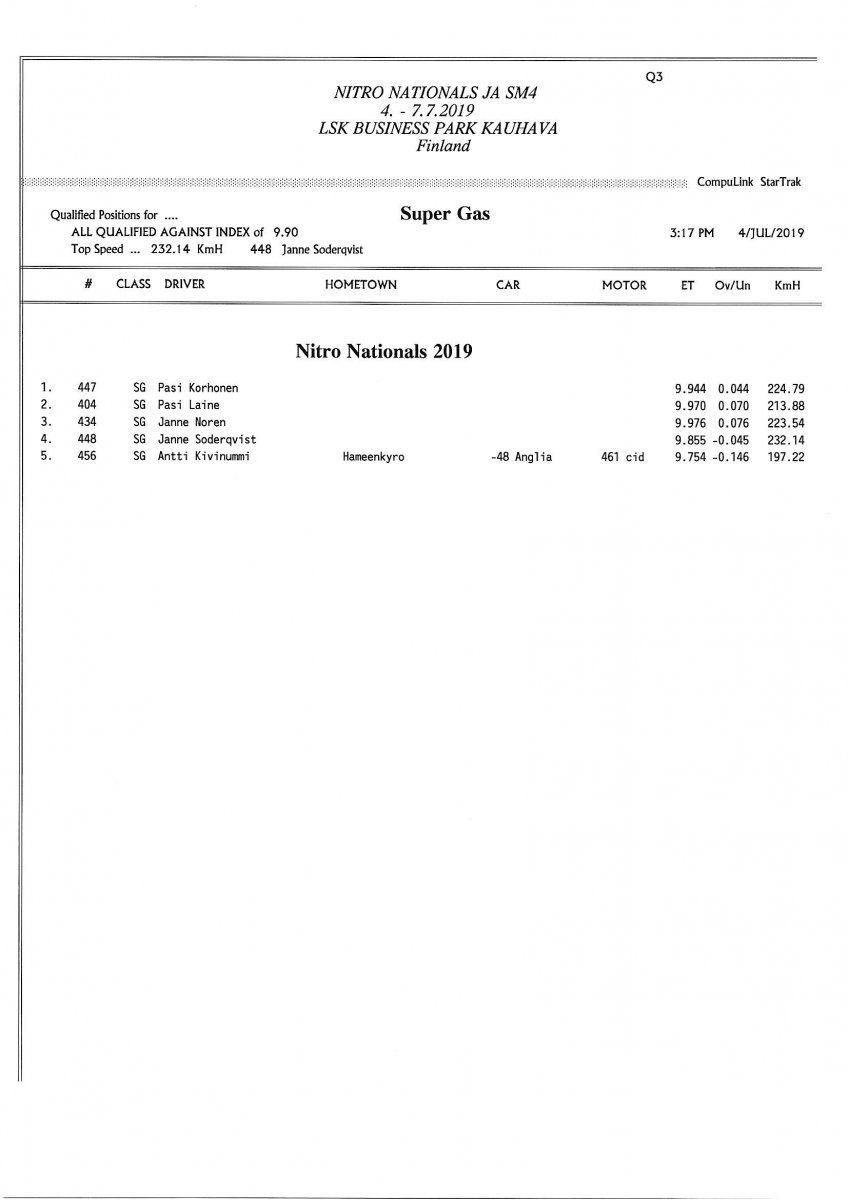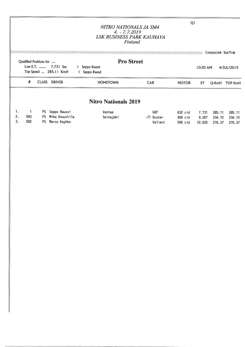 Invitation & Supplementary Regulations Nitro Nationals 2019. Posted on 10.5.2019 in Drag Racing, Nitro Nationals, Tapahtumat Invitation for FIA-, FIM-E -, EDRS Pro-, EDRS-classes 2019. The Invitation is finally online and the entrance for the FIA-, FIM-E -, EDRS -, EDRS Pro-classes and EDRS Pro MC for the FIA European Drag Racing Championship event Nitro Nationals on July 4th – July 7th 2019 at new track at LSK Business Park, Loppusuora 22 (Sotakouluntie), 62200 Kauhava, Finland is available on dragracing.eu. Please read the invitation below or on dragracing.eu. The last entrance date is 21st of June. Late entry may be accepted after this date but no later than June 28th 2019. If accepted, an extra fee will be charged. Kutsu FIA -, FIM-E -, EDRS -, EDRS Pro – Ja EDRS Pro MC-ryhmille on nyt linjoilla ja ilmoittautuminen on nyt mahdollista dragracing.eu-palvelussa FHRA Nitro Nationals European Drag Racing Championship tapahtumaan 4.-7.7.2019, joka ajetaan uudella radalla LSK Business Parkissa. Olkaa hyvä ja lukekaa koko kutsu tästä alta tai dragracing.eu-palvelusta. Viimeinen ilmoittautumispäivä on 21.6.2018. Ilmoittautumisia otetaan vastaan vielä 28.6. asti, mutta hintaan lisätään jälki-ilmoittautumismaksu. Invitation can be read here/Voit lukea kutsun täältä. https://www.fhra.fi/wp-content/uplo...LEMENTARY-REGULATIONS-NitroNationals_2019.pdf https://www.fhra.fi/wp-content/uploads/2019/05/KILPAILUKUTSU_SM_CUP_2019.pdf Race entry open at www.dragracing.eu Welcome Race fans.