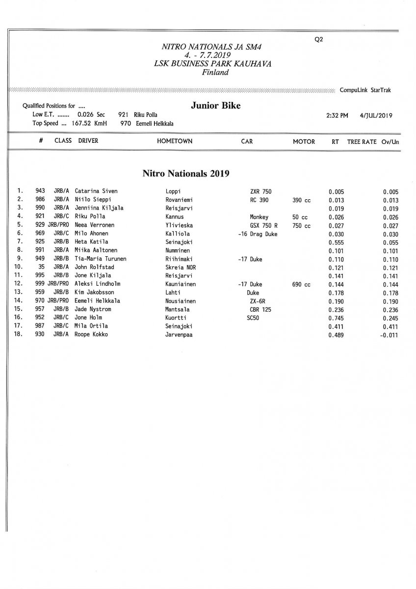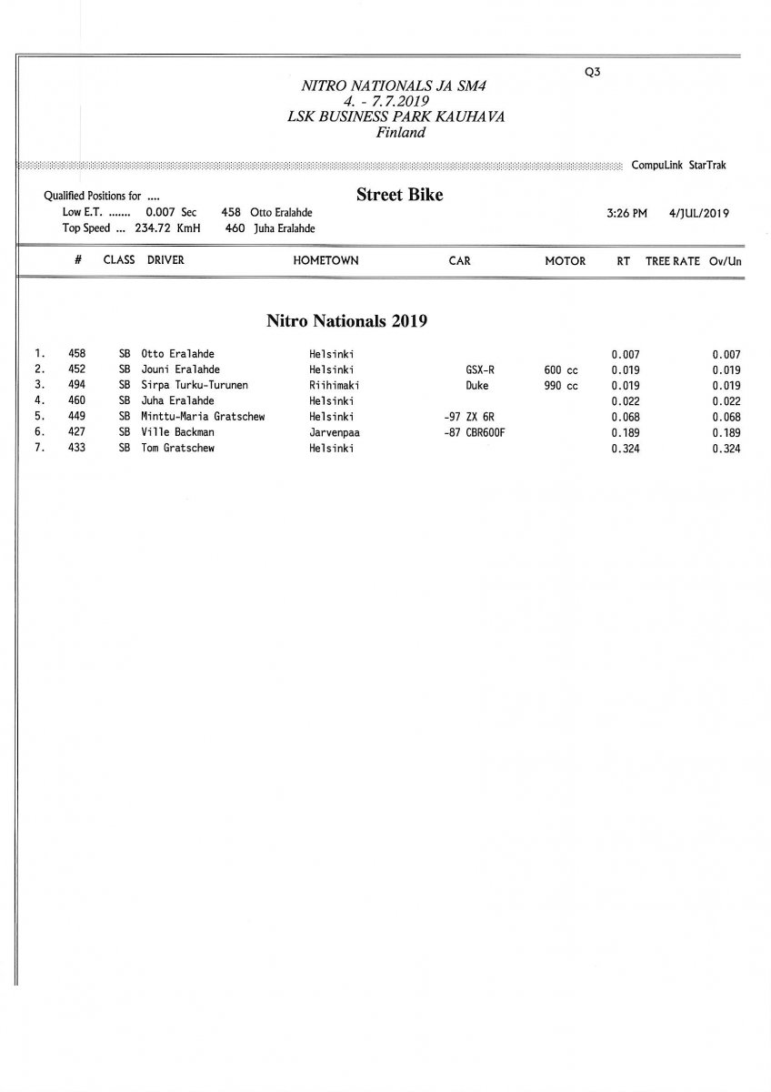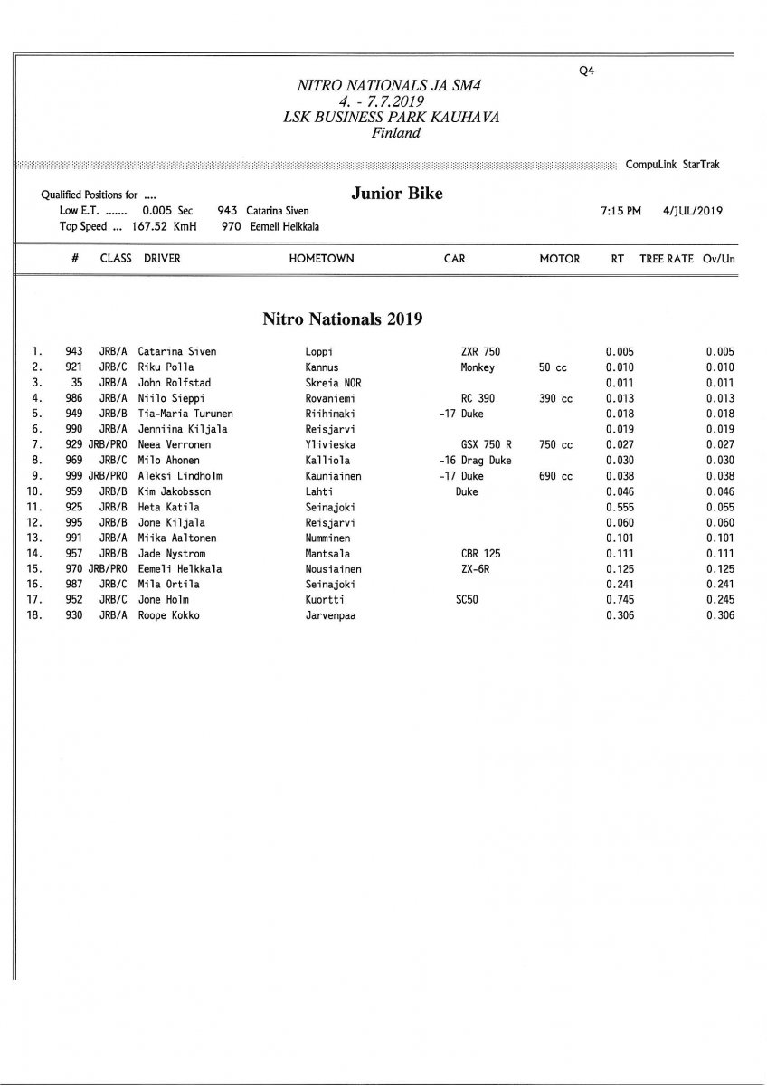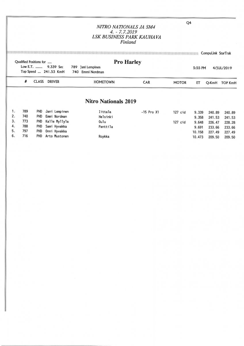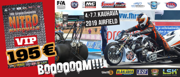 Invitation for FIA-, FIM-E -, EDRS Pro-, EDRS-classes 2019 Updated. Posted on 24.5.2019 in Drag Racing, Nitro Nationals, Tapahtumat The Invitation is online and updated. The entrance for the FIA-, FIM-E -, EDRS -, EDRS Pro-classes and EDRS Pro MC for the FIA European Drag Racing Championship event Nitro Nationals on July 4th – July 7th 2019 at new track at LSK Business Park, Loppusuora 22 (Sotakouluntie), 62200 Kauhava, Finland is available on dragracing.eu. Please read the invitation below or on dragracing.eu. The last entrance date is 21st of June. Late entry may be accepted after this date but no later than June 28th 2019. If accepted, an extra fee will be charged. Entry Fees for Pro MC has been updated. Kutsu FIA -, FIM-E -, EDRS -, EDRS Pro – Ja EDRS Pro MC-ryhmille on nyt linjoilla ja ilmoittautuminen on nyt mahdollista dragracing.eu-palvelussa FHRA Nitro Nationals European Drag Racing Championship tapahtumaan 4.-7.7.2019, joka ajetaan uudella radalla LSK Business Parkissa. Olkaa hyvä ja lukekaa koko kutsu tästä alta tai dragracing.eu-palvelusta. Viimeinen ilmoittautumispäivä on 21.6.2018. Ilmoittautumisia otetaan vastaan vielä 28.6. asti, mutta hintaan lisätään jälki-ilmoittautumismaksu. Kilpailumaksuja on päivitetty Pro-prätkien osalta. INVITATION & SUPPLEMENTARY REGULATIONS NitroNationals_2019