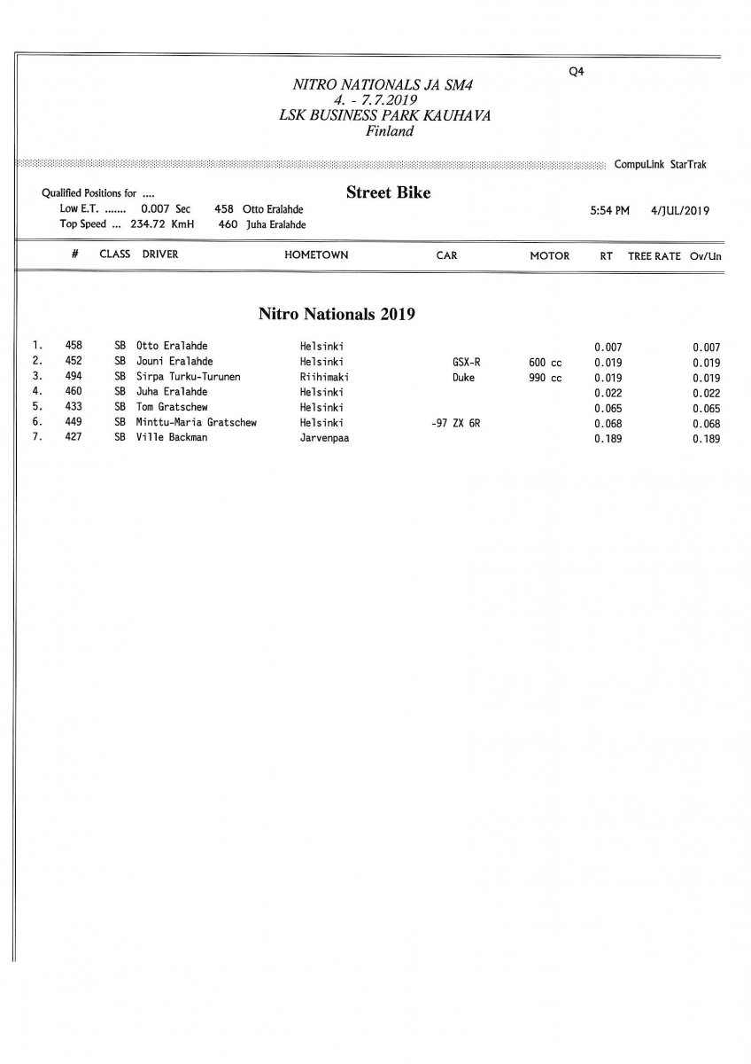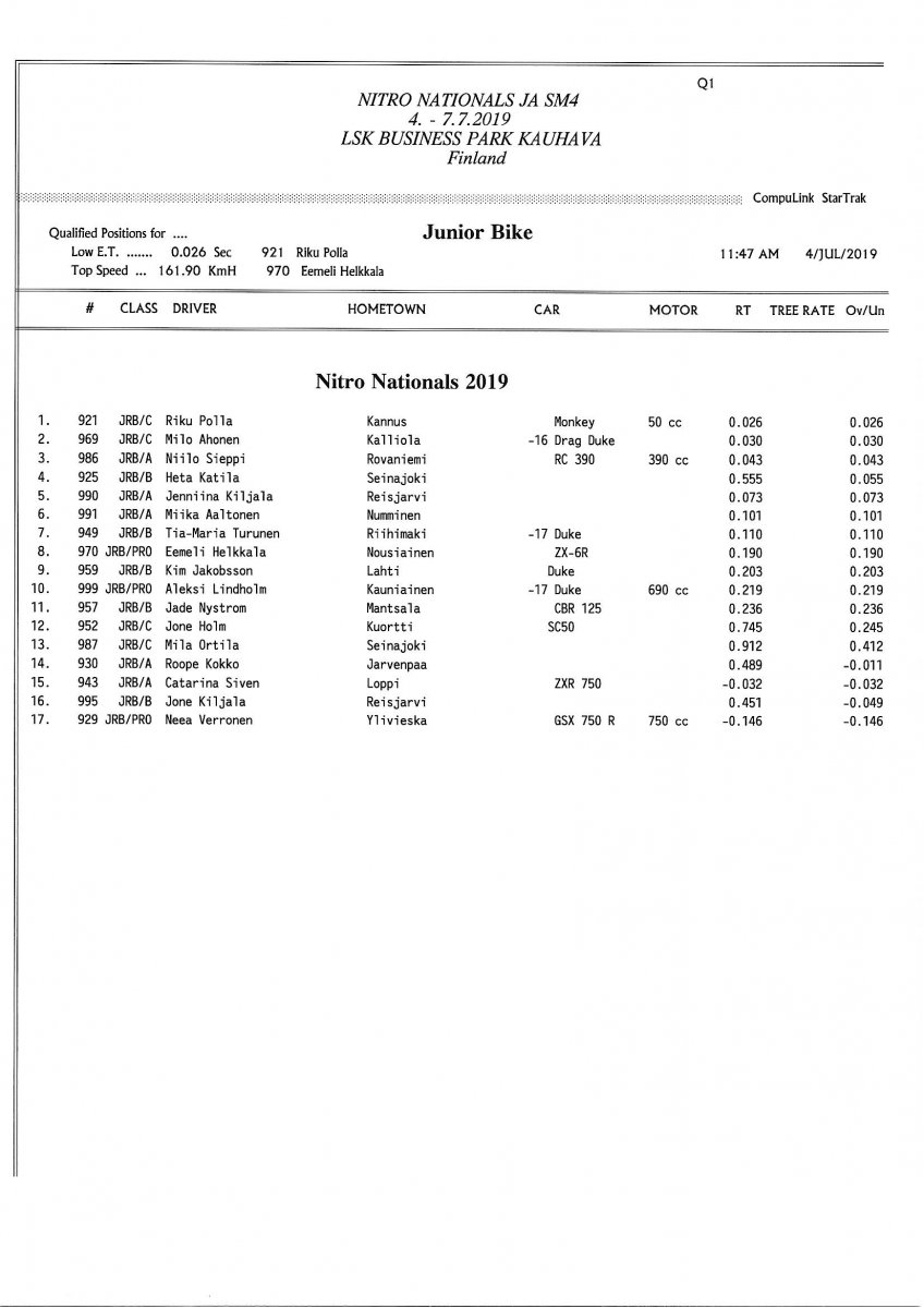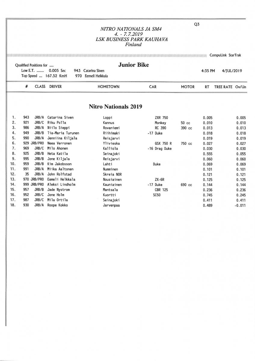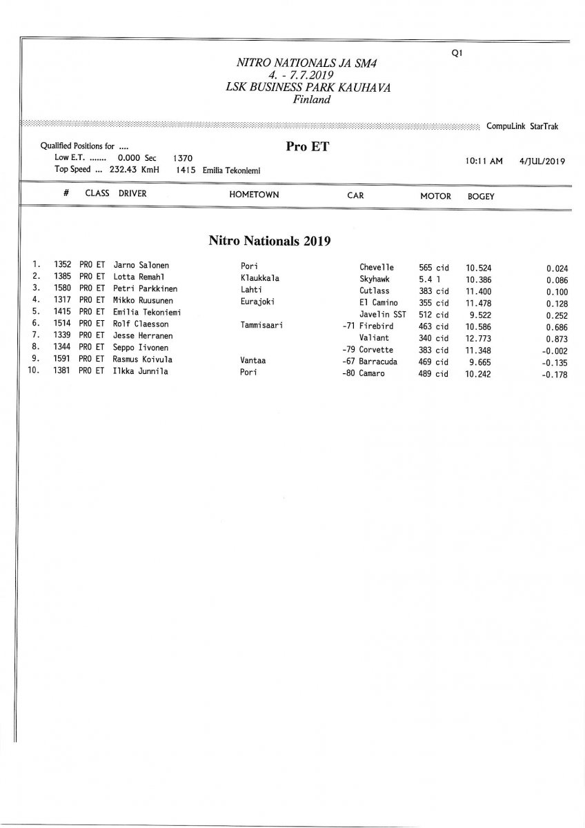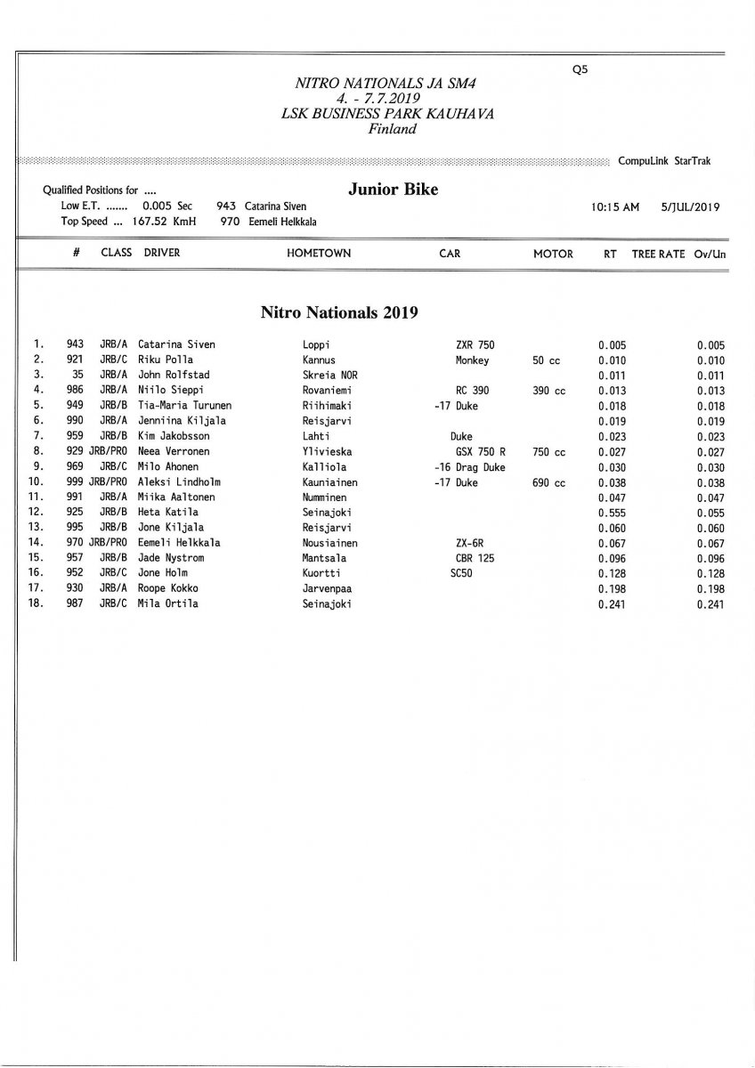 Invitation for FIA-, FIM-E -, EDRS Pro-, EDRS-classes 2019 Updated. Posted on 24.5.2019 in Drag Racing, Nitro Nationals, Tapahtumat The Invitation is online and updated. The entrance for the FIA-, FIM-E -, EDRS -, EDRS Pro-classes and EDRS Pro MC for the FIA European Drag Racing Championship event Nitro Nationals on July 4th – July 7th 2019 at new track at LSK Business Park, Loppusuora 22 (Sotakouluntie), 62200 Kauhava, Finland is available on dragracing.eu. Please read the invitation below or on dragracing.eu. The last entrance date is 21st of June. Late entry may be accepted after this date but no later than June 28th 2019. If accepted, an extra fee will be charged. Entry Fees for Pro MC has been updated. Kutsu FIA -, FIM-E -, EDRS -, EDRS Pro – Ja EDRS Pro MC-ryhmille on nyt linjoilla ja ilmoittautuminen on nyt mahdollista dragracing.eu-palvelussa FHRA Nitro Nationals European Drag Racing Championship tapahtumaan 4.-7.7.2019, joka ajetaan uudella radalla LSK Business Parkissa. Olkaa hyvä ja lukekaa koko kutsu tästä alta tai dragracing.eu-palvelusta. Viimeinen ilmoittautumispäivä on 21.6.2018. Ilmoittautumisia otetaan vastaan vielä 28.6. asti, mutta hintaan lisätään jälki-ilmoittautumismaksu. Kilpailumaksuja on päivitetty Pro-prätkien osalta. INVITATION & SUPPLEMENTARY REGULATIONS NitroNationals_2019