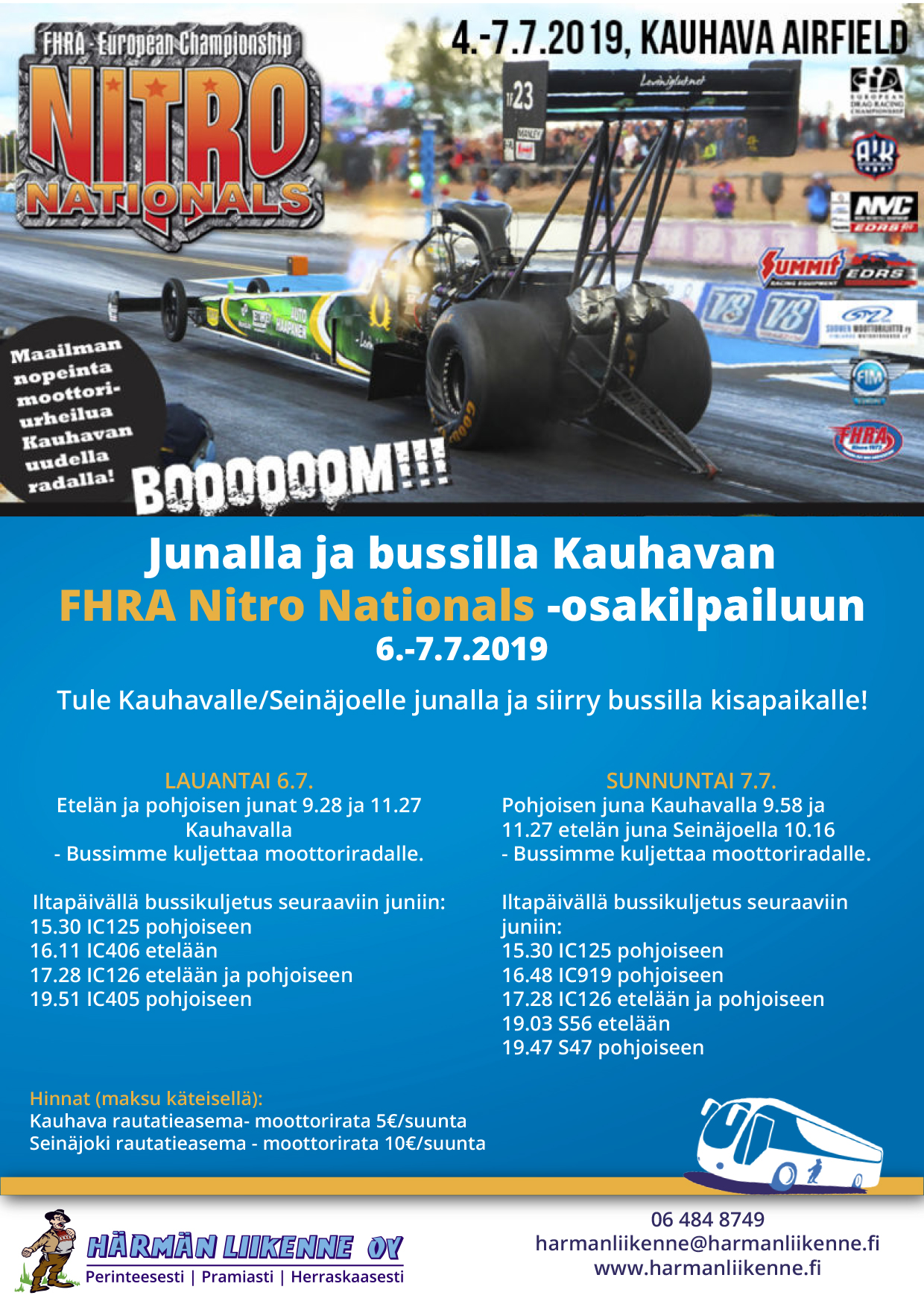 Junalla ja bussilla Kauhavalle FHRA Nitro Nationals 2019 -kisaan. Tule Kauhavalle tai Seinäjoelle junalle ja siirry bussilla kisapaikalle. Härmän Liikenne Oy kuljettaa. Hinnat: Kauhavan rautatie – Kauhavan kiihdytysrata 5€/suunta tai Seinäjoen rautatieasema – Kauhavan kiihdytysrata 10 €/suunta #FHRAtapahtumat #FHRA #FHRAry #FHRAdragrace #kiihdytysajo #dragracing #dragrace#Blaklader #V8Magazine #tiketti #Rollyhtiot #FIA #FIM #EDRS #EDRSpro #EDRSProMC#europeanchampionship #kauhava #visitkauhava #lskbusinesspark #härmänliikenne