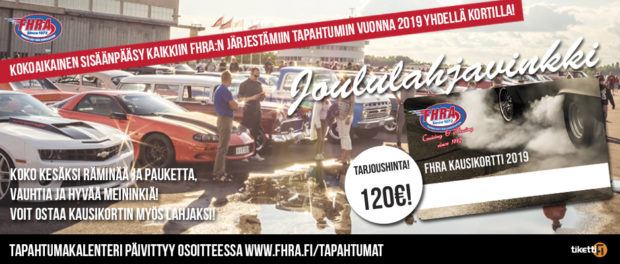 FHRA Kausikortti 2019. Posted on 19.11.2018 in Tapahtumat FHRA järjestää vuosittain melkein kaksikymmentä tapahtumaa. Vuoden suurin tapahtuma on pääsiäisenä järjestettävä American Car Show, joka kerää Helsingin Messukeskukseen kymmentuhatpäisen yleisön. Kiihdytysajon SM-sarja, Nitro Nationals 2019 ja lukuisat katutapahtumat kuuluvat jokaisen moottoripään kesärientoihin. Vuonna 2019 on taas luvassa paljon tapahtumia, joten hanki kausikorttisi nyt. Ostaessasi kausikortin Tiketin kautta voit käyttää sen hankinnassa myös kulttuurimaksuvälineitä. Käytä kulttuurietusi siis tulevan kauden kaikkien tapahtumien maksuun. FHRA kausikortti 2019 käsittää kokoaikaisen sisäänpääsyn kaikkiin FHRA:n järjestämiin tapahtumiin kaudelle 2019. Kausikortti on maksanut itsensä jo muutamalla tapahtumalla takaisin ja on tosikävijälle ihan ehdoton. FHRA kausikortti on myös oiva lahjaidea moottoriurheilusta kiinnostuneelle ja kaikille autoharrastajalle. Tapahtumakalenteri päivittyy FHRA:n verkkosivuilla. Kausikortit vuodelle 2019 myy Tiketti.