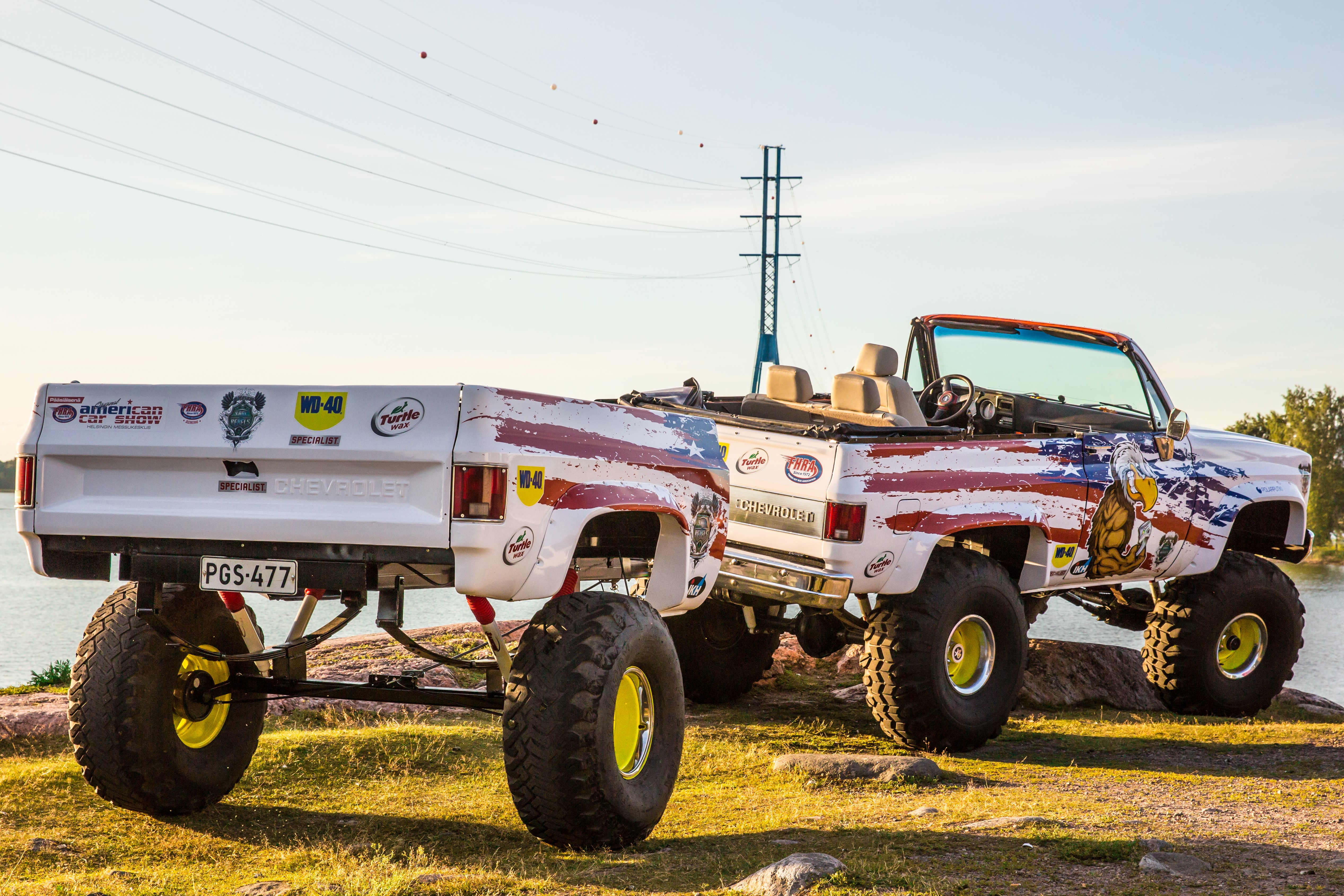 Näyttelyn todellisiin erikoisuuksiin kuuluu kuvassa oleva Suomen korkein auto ja taatusti Suomen korkein Chevrolet Blazer, joka on teipattu American Car Show’n logoilla.