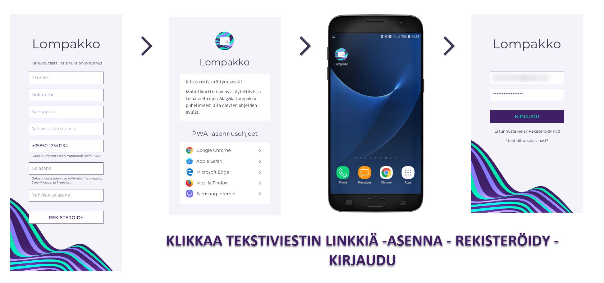 Klikkaa viestissä tullutta linkkiä. Jos sinulla ei vielä ole MagMa Lompakkoa asennettuna puheliimeesi, saat ohjeen miten se lisätään aloitusnäytölle.