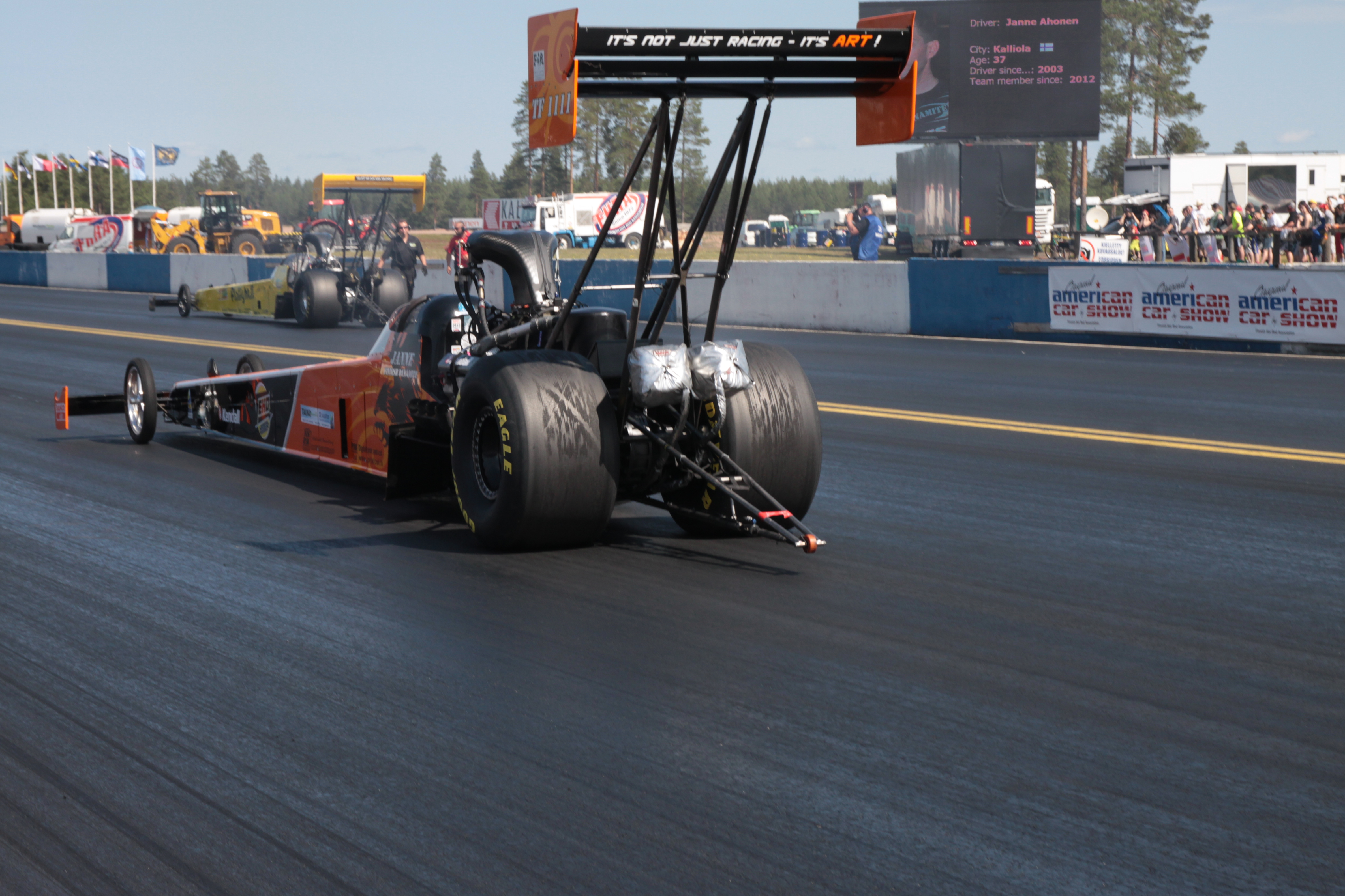 VAROITUS! Top Fuel Dragster-ajonäytöksen aikana hetkellinen kova meteli saattaa aiheuttaa häiriötä lähinaapurustossa!